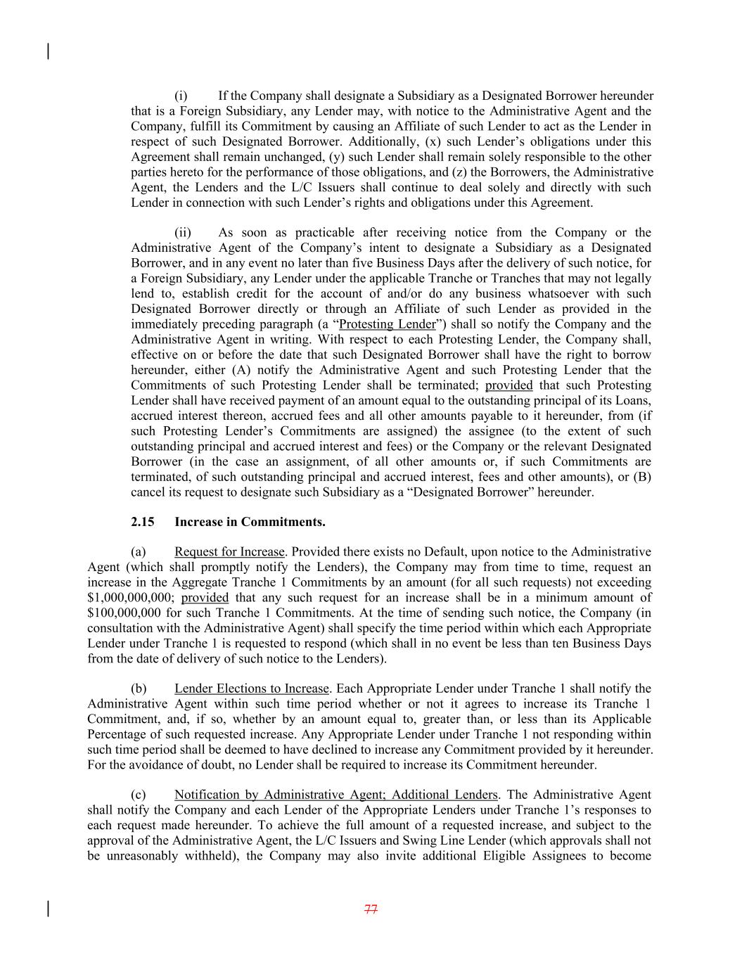 (i) If the Company shall designate a Subsidiary as a Designated Borrower hereunder that is a Foreign Subsidiary, any Lender may, with notice to the Administrative Agent and the Company, fulfill its Commitment by causing an Affiliate of such Lender to act as the Lender in respect of such Designated Borrower. Additionally, (x) such Lender’s obligations under this Agreement shall remain unchanged, (y) such Lender shall remain solely responsible to the other parties hereto for the performance of those obligations, and (z) the Borrowers, the Administrative Agent, the Lenders and the L/C Issuers shall continue to deal solely and directly with such Lender in connection with such Lender’s rights and obligations under this Agreement. (ii) As soon as practicable after receiving notice from the Company or the Administrative Agent of the Company’s intent to designate a Subsidiary as a Designated Borrower, and in any event no later than five Business Days after the delivery of such notice, for a Foreign Subsidiary, any Lender under the applicable Tranche or Tranches that may not legally lend to, establish credit for the account of and/or do any business whatsoever with such Designated Borrower directly or through an Affiliate of such Lender as provided in the immediately preceding paragraph (a “Protesting Lender”) shall so notify the Company and the Administrative Agent in writing. With respect to each Protesting Lender, the Company shall, effective on or before the date that such Designated Borrower shall have the right to borrow hereunder, either (A) notify the Administrative Agent and such Protesting Lender that the Commitments of such Protesting Lender shall be terminated; provided that such Protesting Lender shall have received payment of an amount equal to the outstanding principal of its Loans, accrued interest thereon, accrued fees and all other amounts payable to it hereunder, from (if such Protesting Lender’s Commitments are assigned) the assignee (to the extent of such outstanding principal and accrued interest and fees) or the Company or the relevant Designated Borrower (in the case an assignment, of all other amounts or, if such Commitments are terminated, of such outstanding principal and accrued interest, fees and other amounts), or (B) cancel its request to designate such Subsidiary as a “Designated Borrower” hereunder. 2.15 Increase in Commitments. (a) Request for Increase. Provided there exists no Default, upon notice to the Administrative Agent (which shall promptly notify the Lenders), the Company may from time to time, request an increase in the Aggregate Tranche 1 Commitments by an amount (for all such requests) not exceeding $1,000,000,000; provided that any such request for an increase shall be in a minimum amount of $100,000,000 for such Tranche 1 Commitments. At the time of sending such notice, the Company (in consultation with the Administrative Agent) shall specify the time period within which each Appropriate Lender under Tranche 1 is requested to respond (which shall in no event be less than ten Business Days from the date of delivery of such notice to the Lenders). (b) Lender Elections to Increase. Each Appropriate Lender under Tranche 1 shall notify the Administrative Agent within such time period whether or not it agrees to increase its Tranche 1 Commitment, and, if so, whether by an amount equal to, greater than, or less than its Applicable Percentage of such requested increase. Any Appropriate Lender under Tranche 1 not responding within such time period shall be deemed to have declined to increase any Commitment provided by it hereunder. For the avoidance of doubt, no Lender shall be required to increase its Commitment hereunder. (c) Notification by Administrative Agent; Additional Lenders. The Administrative Agent shall notify the Company and each Lender of the Appropriate Lenders under Tranche 1’s responses to each request made hereunder. To achieve the full amount of a requested increase, and subject to the approval of the Administrative Agent, the L/C Issuers and Swing Line Lender (which approvals shall not be unreasonably withheld), the Company may also invite additional Eligible Assignees to become 77