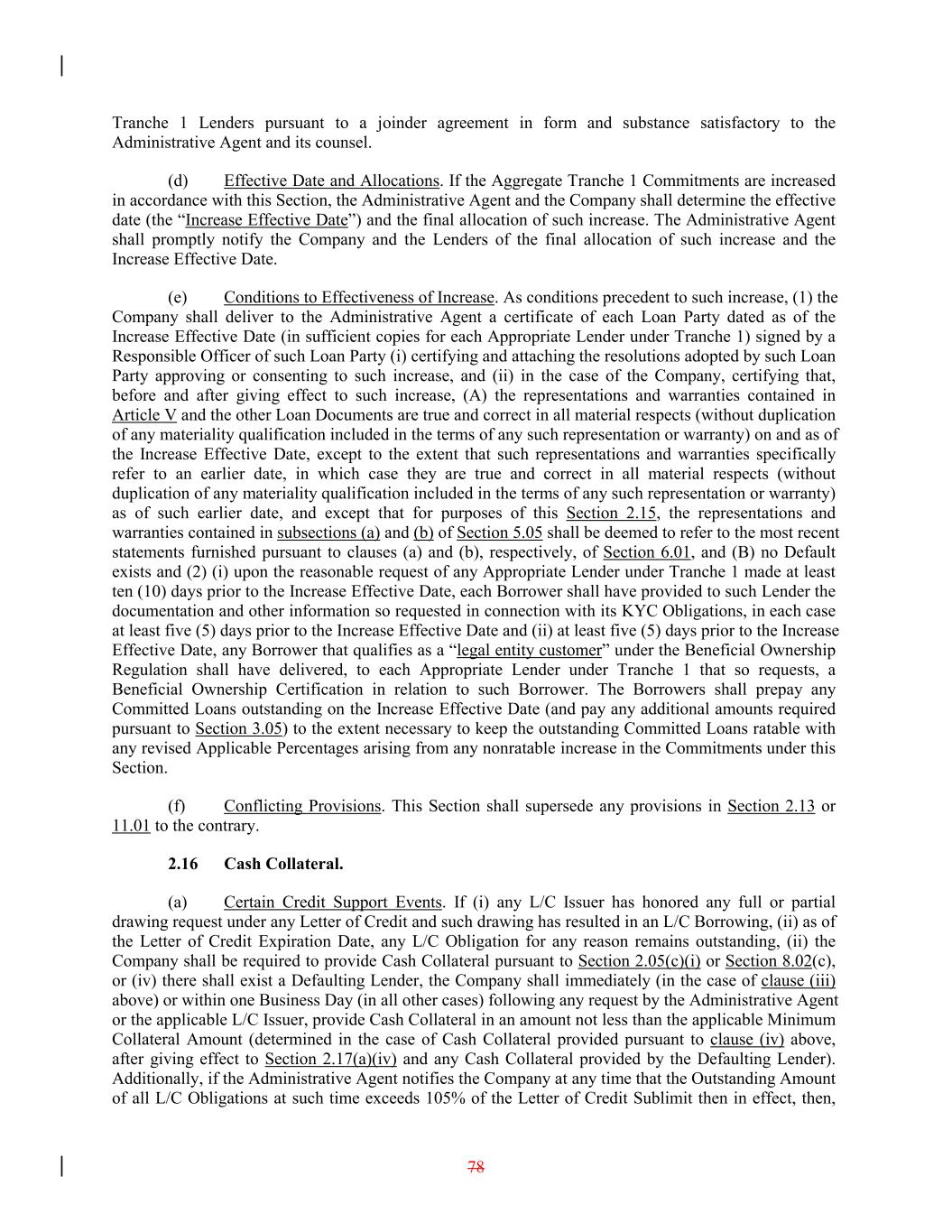 Tranche 1 Lenders pursuant to a joinder agreement in form and substance satisfactory to the Administrative Agent and its counsel. (d) Effective Date and Allocations. If the Aggregate Tranche 1 Commitments are increased in accordance with this Section, the Administrative Agent and the Company shall determine the effective date (the “Increase Effective Date”) and the final allocation of such increase. The Administrative Agent shall promptly notify the Company and the Lenders of the final allocation of such increase and the Increase Effective Date. (e) Conditions to Effectiveness of Increase. As conditions precedent to such increase, (1) the Company shall deliver to the Administrative Agent a certificate of each Loan Party dated as of the Increase Effective Date (in sufficient copies for each Appropriate Lender under Tranche 1) signed by a Responsible Officer of such Loan Party (i) certifying and attaching the resolutions adopted by such Loan Party approving or consenting to such increase, and (ii) in the case of the Company, certifying that, before and after giving effect to such increase, (A) the representations and warranties contained in Article V and the other Loan Documents are true and correct in all material respects (without duplication of any materiality qualification included in the terms of any such representation or warranty) on and as of the Increase Effective Date, except to the extent that such representations and warranties specifically refer to an earlier date, in which case they are true and correct in all material respects (without duplication of any materiality qualification included in the terms of any such representation or warranty) as of such earlier date, and except that for purposes of this Section 2.15, the representations and warranties contained in subsections (a) and (b) of Section 5.05 shall be deemed to refer to the most recent statements furnished pursuant to clauses (a) and (b), respectively, of Section 6.01, and (B) no Default exists and (2) (i) upon the reasonable request of any Appropriate Lender under Tranche 1 made at least ten (10) days prior to the Increase Effective Date, each Borrower shall have provided to such Lender the documentation and other information so requested in connection with its KYC Obligations, in each case at least five (5) days prior to the Increase Effective Date and (ii) at least five (5) days prior to the Increase Effective Date, any Borrower that qualifies as a “legal entity customer” under the Beneficial Ownership Regulation shall have delivered, to each Appropriate Lender under Tranche 1 that so requests, a Beneficial Ownership Certification in relation to such Borrower. The Borrowers shall prepay any Committed Loans outstanding on the Increase Effective Date (and pay any additional amounts required pursuant to Section 3.05) to the extent necessary to keep the outstanding Committed Loans ratable with any revised Applicable Percentages arising from any nonratable increase in the Commitments under this Section. (f) Conflicting Provisions. This Section shall supersede any provisions in Section 2.13 or 11.01 to the contrary. 2.16 Cash Collateral. (a) Certain Credit Support Events. If (i) any L/C Issuer has honored any full or partial drawing request under any Letter of Credit and such drawing has resulted in an L/C Borrowing, (ii) as of the Letter of Credit Expiration Date, any L/C Obligation for any reason remains outstanding, (ii) the Company shall be required to provide Cash Collateral pursuant to Section 2.05(c)(i) or Section 8.02(c), or (iv) there shall exist a Defaulting Lender, the Company shall immediately (in the case of clause (iii) above) or within one Business Day (in all other cases) following any request by the Administrative Agent or the applicable L/C Issuer, provide Cash Collateral in an amount not less than the applicable Minimum Collateral Amount (determined in the case of Cash Collateral provided pursuant to clause (iv) above, after giving effect to Section 2.17(a)(iv) and any Cash Collateral provided by the Defaulting Lender). Additionally, if the Administrative Agent notifies the Company at any time that the Outstanding Amount of all L/C Obligations at such time exceeds 105% of the Letter of Credit Sublimit then in effect, then, 78