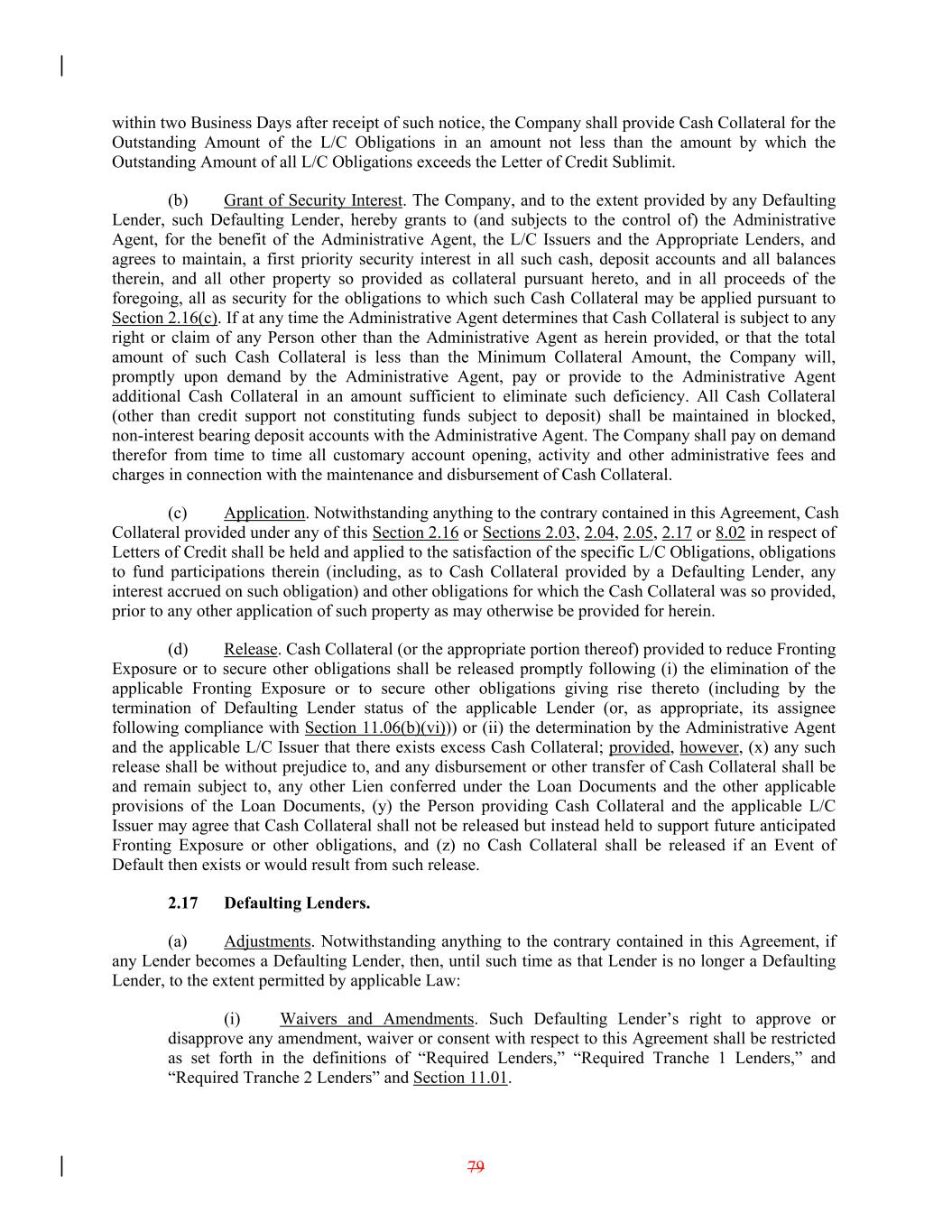 within two Business Days after receipt of such notice, the Company shall provide Cash Collateral for the Outstanding Amount of the L/C Obligations in an amount not less than the amount by which the Outstanding Amount of all L/C Obligations exceeds the Letter of Credit Sublimit. (b) Grant of Security Interest. The Company, and to the extent provided by any Defaulting Lender, such Defaulting Lender, hereby grants to (and subjects to the control of) the Administrative Agent, for the benefit of the Administrative Agent, the L/C Issuers and the Appropriate Lenders, and agrees to maintain, a first priority security interest in all such cash, deposit accounts and all balances therein, and all other property so provided as collateral pursuant hereto, and in all proceeds of the foregoing, all as security for the obligations to which such Cash Collateral may be applied pursuant to Section 2.16(c). If at any time the Administrative Agent determines that Cash Collateral is subject to any right or claim of any Person other than the Administrative Agent as herein provided, or that the total amount of such Cash Collateral is less than the Minimum Collateral Amount, the Company will, promptly upon demand by the Administrative Agent, pay or provide to the Administrative Agent additional Cash Collateral in an amount sufficient to eliminate such deficiency. All Cash Collateral (other than credit support not constituting funds subject to deposit) shall be maintained in blocked, non-interest bearing deposit accounts with the Administrative Agent. The Company shall pay on demand therefor from time to time all customary account opening, activity and other administrative fees and charges in connection with the maintenance and disbursement of Cash Collateral. (c) Application. Notwithstanding anything to the contrary contained in this Agreement, Cash Collateral provided under any of this Section 2.16 or Sections 2.03, 2.04, 2.05, 2.17 or 8.02 in respect of Letters of Credit shall be held and applied to the satisfaction of the specific L/C Obligations, obligations to fund participations therein (including, as to Cash Collateral provided by a Defaulting Lender, any interest accrued on such obligation) and other obligations for which the Cash Collateral was so provided, prior to any other application of such property as may otherwise be provided for herein. (d) Release. Cash Collateral (or the appropriate portion thereof) provided to reduce Fronting Exposure or to secure other obligations shall be released promptly following (i) the elimination of the applicable Fronting Exposure or to secure other obligations giving rise thereto (including by the termination of Defaulting Lender status of the applicable Lender (or, as appropriate, its assignee following compliance with Section 11.06(b)(vi))) or (ii) the determination by the Administrative Agent and the applicable L/C Issuer that there exists excess Cash Collateral; provided, however, (x) any such release shall be without prejudice to, and any disbursement or other transfer of Cash Collateral shall be and remain subject to, any other Lien conferred under the Loan Documents and the other applicable provisions of the Loan Documents, (y) the Person providing Cash Collateral and the applicable L/C Issuer may agree that Cash Collateral shall not be released but instead held to support future anticipated Fronting Exposure or other obligations, and (z) no Cash Collateral shall be released if an Event of Default then exists or would result from such release. 2.17 Defaulting Lenders. (a) Adjustments. Notwithstanding anything to the contrary contained in this Agreement, if any Lender becomes a Defaulting Lender, then, until such time as that Lender is no longer a Defaulting Lender, to the extent permitted by applicable Law: (i) Waivers and Amendments. Such Defaulting Lender’s right to approve or disapprove any amendment, waiver or consent with respect to this Agreement shall be restricted as set forth in the definitions of “Required Lenders,” “Required Tranche 1 Lenders,” and “Required Tranche 2 Lenders” and Section 11.01. 79