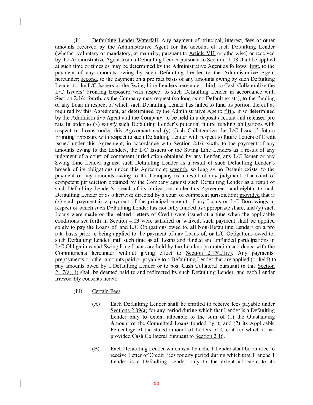 (ii) Defaulting Lender Waterfall. Any payment of principal, interest, fees or other amounts received by the Administrative Agent for the account of such Defaulting Lender (whether voluntary or mandatory, at maturity, pursuant to Article VIII or otherwise) or received by the Administrative Agent from a Defaulting Lender pursuant to Section 11.08 shall be applied at such time or times as may be determined by the Administrative Agent as follows: first, to the payment of any amounts owing by such Defaulting Lender to the Administrative Agent hereunder; second, to the payment on a pro rata basis of any amounts owing by such Defaulting Lender to the L/C Issuers or the Swing Line Lenders hereunder; third, to Cash Collateralize the L/C Issuers’ Fronting Exposure with respect to such Defaulting Lender in accordance with Section 2.16; fourth, as the Company may request (so long as no Default exists), to the funding of any Loan in respect of which such Defaulting Lender has failed to fund its portion thereof as required by this Agreement, as determined by the Administrative Agent; fifth, if so determined by the Administrative Agent and the Company, to be held in a deposit account and released pro rata in order to (x) satisfy such Defaulting Lender’s potential future funding obligations with respect to Loans under this Agreement and (y) Cash Collateralize the L/C Issuers’ future Fronting Exposure with respect to such Defaulting Lender with respect to future Letters of Credit issued under this Agreement, in accordance with Section 2.16; sixth, to the payment of any amounts owing to the Lenders, the L/C Issuers or the Swing Line Lenders as a result of any judgment of a court of competent jurisdiction obtained by any Lender, any L/C Issuer or any Swing Line Lender against such Defaulting Lender as a result of such Defaulting Lender’s breach of its obligations under this Agreement; seventh, so long as no Default exists, to the payment of any amounts owing to the Company as a result of any judgment of a court of competent jurisdiction obtained by the Company against such Defaulting Lender as a result of such Defaulting Lender’s breach of its obligations under this Agreement; and eighth, to such Defaulting Lender or as otherwise directed by a court of competent jurisdiction; provided that if (x) such payment is a payment of the principal amount of any Loans or L/C Borrowings in respect of which such Defaulting Lender has not fully funded its appropriate share, and (y) such Loans were made or the related Letters of Credit were issued at a time when the applicable conditions set forth in Section 4.03 were satisfied or waived, such payment shall be applied solely to pay the Loans of, and L/C Obligations owed to, all Non-Defaulting Lenders on a pro rata basis prior to being applied to the payment of any Loans of, or L/C Obligations owed to, such Defaulting Lender until such time as all Loans and funded and unfunded participations in L/C Obligations and Swing Line Loans are held by the Lenders pro rata in accordance with the Commitments hereunder without giving effect to Section 2.17(a)(iv). Any payments, prepayments or other amounts paid or payable to a Defaulting Lender that are applied (or held) to pay amounts owed by a Defaulting Lender or to post Cash Collateral pursuant to this Section 2.17(a)(ii) shall be deemed paid to and redirected by such Defaulting Lender, and each Lender irrevocably consents hereto. (iii) Certain Fees. (A) Each Defaulting Lender shall be entitled to receive fees payable under Sections 2.09(a) for any period during which that Lender is a Defaulting Lender only to extent allocable to the sum of (1) the Outstanding Amount of the Committed Loans funded by it, and (2) its Applicable Percentage of the stated amount of Letters of Credit for which it has provided Cash Collateral pursuant to Section 2.16. (B) Each Defaulting Lender which is a Tranche 1 Lender shall be entitled to receive Letter of Credit Fees for any period during which that Tranche 1 Lender is a Defaulting Lender only to the extent allocable to its 80