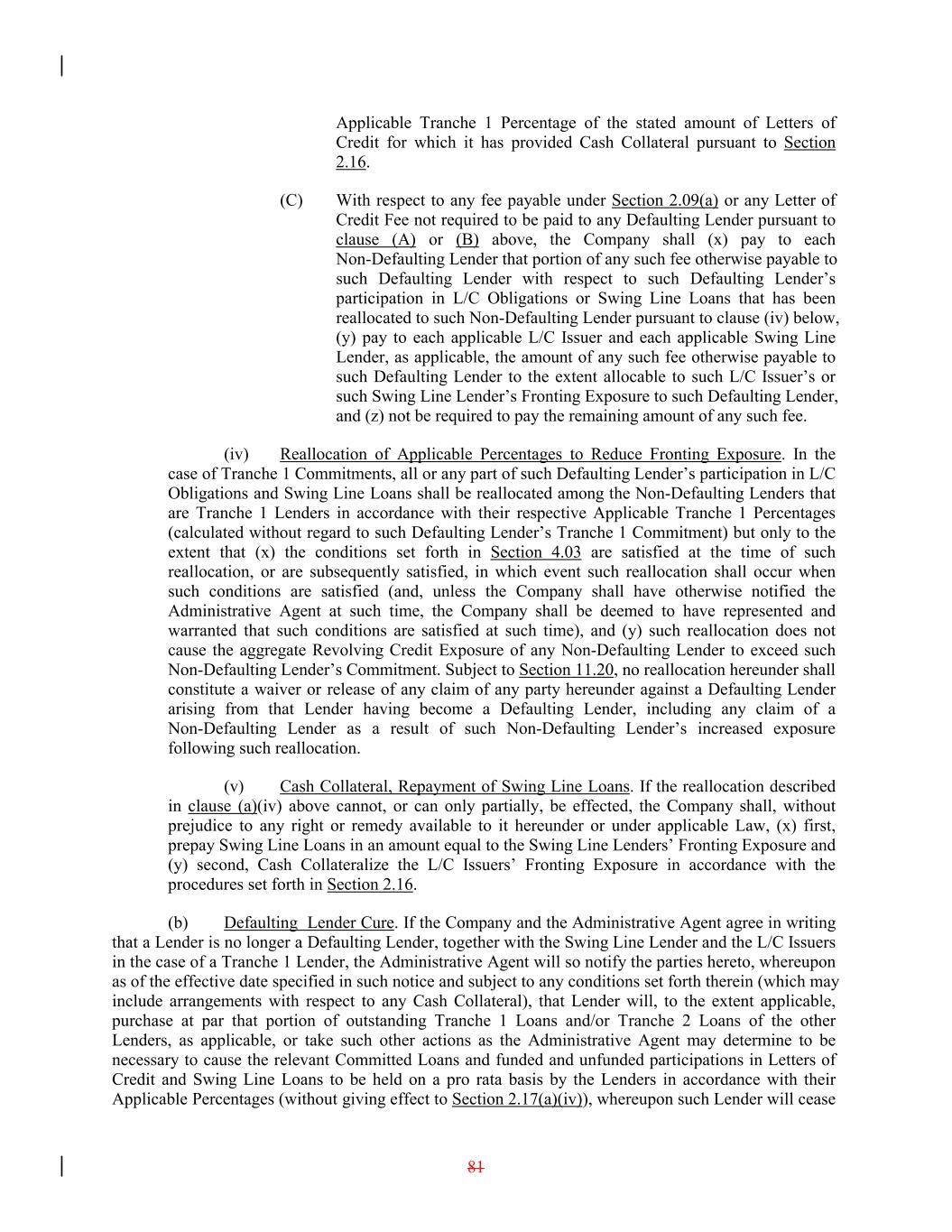 Applicable Tranche 1 Percentage of the stated amount of Letters of Credit for which it has provided Cash Collateral pursuant to Section 2.16. (C) With respect to any fee payable under Section 2.09(a) or any Letter of Credit Fee not required to be paid to any Defaulting Lender pursuant to clause (A) or (B) above, the Company shall (x) pay to each Non-Defaulting Lender that portion of any such fee otherwise payable to such Defaulting Lender with respect to such Defaulting Lender’s participation in L/C Obligations or Swing Line Loans that has been reallocated to such Non-Defaulting Lender pursuant to clause (iv) below, (y) pay to each applicable L/C Issuer and each applicable Swing Line Lender, as applicable, the amount of any such fee otherwise payable to such Defaulting Lender to the extent allocable to such L/C Issuer’s or such Swing Line Lender’s Fronting Exposure to such Defaulting Lender, and (z) not be required to pay the remaining amount of any such fee. (iv) Reallocation of Applicable Percentages to Reduce Fronting Exposure. In the case of Tranche 1 Commitments, all or any part of such Defaulting Lender’s participation in L/C Obligations and Swing Line Loans shall be reallocated among the Non-Defaulting Lenders that are Tranche 1 Lenders in accordance with their respective Applicable Tranche 1 Percentages (calculated without regard to such Defaulting Lender’s Tranche 1 Commitment) but only to the extent that (x) the conditions set forth in Section 4.03 are satisfied at the time of such reallocation, or are subsequently satisfied, in which event such reallocation shall occur when such conditions are satisfied (and, unless the Company shall have otherwise notified the Administrative Agent at such time, the Company shall be deemed to have represented and warranted that such conditions are satisfied at such time), and (y) such reallocation does not cause the aggregate Revolving Credit Exposure of any Non-Defaulting Lender to exceed such Non-Defaulting Lender’s Commitment. Subject to Section 11.20, no reallocation hereunder shall constitute a waiver or release of any claim of any party hereunder against a Defaulting Lender arising from that Lender having become a Defaulting Lender, including any claim of a Non-Defaulting Lender as a result of such Non-Defaulting Lender’s increased exposure following such reallocation. (v) Cash Collateral, Repayment of Swing Line Loans. If the reallocation described in clause (a)(iv) above cannot, or can only partially, be effected, the Company shall, without prejudice to any right or remedy available to it hereunder or under applicable Law, (x) first, prepay Swing Line Loans in an amount equal to the Swing Line Lenders’ Fronting Exposure and (y) second, Cash Collateralize the L/C Issuers’ Fronting Exposure in accordance with the procedures set forth in Section 2.16. (b) Defaulting Lender Cure. If the Company and the Administrative Agent agree in writing that a Lender is no longer a Defaulting Lender, together with the Swing Line Lender and the L/C Issuers in the case of a Tranche 1 Lender, the Administrative Agent will so notify the parties hereto, whereupon as of the effective date specified in such notice and subject to any conditions set forth therein (which may include arrangements with respect to any Cash Collateral), that Lender will, to the extent applicable, purchase at par that portion of outstanding Tranche 1 Loans and/or Tranche 2 Loans of the other Lenders, as applicable, or take such other actions as the Administrative Agent may determine to be necessary to cause the relevant Committed Loans and funded and unfunded participations in Letters of Credit and Swing Line Loans to be held on a pro rata basis by the Lenders in accordance with their Applicable Percentages (without giving effect to Section 2.17(a)(iv)), whereupon such Lender will cease 81