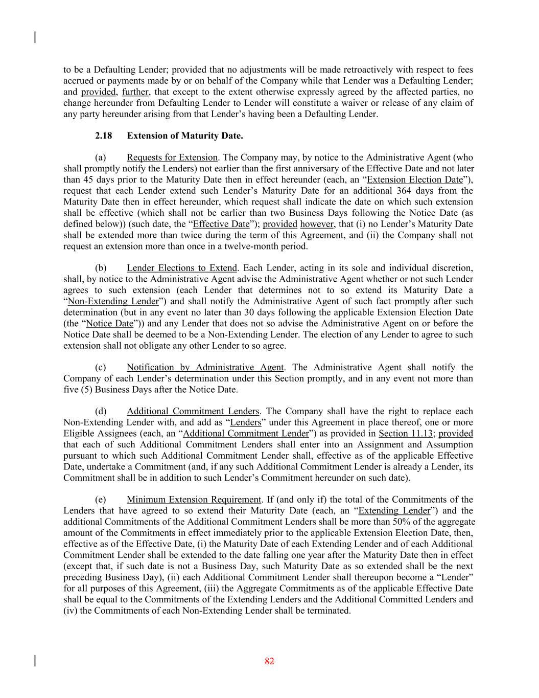 to be a Defaulting Lender; provided that no adjustments will be made retroactively with respect to fees accrued or payments made by or on behalf of the Company while that Lender was a Defaulting Lender; and provided, further, that except to the extent otherwise expressly agreed by the affected parties, no change hereunder from Defaulting Lender to Lender will constitute a waiver or release of any claim of any party hereunder arising from that Lender’s having been a Defaulting Lender. 2.18 Extension of Maturity Date. (a) Requests for Extension. The Company may, by notice to the Administrative Agent (who shall promptly notify the Lenders) not earlier than the first anniversary of the Effective Date and not later than 45 days prior to the Maturity Date then in effect hereunder (each, an “Extension Election Date”), request that each Lender extend such Lender’s Maturity Date for an additional 364 days from the Maturity Date then in effect hereunder, which request shall indicate the date on which such extension shall be effective (which shall not be earlier than two Business Days following the Notice Date (as defined below)) (such date, the “Effective Date”); provided however, that (i) no Lender’s Maturity Date shall be extended more than twice during the term of this Agreement, and (ii) the Company shall not request an extension more than once in a twelve-month period. (b) Lender Elections to Extend. Each Lender, acting in its sole and individual discretion, shall, by notice to the Administrative Agent advise the Administrative Agent whether or not such Lender agrees to such extension (each Lender that determines not to so extend its Maturity Date a “Non-Extending Lender”) and shall notify the Administrative Agent of such fact promptly after such determination (but in any event no later than 30 days following the applicable Extension Election Date (the “Notice Date”)) and any Lender that does not so advise the Administrative Agent on or before the Notice Date shall be deemed to be a Non-Extending Lender. The election of any Lender to agree to such extension shall not obligate any other Lender to so agree. (c) Notification by Administrative Agent. The Administrative Agent shall notify the Company of each Lender’s determination under this Section promptly, and in any event not more than five (5) Business Days after the Notice Date. (d) Additional Commitment Lenders. The Company shall have the right to replace each Non-Extending Lender with, and add as “Lenders” under this Agreement in place thereof, one or more Eligible Assignees (each, an “Additional Commitment Lender”) as provided in Section 11.13; provided that each of such Additional Commitment Lenders shall enter into an Assignment and Assumption pursuant to which such Additional Commitment Lender shall, effective as of the applicable Effective Date, undertake a Commitment (and, if any such Additional Commitment Lender is already a Lender, its Commitment shall be in addition to such Lender’s Commitment hereunder on such date). (e) Minimum Extension Requirement. If (and only if) the total of the Commitments of the Lenders that have agreed to so extend their Maturity Date (each, an “Extending Lender”) and the additional Commitments of the Additional Commitment Lenders shall be more than 50% of the aggregate amount of the Commitments in effect immediately prior to the applicable Extension Election Date, then, effective as of the Effective Date, (i) the Maturity Date of each Extending Lender and of each Additional Commitment Lender shall be extended to the date falling one year after the Maturity Date then in effect (except that, if such date is not a Business Day, such Maturity Date as so extended shall be the next preceding Business Day), (ii) each Additional Commitment Lender shall thereupon become a “Lender” for all purposes of this Agreement, (iii) the Aggregate Commitments as of the applicable Effective Date shall be equal to the Commitments of the Extending Lenders and the Additional Committed Lenders and (iv) the Commitments of each Non-Extending Lender shall be terminated. 82