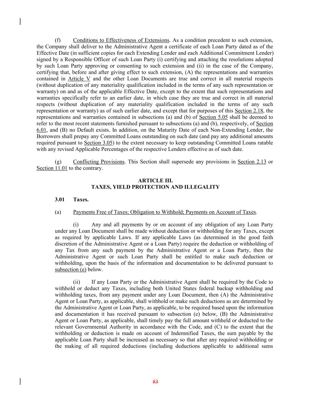 (f) Conditions to Effectiveness of Extensions. As a condition precedent to such extension, the Company shall deliver to the Administrative Agent a certificate of each Loan Party dated as of the Effective Date (in sufficient copies for each Extending Lender and each Additional Commitment Lender) signed by a Responsible Officer of such Loan Party (i) certifying and attaching the resolutions adopted by such Loan Party approving or consenting to such extension and (ii) in the case of the Company, certifying that, before and after giving effect to such extension, (A) the representations and warranties contained in Article V and the other Loan Documents are true and correct in all material respects (without duplication of any materiality qualification included in the terms of any such representation or warranty) on and as of the applicable Effective Date, except to the extent that such representations and warranties specifically refer to an earlier date, in which case they are true and correct in all material respects (without duplication of any materiality qualification included in the terms of any such representation or warranty) as of such earlier date, and except that for purposes of this Section 2.18, the representations and warranties contained in subsections (a) and (b) of Section 5.05 shall be deemed to refer to the most recent statements furnished pursuant to subsections (a) and (b), respectively, of Section 6.01, and (B) no Default exists. In addition, on the Maturity Date of each Non-Extending Lender, the Borrowers shall prepay any Committed Loans outstanding on such date (and pay any additional amounts required pursuant to Section 3.05) to the extent necessary to keep outstanding Committed Loans ratable with any revised Applicable Percentages of the respective Lenders effective as of such date. (g) Conflicting Provisions. This Section shall supersede any provisions in Section 2.13 or Section 11.01 to the contrary. ARTICLE III. TAXES, YIELD PROTECTION AND ILLEGALITY 3.01 Taxes. (a) Payments Free of Taxes; Obligation to Withhold; Payments on Account of Taxes. (i) Any and all payments by or on account of any obligation of any Loan Party under any Loan Document shall be made without deduction or withholding for any Taxes, except as required by applicable Laws. If any applicable Laws (as determined in the good faith discretion of the Administrative Agent or a Loan Party) require the deduction or withholding of any Tax from any such payment by the Administrative Agent or a Loan Party, then the Administrative Agent or such Loan Party shall be entitled to make such deduction or withholding, upon the basis of the information and documentation to be delivered pursuant to subsection (e) below. (ii) If any Loan Party or the Administrative Agent shall be required by the Code to withhold or deduct any Taxes, including both United States federal backup withholding and withholding taxes, from any payment under any Loan Document, then (A) the Administrative Agent or Loan Party, as applicable, shall withhold or make such deductions as are determined by the Administrative Agent or Loan Party, as applicable, to be required based upon the information and documentation it has received pursuant to subsection (e) below, (B) the Administrative Agent or Loan Party, as applicable, shall timely pay the full amount withheld or deducted to the relevant Governmental Authority in accordance with the Code, and (C) to the extent that the withholding or deduction is made on account of Indemnified Taxes, the sum payable by the applicable Loan Party shall be increased as necessary so that after any required withholding or the making of all required deductions (including deductions applicable to additional sums 83