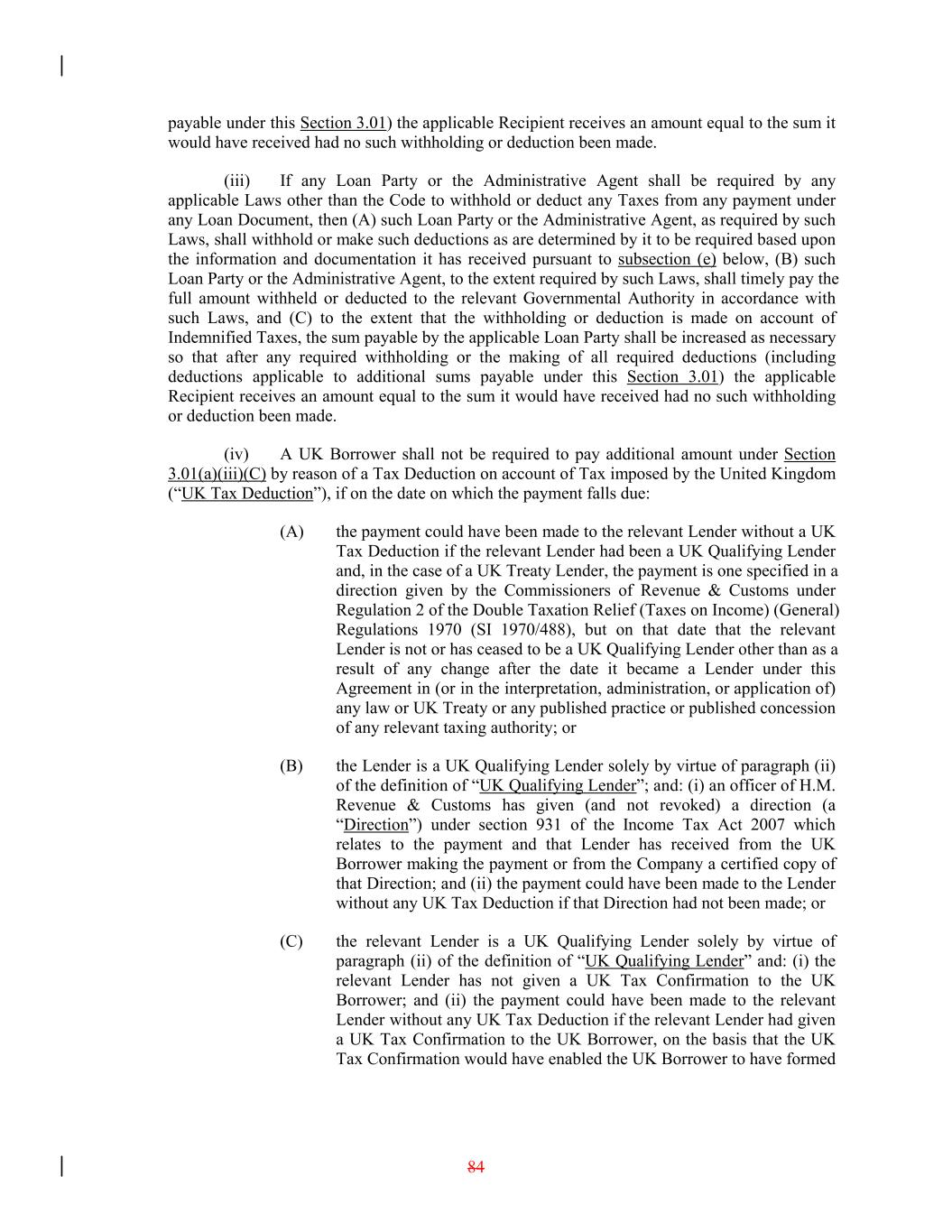 payable under this Section 3.01) the applicable Recipient receives an amount equal to the sum it would have received had no such withholding or deduction been made. (iii) If any Loan Party or the Administrative Agent shall be required by any applicable Laws other than the Code to withhold or deduct any Taxes from any payment under any Loan Document, then (A) such Loan Party or the Administrative Agent, as required by such Laws, shall withhold or make such deductions as are determined by it to be required based upon the information and documentation it has received pursuant to subsection (e) below, (B) such Loan Party or the Administrative Agent, to the extent required by such Laws, shall timely pay the full amount withheld or deducted to the relevant Governmental Authority in accordance with such Laws, and (C) to the extent that the withholding or deduction is made on account of Indemnified Taxes, the sum payable by the applicable Loan Party shall be increased as necessary so that after any required withholding or the making of all required deductions (including deductions applicable to additional sums payable under this Section 3.01) the applicable Recipient receives an amount equal to the sum it would have received had no such withholding or deduction been made. (iv) A UK Borrower shall not be required to pay additional amount under Section 3.01(a)(iii)(C) by reason of a Tax Deduction on account of Tax imposed by the United Kingdom (“UK Tax Deduction”), if on the date on which the payment falls due: (A) the payment could have been made to the relevant Lender without a UK Tax Deduction if the relevant Lender had been a UK Qualifying Lender and, in the case of a UK Treaty Lender, the payment is one specified in a direction given by the Commissioners of Revenue & Customs under Regulation 2 of the Double Taxation Relief (Taxes on Income) (General) Regulations 1970 (SI 1970/488), but on that date that the relevant Lender is not or has ceased to be a UK Qualifying Lender other than as a result of any change after the date it became a Lender under this Agreement in (or in the interpretation, administration, or application of) any law or UK Treaty or any published practice or published concession of any relevant taxing authority; or (B) the Lender is a UK Qualifying Lender solely by virtue of paragraph (ii) of the definition of “UK Qualifying Lender”; and: (i) an officer of H.M. Revenue & Customs has given (and not revoked) a direction (a “Direction”) under section 931 of the Income Tax Act 2007 which relates to the payment and that Lender has received from the UK Borrower making the payment or from the Company a certified copy of that Direction; and (ii) the payment could have been made to the Lender without any UK Tax Deduction if that Direction had not been made; or (C) the relevant Lender is a UK Qualifying Lender solely by virtue of paragraph (ii) of the definition of “UK Qualifying Lender” and: (i) the relevant Lender has not given a UK Tax Confirmation to the UK Borrower; and (ii) the payment could have been made to the relevant Lender without any UK Tax Deduction if the relevant Lender had given a UK Tax Confirmation to the UK Borrower, on the basis that the UK Tax Confirmation would have enabled the UK Borrower to have formed 84