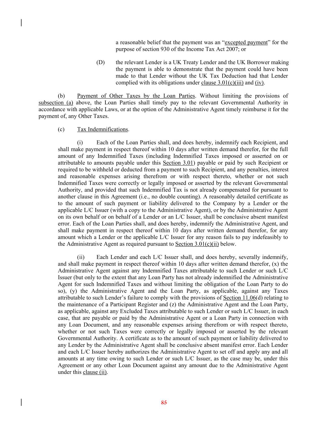 a reasonable belief that the payment was an “excepted payment” for the purpose of section 930 of the Income Tax Act 2007; or (D) the relevant Lender is a UK Treaty Lender and the UK Borrower making the payment is able to demonstrate that the payment could have been made to that Lender without the UK Tax Deduction had that Lender complied with its obligations under clause 3.01(c)(iii) and (iv). (b) Payment of Other Taxes by the Loan Parties. Without limiting the provisions of subsection (a) above, the Loan Parties shall timely pay to the relevant Governmental Authority in accordance with applicable Laws, or at the option of the Administrative Agent timely reimburse it for the payment of, any Other Taxes. (c) Tax Indemnifications. (i) Each of the Loan Parties shall, and does hereby, indemnify each Recipient, and shall make payment in respect thereof within 10 days after written demand therefor, for the full amount of any Indemnified Taxes (including Indemnified Taxes imposed or asserted on or attributable to amounts payable under this Section 3.01) payable or paid by such Recipient or required to be withheld or deducted from a payment to such Recipient, and any penalties, interest and reasonable expenses arising therefrom or with respect thereto, whether or not such Indemnified Taxes were correctly or legally imposed or asserted by the relevant Governmental Authority, and provided that such Indemnified Tax is not already compensated for pursuant to another clause in this Agreement (i.e., no double counting). A reasonably detailed certificate as to the amount of such payment or liability delivered to the Company by a Lender or the applicable L/C Issuer (with a copy to the Administrative Agent), or by the Administrative Agent on its own behalf or on behalf of a Lender or an L/C Issuer, shall be conclusive absent manifest error. Each of the Loan Parties shall, and does hereby, indemnify the Administrative Agent, and shall make payment in respect thereof within 10 days after written demand therefor, for any amount which a Lender or the applicable L/C Issuer for any reason fails to pay indefeasibly to the Administrative Agent as required pursuant to Section 3.01(c)(ii) below. (ii) Each Lender and each L/C Issuer shall, and does hereby, severally indemnify, and shall make payment in respect thereof within 10 days after written demand therefor, (x) the Administrative Agent against any Indemnified Taxes attributable to such Lender or such L/C Issuer (but only to the extent that any Loan Party has not already indemnified the Administrative Agent for such Indemnified Taxes and without limiting the obligation of the Loan Party to do so), (y) the Administrative Agent and the Loan Party, as applicable, against any Taxes attributable to such Lender’s failure to comply with the provisions of Section 11.06(d) relating to the maintenance of a Participant Register and (z) the Administrative Agent and the Loan Party, as applicable, against any Excluded Taxes attributable to such Lender or such L/C Issuer, in each case, that are payable or paid by the Administrative Agent or a Loan Party in connection with any Loan Document, and any reasonable expenses arising therefrom or with respect thereto, whether or not such Taxes were correctly or legally imposed or asserted by the relevant Governmental Authority. A certificate as to the amount of such payment or liability delivered to any Lender by the Administrative Agent shall be conclusive absent manifest error. Each Lender and each L/C Issuer hereby authorizes the Administrative Agent to set off and apply any and all amounts at any time owing to such Lender or such L/C Issuer, as the case may be, under this Agreement or any other Loan Document against any amount due to the Administrative Agent under this clause (ii). 85