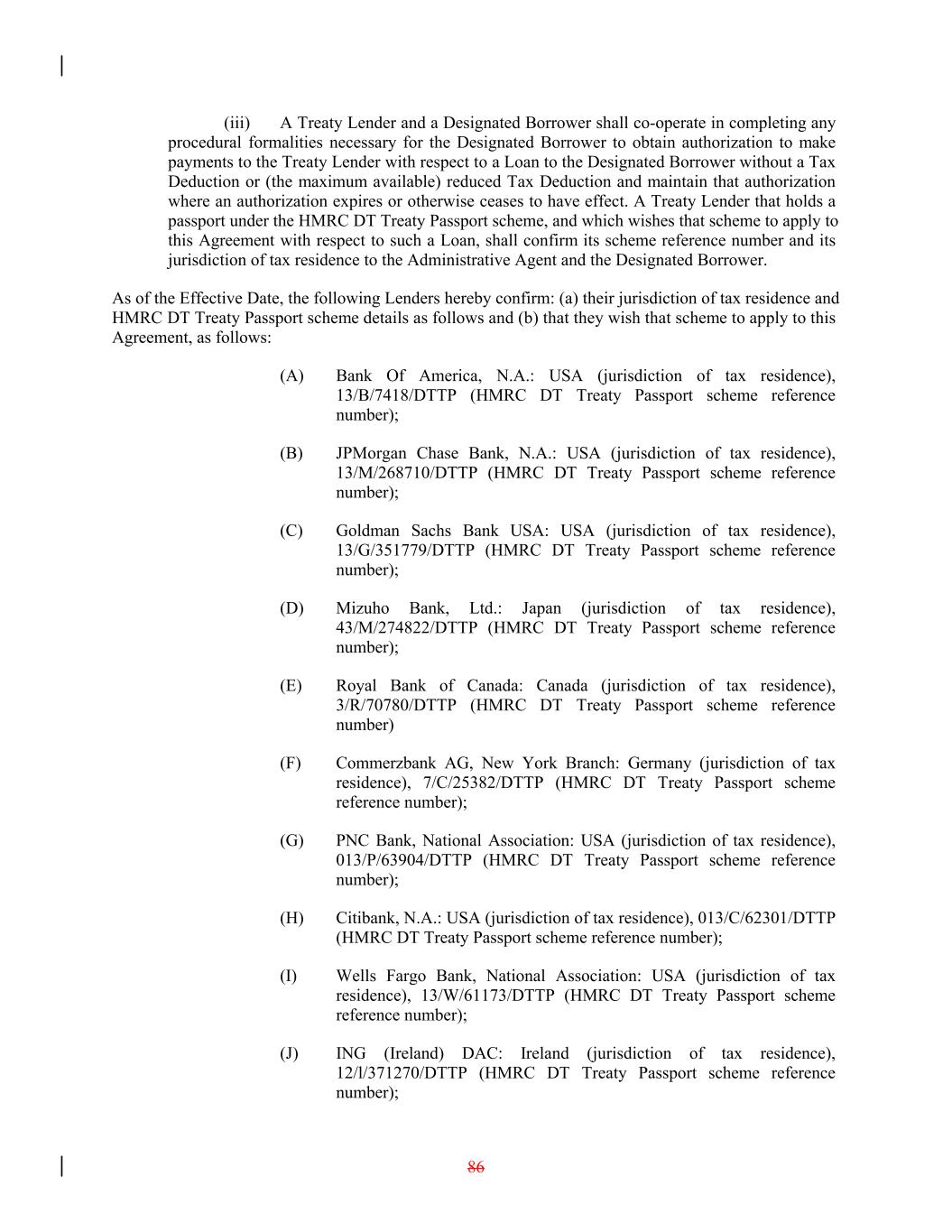 (iii) A Treaty Lender and a Designated Borrower shall co-operate in completing any procedural formalities necessary for the Designated Borrower to obtain authorization to make payments to the Treaty Lender with respect to a Loan to the Designated Borrower without a Tax Deduction or (the maximum available) reduced Tax Deduction and maintain that authorization where an authorization expires or otherwise ceases to have effect. A Treaty Lender that holds a passport under the HMRC DT Treaty Passport scheme, and which wishes that scheme to apply to this Agreement with respect to such a Loan, shall confirm its scheme reference number and its jurisdiction of tax residence to the Administrative Agent and the Designated Borrower. As of the Effective Date, the following Lenders hereby confirm: (a) their jurisdiction of tax residence and HMRC DT Treaty Passport scheme details as follows and (b) that they wish that scheme to apply to this Agreement, as follows: (A) Bank Of America, N.A.: USA (jurisdiction of tax residence), 13/B/7418/DTTP (HMRC DT Treaty Passport scheme reference number); (B) JPMorgan Chase Bank, N.A.: USA (jurisdiction of tax residence), 13/M/268710/DTTP (HMRC DT Treaty Passport scheme reference number); (C) Goldman Sachs Bank USA: USA (jurisdiction of tax residence), 13/G/351779/DTTP (HMRC DT Treaty Passport scheme reference number); (D) Mizuho Bank, Ltd.: Japan (jurisdiction of tax residence), 43/M/274822/DTTP (HMRC DT Treaty Passport scheme reference number); (E) Royal Bank of Canada: Canada (jurisdiction of tax residence), 3/R/70780/DTTP (HMRC DT Treaty Passport scheme reference number) (F) Commerzbank AG, New York Branch: Germany (jurisdiction of tax residence), 7/C/25382/DTTP (HMRC DT Treaty Passport scheme reference number); (G) PNC Bank, National Association: USA (jurisdiction of tax residence), 013/P/63904/DTTP (HMRC DT Treaty Passport scheme reference number); (H) Citibank, N.A.: USA (jurisdiction of tax residence), 013/C/62301/DTTP (HMRC DT Treaty Passport scheme reference number); (I) Wells Fargo Bank, National Association: USA (jurisdiction of tax residence), 13/W/61173/DTTP (HMRC DT Treaty Passport scheme reference number); (J) ING (Ireland) DAC: Ireland (jurisdiction of tax residence), 12/l/371270/DTTP (HMRC DT Treaty Passport scheme reference number); 86