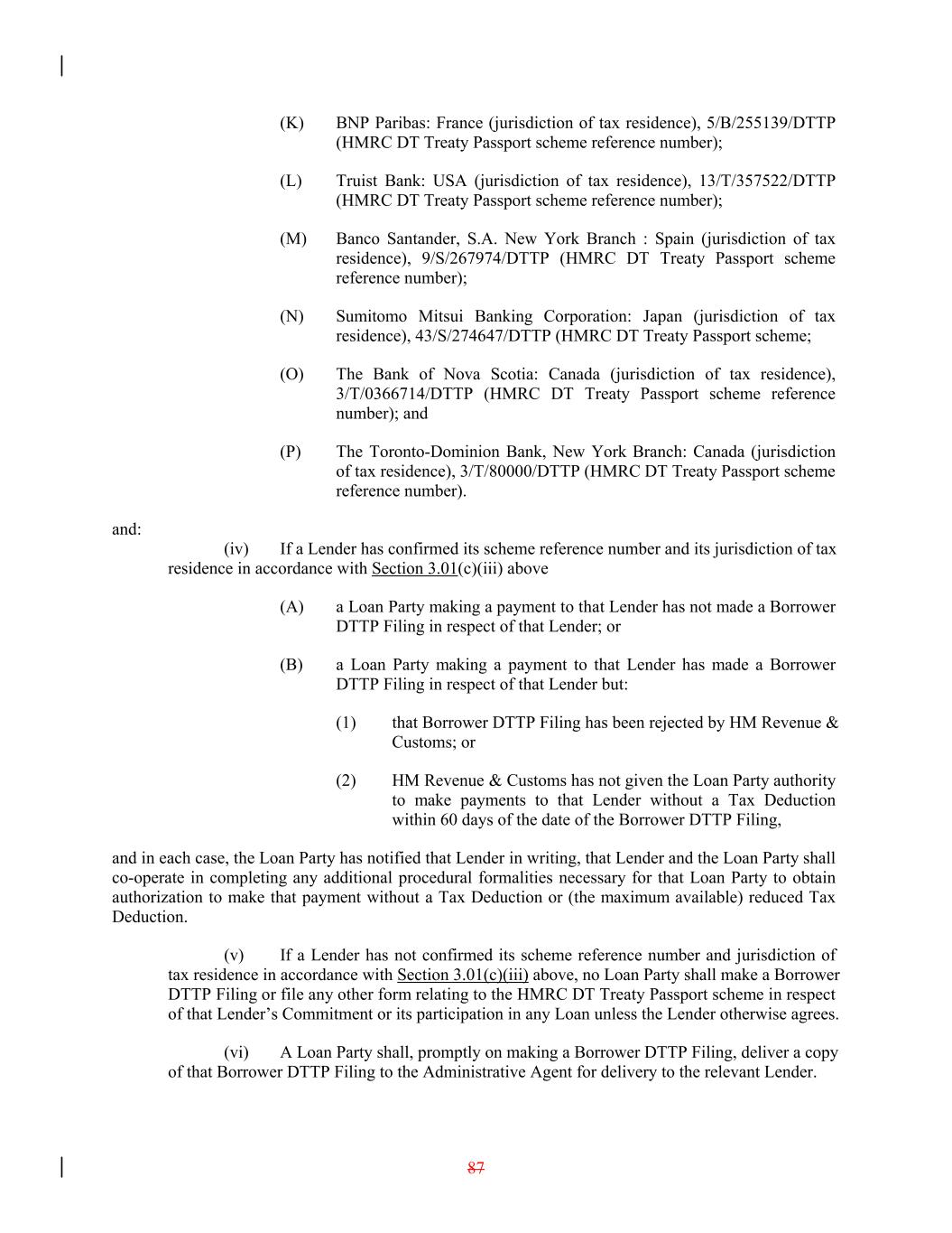 (K) BNP Paribas: France (jurisdiction of tax residence), 5/B/255139/DTTP (HMRC DT Treaty Passport scheme reference number); (L) Truist Bank: USA (jurisdiction of tax residence), 13/T/357522/DTTP (HMRC DT Treaty Passport scheme reference number); (M) Banco Santander, S.A. New York Branch : Spain (jurisdiction of tax residence), 9/S/267974/DTTP (HMRC DT Treaty Passport scheme reference number); (N) Sumitomo Mitsui Banking Corporation: Japan (jurisdiction of tax residence), 43/S/274647/DTTP (HMRC DT Treaty Passport scheme; (O) The Bank of Nova Scotia: Canada (jurisdiction of tax residence), 3/T/0366714/DTTP (HMRC DT Treaty Passport scheme reference number); and (P) The Toronto-Dominion Bank, New York Branch: Canada (jurisdiction of tax residence), 3/T/80000/DTTP (HMRC DT Treaty Passport scheme reference number). and: (iv) If a Lender has confirmed its scheme reference number and its jurisdiction of tax residence in accordance with Section 3.01(c)(iii) above (A) a Loan Party making a payment to that Lender has not made a Borrower DTTP Filing in respect of that Lender; or (B) a Loan Party making a payment to that Lender has made a Borrower DTTP Filing in respect of that Lender but: (1) that Borrower DTTP Filing has been rejected by HM Revenue & Customs; or (2) HM Revenue & Customs has not given the Loan Party authority to make payments to that Lender without a Tax Deduction within 60 days of the date of the Borrower DTTP Filing, and in each case, the Loan Party has notified that Lender in writing, that Lender and the Loan Party shall co-operate in completing any additional procedural formalities necessary for that Loan Party to obtain authorization to make that payment without a Tax Deduction or (the maximum available) reduced Tax Deduction. (v) If a Lender has not confirmed its scheme reference number and jurisdiction of tax residence in accordance with Section 3.01(c)(iii) above, no Loan Party shall make a Borrower DTTP Filing or file any other form relating to the HMRC DT Treaty Passport scheme in respect of that Lender’s Commitment or its participation in any Loan unless the Lender otherwise agrees. (vi) A Loan Party shall, promptly on making a Borrower DTTP Filing, deliver a copy of that Borrower DTTP Filing to the Administrative Agent for delivery to the relevant Lender. 87