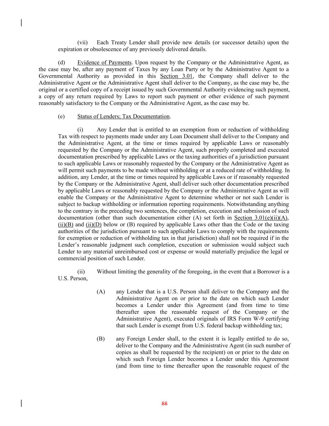 (vii) Each Treaty Lender shall provide new details (or successor details) upon the expiration or obsolescence of any previously delivered details. (d) Evidence of Payments. Upon request by the Company or the Administrative Agent, as the case may be, after any payment of Taxes by any Loan Party or by the Administrative Agent to a Governmental Authority as provided in this Section 3.01, the Company shall deliver to the Administrative Agent or the Administrative Agent shall deliver to the Company, as the case may be, the original or a certified copy of a receipt issued by such Governmental Authority evidencing such payment, a copy of any return required by Laws to report such payment or other evidence of such payment reasonably satisfactory to the Company or the Administrative Agent, as the case may be. (e) Status of Lenders; Tax Documentation. (i) Any Lender that is entitled to an exemption from or reduction of withholding Tax with respect to payments made under any Loan Document shall deliver to the Company and the Administrative Agent, at the time or times required by applicable Laws or reasonably requested by the Company or the Administrative Agent, such properly completed and executed documentation prescribed by applicable Laws or the taxing authorities of a jurisdiction pursuant to such applicable Laws or reasonably requested by the Company or the Administrative Agent as will permit such payments to be made without withholding or at a reduced rate of withholding. In addition, any Lender, at the time or times required by applicable Laws or if reasonably requested by the Company or the Administrative Agent, shall deliver such other documentation prescribed by applicable Laws or reasonably requested by the Company or the Administrative Agent as will enable the Company or the Administrative Agent to determine whether or not such Lender is subject to backup withholding or information reporting requirements. Notwithstanding anything to the contrary in the preceding two sentences, the completion, execution and submission of such documentation (other than such documentation either (A) set forth in Section 3.01(e)(ii)(A), (ii)(B) and (ii)(D) below or (B) required by applicable Laws other than the Code or the taxing authorities of the jurisdiction pursuant to such applicable Laws to comply with the requirements for exemption or reduction of withholding tax in that jurisdiction) shall not be required if in the Lender’s reasonable judgment such completion, execution or submission would subject such Lender to any material unreimbursed cost or expense or would materially prejudice the legal or commercial position of such Lender. (ii) Without limiting the generality of the foregoing, in the event that a Borrower is a U.S. Person, (A) any Lender that is a U.S. Person shall deliver to the Company and the Administrative Agent on or prior to the date on which such Lender becomes a Lender under this Agreement (and from time to time thereafter upon the reasonable request of the Company or the Administrative Agent), executed originals of IRS Form W-9 certifying that such Lender is exempt from U.S. federal backup withholding tax; (B) any Foreign Lender shall, to the extent it is legally entitled to do so, deliver to the Company and the Administrative Agent (in such number of copies as shall be requested by the recipient) on or prior to the date on which such Foreign Lender becomes a Lender under this Agreement (and from time to time thereafter upon the reasonable request of the 88