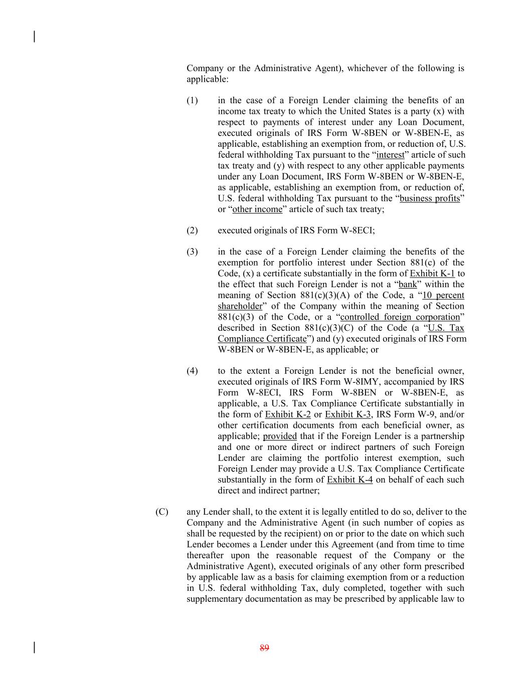 Company or the Administrative Agent), whichever of the following is applicable: (1) in the case of a Foreign Lender claiming the benefits of an income tax treaty to which the United States is a party (x) with respect to payments of interest under any Loan Document, executed originals of IRS Form W-8BEN or W-8BEN-E, as applicable, establishing an exemption from, or reduction of, U.S. federal withholding Tax pursuant to the “interest” article of such tax treaty and (y) with respect to any other applicable payments under any Loan Document, IRS Form W-8BEN or W-8BEN-E, as applicable, establishing an exemption from, or reduction of, U.S. federal withholding Tax pursuant to the “business profits” or “other income” article of such tax treaty; (2) executed originals of IRS Form W-8ECI; (3) in the case of a Foreign Lender claiming the benefits of the exemption for portfolio interest under Section 881(c) of the Code, (x) a certificate substantially in the form of Exhibit K-1 to the effect that such Foreign Lender is not a “bank” within the meaning of Section 881(c)(3)(A) of the Code, a “10 percent shareholder” of the Company within the meaning of Section 881(c)(3) of the Code, or a “controlled foreign corporation” described in Section 881(c)(3)(C) of the Code (a “U.S. Tax Compliance Certificate”) and (y) executed originals of IRS Form W-8BEN or W-8BEN-E, as applicable; or (4) to the extent a Foreign Lender is not the beneficial owner, executed originals of IRS Form W-8IMY, accompanied by IRS Form W-8ECI, IRS Form W-8BEN or W-8BEN-E, as applicable, a U.S. Tax Compliance Certificate substantially in the form of Exhibit K-2 or Exhibit K-3, IRS Form W-9, and/or other certification documents from each beneficial owner, as applicable; provided that if the Foreign Lender is a partnership and one or more direct or indirect partners of such Foreign Lender are claiming the portfolio interest exemption, such Foreign Lender may provide a U.S. Tax Compliance Certificate substantially in the form of Exhibit K-4 on behalf of each such direct and indirect partner; (C) any Lender shall, to the extent it is legally entitled to do so, deliver to the Company and the Administrative Agent (in such number of copies as shall be requested by the recipient) on or prior to the date on which such Lender becomes a Lender under this Agreement (and from time to time thereafter upon the reasonable request of the Company or the Administrative Agent), executed originals of any other form prescribed by applicable law as a basis for claiming exemption from or a reduction in U.S. federal withholding Tax, duly completed, together with such supplementary documentation as may be prescribed by applicable law to 89
