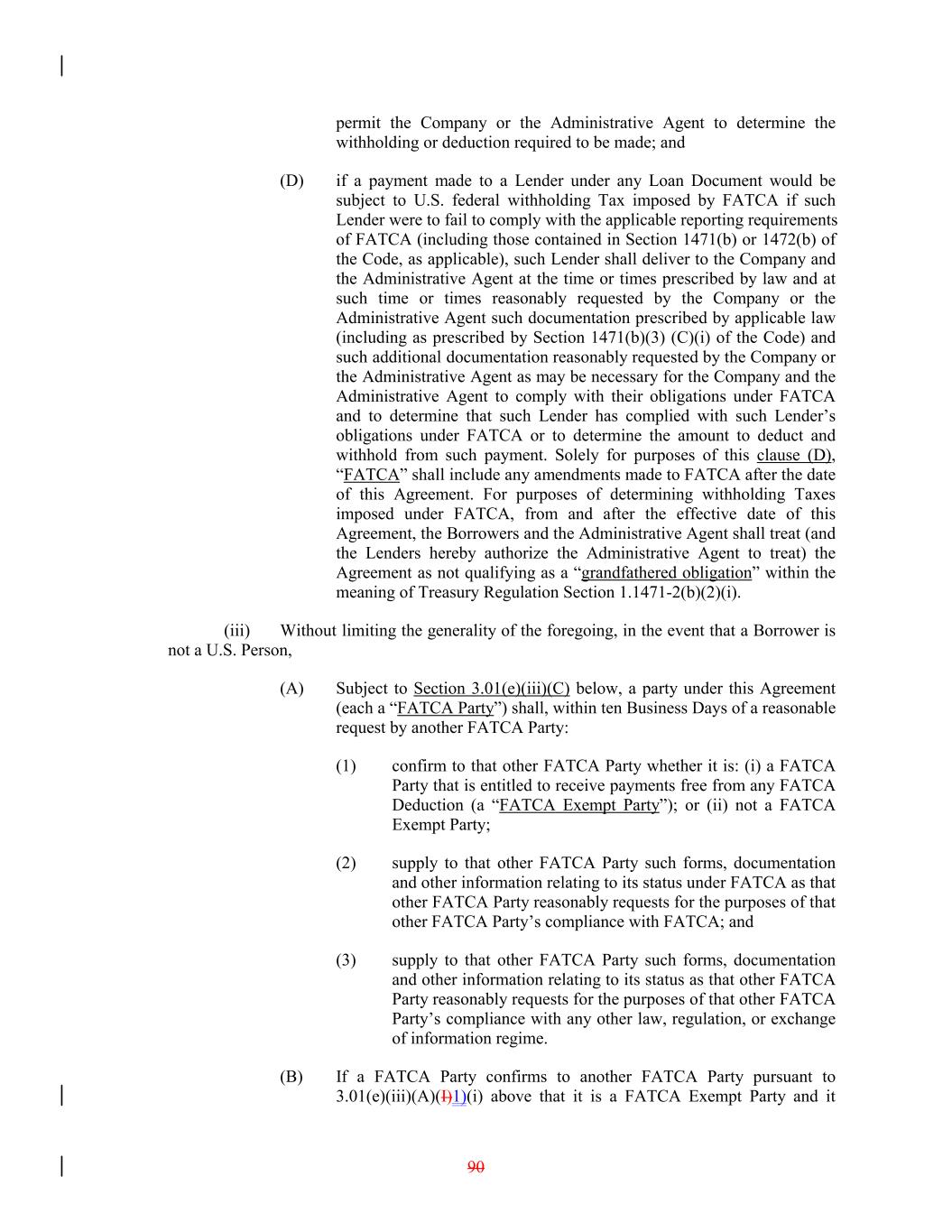 permit the Company or the Administrative Agent to determine the withholding or deduction required to be made; and (D) if a payment made to a Lender under any Loan Document would be subject to U.S. federal withholding Tax imposed by FATCA if such Lender were to fail to comply with the applicable reporting requirements of FATCA (including those contained in Section 1471(b) or 1472(b) of the Code, as applicable), such Lender shall deliver to the Company and the Administrative Agent at the time or times prescribed by law and at such time or times reasonably requested by the Company or the Administrative Agent such documentation prescribed by applicable law (including as prescribed by Section 1471(b)(3) (C)(i) of the Code) and such additional documentation reasonably requested by the Company or the Administrative Agent as may be necessary for the Company and the Administrative Agent to comply with their obligations under FATCA and to determine that such Lender has complied with such Lender’s obligations under FATCA or to determine the amount to deduct and withhold from such payment. Solely for purposes of this clause (D), “FATCA” shall include any amendments made to FATCA after the date of this Agreement. For purposes of determining withholding Taxes imposed under FATCA, from and after the effective date of this Agreement, the Borrowers and the Administrative Agent shall treat (and the Lenders hereby authorize the Administrative Agent to treat) the Agreement as not qualifying as a “grandfathered obligation” within the meaning of Treasury Regulation Section 1.1471-2(b)(2)(i). (iii) Without limiting the generality of the foregoing, in the event that a Borrower is not a U.S. Person, (A) Subject to Section 3.01(e)(iii)(C) below, a party under this Agreement (each a “FATCA Party”) shall, within ten Business Days of a reasonable request by another FATCA Party: (1) confirm to that other FATCA Party whether it is: (i) a FATCA Party that is entitled to receive payments free from any FATCA Deduction (a “FATCA Exempt Party”); or (ii) not a FATCA Exempt Party; (2) supply to that other FATCA Party such forms, documentation and other information relating to its status under FATCA as that other FATCA Party reasonably requests for the purposes of that other FATCA Party’s compliance with FATCA; and (3) supply to that other FATCA Party such forms, documentation and other information relating to its status as that other FATCA Party reasonably requests for the purposes of that other FATCA Party’s compliance with any other law, regulation, or exchange of information regime. (B) If a FATCA Party confirms to another FATCA Party pursuant to 3.01(e)(iii)(A)(I)1)(i) above that it is a FATCA Exempt Party and it 90
