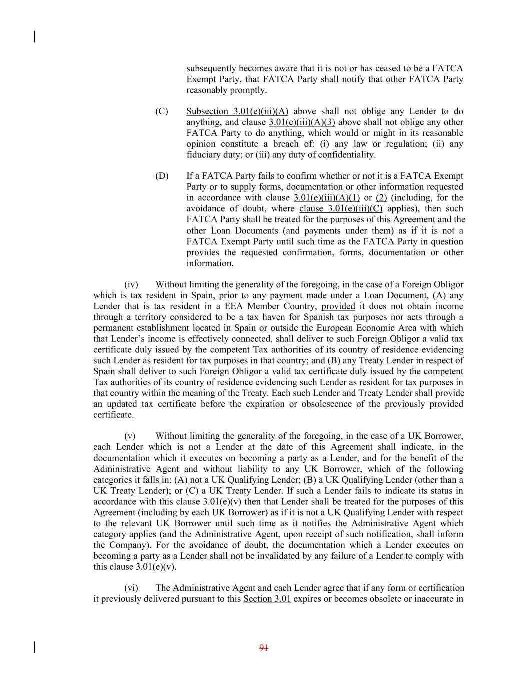 subsequently becomes aware that it is not or has ceased to be a FATCA Exempt Party, that FATCA Party shall notify that other FATCA Party reasonably promptly. (C) Subsection 3.01(e)(iii)(A) above shall not oblige any Lender to do anything, and clause 3.01(e)(iii)(A)(3) above shall not oblige any other FATCA Party to do anything, which would or might in its reasonable opinion constitute a breach of: (i) any law or regulation; (ii) any fiduciary duty; or (iii) any duty of confidentiality. (D) If a FATCA Party fails to confirm whether or not it is a FATCA Exempt Party or to supply forms, documentation or other information requested in accordance with clause 3.01(e)(iii)(A)(1) or (2) (including, for the avoidance of doubt, where clause 3.01(e)(iii)(C) applies), then such FATCA Party shall be treated for the purposes of this Agreement and the other Loan Documents (and payments under them) as if it is not a FATCA Exempt Party until such time as the FATCA Party in question provides the requested confirmation, forms, documentation or other information. (iv) Without limiting the generality of the foregoing, in the case of a Foreign Obligor which is tax resident in Spain, prior to any payment made under a Loan Document, (A) any Lender that is tax resident in a EEA Member Country, provided it does not obtain income through a territory considered to be a tax haven for Spanish tax purposes nor acts through a permanent establishment located in Spain or outside the European Economic Area with which that Lender’s income is effectively connected, shall deliver to such Foreign Obligor a valid tax certificate duly issued by the competent Tax authorities of its country of residence evidencing such Lender as resident for tax purposes in that country; and (B) any Treaty Lender in respect of Spain shall deliver to such Foreign Obligor a valid tax certificate duly issued by the competent Tax authorities of its country of residence evidencing such Lender as resident for tax purposes in that country within the meaning of the Treaty. Each such Lender and Treaty Lender shall provide an updated tax certificate before the expiration or obsolescence of the previously provided certificate. (v) Without limiting the generality of the foregoing, in the case of a UK Borrower, each Lender which is not a Lender at the date of this Agreement shall indicate, in the documentation which it executes on becoming a party as a Lender, and for the benefit of the Administrative Agent and without liability to any UK Borrower, which of the following categories it falls in: (A) not a UK Qualifying Lender; (B) a UK Qualifying Lender (other than a UK Treaty Lender); or (C) a UK Treaty Lender. If such a Lender fails to indicate its status in accordance with this clause 3.01(e)(v) then that Lender shall be treated for the purposes of this Agreement (including by each UK Borrower) as if it is not a UK Qualifying Lender with respect to the relevant UK Borrower until such time as it notifies the Administrative Agent which category applies (and the Administrative Agent, upon receipt of such notification, shall inform the Company). For the avoidance of doubt, the documentation which a Lender executes on becoming a party as a Lender shall not be invalidated by any failure of a Lender to comply with this clause 3.01(e)(v). (vi) The Administrative Agent and each Lender agree that if any form or certification it previously delivered pursuant to this Section 3.01 expires or becomes obsolete or inaccurate in 91
