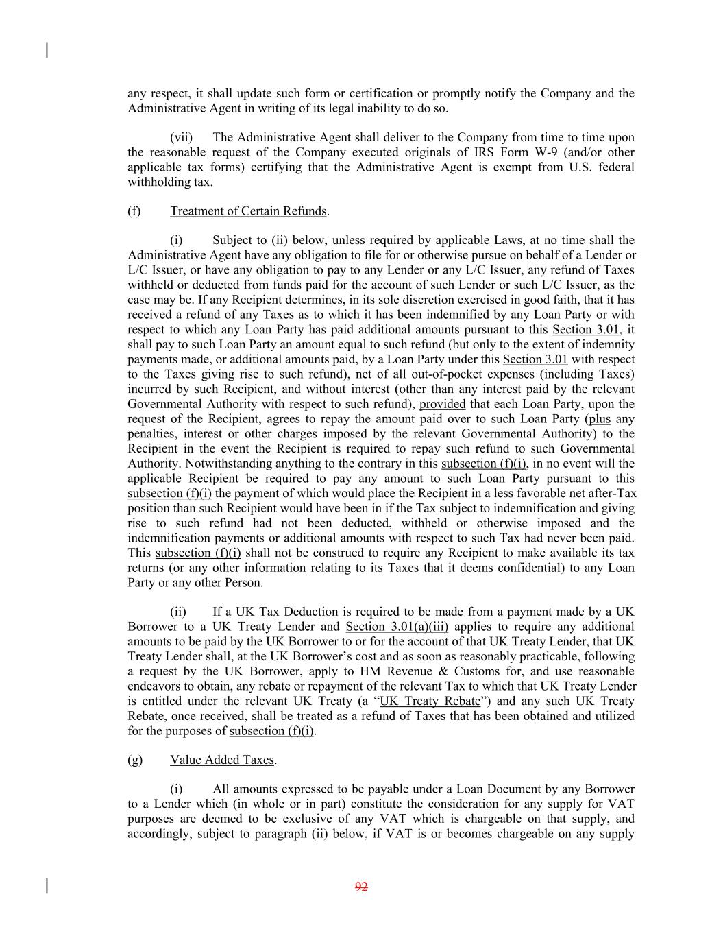 any respect, it shall update such form or certification or promptly notify the Company and the Administrative Agent in writing of its legal inability to do so. (vii) The Administrative Agent shall deliver to the Company from time to time upon the reasonable request of the Company executed originals of IRS Form W-9 (and/or other applicable tax forms) certifying that the Administrative Agent is exempt from U.S. federal withholding tax. (f) Treatment of Certain Refunds. (i) Subject to (ii) below, unless required by applicable Laws, at no time shall the Administrative Agent have any obligation to file for or otherwise pursue on behalf of a Lender or L/C Issuer, or have any obligation to pay to any Lender or any L/C Issuer, any refund of Taxes withheld or deducted from funds paid for the account of such Lender or such L/C Issuer, as the case may be. If any Recipient determines, in its sole discretion exercised in good faith, that it has received a refund of any Taxes as to which it has been indemnified by any Loan Party or with respect to which any Loan Party has paid additional amounts pursuant to this Section 3.01, it shall pay to such Loan Party an amount equal to such refund (but only to the extent of indemnity payments made, or additional amounts paid, by a Loan Party under this Section 3.01 with respect to the Taxes giving rise to such refund), net of all out-of-pocket expenses (including Taxes) incurred by such Recipient, and without interest (other than any interest paid by the relevant Governmental Authority with respect to such refund), provided that each Loan Party, upon the request of the Recipient, agrees to repay the amount paid over to such Loan Party (plus any penalties, interest or other charges imposed by the relevant Governmental Authority) to the Recipient in the event the Recipient is required to repay such refund to such Governmental Authority. Notwithstanding anything to the contrary in this subsection (f)(i), in no event will the applicable Recipient be required to pay any amount to such Loan Party pursuant to this subsection (f)(i) the payment of which would place the Recipient in a less favorable net after-Tax position than such Recipient would have been in if the Tax subject to indemnification and giving rise to such refund had not been deducted, withheld or otherwise imposed and the indemnification payments or additional amounts with respect to such Tax had never been paid. This subsection (f)(i) shall not be construed to require any Recipient to make available its tax returns (or any other information relating to its Taxes that it deems confidential) to any Loan Party or any other Person. (ii) If a UK Tax Deduction is required to be made from a payment made by a UK Borrower to a UK Treaty Lender and Section 3.01(a)(iii) applies to require any additional amounts to be paid by the UK Borrower to or for the account of that UK Treaty Lender, that UK Treaty Lender shall, at the UK Borrower’s cost and as soon as reasonably practicable, following a request by the UK Borrower, apply to HM Revenue & Customs for, and use reasonable endeavors to obtain, any rebate or repayment of the relevant Tax to which that UK Treaty Lender is entitled under the relevant UK Treaty (a “UK Treaty Rebate”) and any such UK Treaty Rebate, once received, shall be treated as a refund of Taxes that has been obtained and utilized for the purposes of subsection (f)(i). (g) Value Added Taxes. (i) All amounts expressed to be payable under a Loan Document by any Borrower to a Lender which (in whole or in part) constitute the consideration for any supply for VAT purposes are deemed to be exclusive of any VAT which is chargeable on that supply, and accordingly, subject to paragraph (ii) below, if VAT is or becomes chargeable on any supply 92