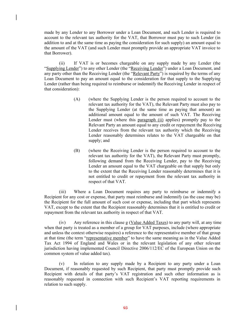 made by any Lender to any Borrower under a Loan Document, and such Lender is required to account to the relevant tax authority for the VAT, that Borrower must pay to such Lender (in addition to and at the same time as paying the consideration for such supply) an amount equal to the amount of the VAT (and such Lender must promptly provide an appropriate VAT invoice to that Borrower). (ii) If VAT is or becomes chargeable on any supply made by any Lender (the “Supplying Lender”) to any other Lender (the “Receiving Lender”) under a Loan Document, and any party other than the Receiving Lender (the “Relevant Party”) is required by the terms of any Loan Document to pay an amount equal to the consideration for that supply to the Supplying Lender (rather than being required to reimburse or indemnify the Receiving Lender in respect of that consideration): (A) (where the Supplying Lender is the person required to account to the relevant tax authority for the VAT), the Relevant Party must also pay to the Supplying Lender (at the same time as paying that amount) an additional amount equal to the amount of such VAT. The Receiving Lender must (where this paragraph (ii) applies) promptly pay to the Relevant Party an amount equal to any credit or repayment the Receiving Lender receives from the relevant tax authority which the Receiving Lender reasonably determines relates to the VAT chargeable on that supply; and (B) (where the Receiving Lender is the person required to account to the relevant tax authority for the VAT), the Relevant Party must promptly, following demand from the Receiving Lender, pay to the Receiving Lender an amount equal to the VAT chargeable on that supply but only to the extent that the Receiving Lender reasonably determines that it is not entitled to credit or repayment from the relevant tax authority in respect of that VAT. (iii) Where a Loan Document requires any party to reimburse or indemnify a Recipient for any cost or expense, that party must reimburse and indemnify (as the case may be) the Recipient for the full amount of such cost or expense, including that part which represents VAT, except to the extent that the Recipient reasonably determines that it is entitled to credit or repayment from the relevant tax authority in respect of that VAT. (iv) Any reference in this clause g (Value Added Taxes) to any party will, at any time when that party is treated as a member of a group for VAT purposes, include (where appropriate and unless the context otherwise requires) a reference to the representative member of that group at that time (the term “representative member” to have the same meaning as in the Value Added Tax Act 1994 of England and Wales or in the relevant legislation of any other relevant jurisdiction having implemented Council Directive 2006/112/EC of the European Union on the common system of value added tax). (v) In relation to any supply made by a Recipient to any party under a Loan Document, if reasonably requested by such Recipient, that party must promptly provide such Recipient with details of that party’s VAT registration and such other information as is reasonably requested in connection with such Recipient’s VAT reporting requirements in relation to such supply. 93