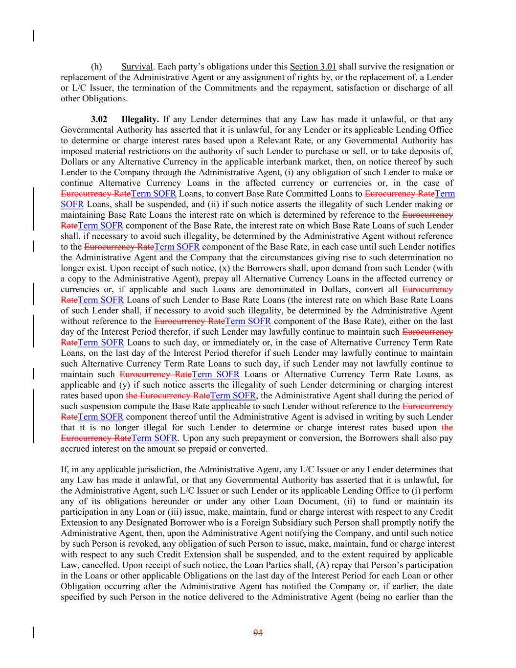 (h) Survival. Each party’s obligations under this Section 3.01 shall survive the resignation or replacement of the Administrative Agent or any assignment of rights by, or the replacement of, a Lender or L/C Issuer, the termination of the Commitments and the repayment, satisfaction or discharge of all other Obligations. 3.02 Illegality. If any Lender determines that any Law has made it unlawful, or that any Governmental Authority has asserted that it is unlawful, for any Lender or its applicable Lending Office to determine or charge interest rates based upon a Relevant Rate, or any Governmental Authority has imposed material restrictions on the authority of such Lender to purchase or sell, or to take deposits of, Dollars or any Alternative Currency in the applicable interbank market, then, on notice thereof by such Lender to the Company through the Administrative Agent, (i) any obligation of such Lender to make or continue Alternative Currency Loans in the affected currency or currencies or, in the case of Eurocurrency RateTerm SOFR Loans, to convert Base Rate Committed Loans to Eurocurrency RateTerm SOFR Loans, shall be suspended, and (ii) if such notice asserts the illegality of such Lender making or maintaining Base Rate Loans the interest rate on which is determined by reference to the Eurocurrency RateTerm SOFR component of the Base Rate, the interest rate on which Base Rate Loans of such Lender shall, if necessary to avoid such illegality, be determined by the Administrative Agent without reference to the Eurocurrency RateTerm SOFR component of the Base Rate, in each case until such Lender notifies the Administrative Agent and the Company that the circumstances giving rise to such determination no longer exist. Upon receipt of such notice, (x) the Borrowers shall, upon demand from such Lender (with a copy to the Administrative Agent), prepay all Alternative Currency Loans in the affected currency or currencies or, if applicable and such Loans are denominated in Dollars, convert all Eurocurrency RateTerm SOFR Loans of such Lender to Base Rate Loans (the interest rate on which Base Rate Loans of such Lender shall, if necessary to avoid such illegality, be determined by the Administrative Agent without reference to the Eurocurrency RateTerm SOFR component of the Base Rate), either on the last day of the Interest Period therefor, if such Lender may lawfully continue to maintain such Eurocurrency RateTerm SOFR Loans to such day, or immediately or, in the case of Alternative Currency Term Rate Loans, on the last day of the Interest Period therefor if such Lender may lawfully continue to maintain such Alternative Currency Term Rate Loans to such day, if such Lender may not lawfully continue to maintain such Eurocurrency RateTerm SOFR Loans or Alternative Currency Term Rate Loans, as applicable and (y) if such notice asserts the illegality of such Lender determining or charging interest rates based upon the Eurocurrency RateTerm SOFR, the Administrative Agent shall during the period of such suspension compute the Base Rate applicable to such Lender without reference to the Eurocurrency RateTerm SOFR component thereof until the Administrative Agent is advised in writing by such Lender that it is no longer illegal for such Lender to determine or charge interest rates based upon the Eurocurrency RateTerm SOFR. Upon any such prepayment or conversion, the Borrowers shall also pay accrued interest on the amount so prepaid or converted. If, in any applicable jurisdiction, the Administrative Agent, any L/C Issuer or any Lender determines that any Law has made it unlawful, or that any Governmental Authority has asserted that it is unlawful, for the Administrative Agent, such L/C Issuer or such Lender or its applicable Lending Office to (i) perform any of its obligations hereunder or under any other Loan Document, (ii) to fund or maintain its participation in any Loan or (iii) issue, make, maintain, fund or charge interest with respect to any Credit Extension to any Designated Borrower who is a Foreign Subsidiary such Person shall promptly notify the Administrative Agent, then, upon the Administrative Agent notifying the Company, and until such notice by such Person is revoked, any obligation of such Person to issue, make, maintain, fund or charge interest with respect to any such Credit Extension shall be suspended, and to the extent required by applicable Law, cancelled. Upon receipt of such notice, the Loan Parties shall, (A) repay that Person’s participation in the Loans or other applicable Obligations on the last day of the Interest Period for each Loan or other Obligation occurring after the Administrative Agent has notified the Company or, if earlier, the date specified by such Person in the notice delivered to the Administrative Agent (being no earlier than the 94