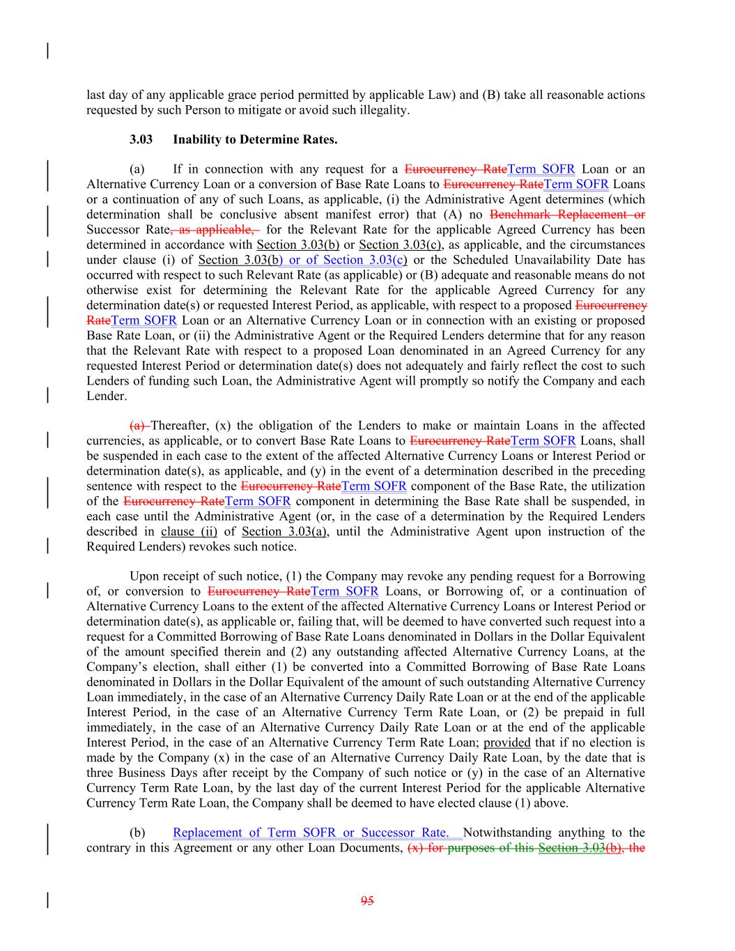 last day of any applicable grace period permitted by applicable Law) and (B) take all reasonable actions requested by such Person to mitigate or avoid such illegality. 3.03 Inability to Determine Rates. (a) If in connection with any request for a Eurocurrency RateTerm SOFR Loan or an Alternative Currency Loan or a conversion of Base Rate Loans to Eurocurrency RateTerm SOFR Loans or a continuation of any of such Loans, as applicable, (i) the Administrative Agent determines (which determination shall be conclusive absent manifest error) that (A) no Benchmark Replacement or Successor Rate, as applicable, for the Relevant Rate for the applicable Agreed Currency has been determined in accordance with Section 3.03(b) or Section 3.03(c), as applicable, and the circumstances under clause (i) of Section 3.03(b) or of Section 3.03(c) or the Scheduled Unavailability Date has occurred with respect to such Relevant Rate (as applicable) or (B) adequate and reasonable means do not otherwise exist for determining the Relevant Rate for the applicable Agreed Currency for any determination date(s) or requested Interest Period, as applicable, with respect to a proposed Eurocurrency RateTerm SOFR Loan or an Alternative Currency Loan or in connection with an existing or proposed Base Rate Loan, or (ii) the Administrative Agent or the Required Lenders determine that for any reason that the Relevant Rate with respect to a proposed Loan denominated in an Agreed Currency for any requested Interest Period or determination date(s) does not adequately and fairly reflect the cost to such Lenders of funding such Loan, the Administrative Agent will promptly so notify the Company and each Lender. (a) Thereafter, (x) the obligation of the Lenders to make or maintain Loans in the affected currencies, as applicable, or to convert Base Rate Loans to Eurocurrency RateTerm SOFR Loans, shall be suspended in each case to the extent of the affected Alternative Currency Loans or Interest Period or determination date(s), as applicable, and (y) in the event of a determination described in the preceding sentence with respect to the Eurocurrency RateTerm SOFR component of the Base Rate, the utilization of the Eurocurrency RateTerm SOFR component in determining the Base Rate shall be suspended, in each case until the Administrative Agent (or, in the case of a determination by the Required Lenders described in clause (ii) of Section 3.03(a), until the Administrative Agent upon instruction of the Required Lenders) revokes such notice. Upon receipt of such notice, (1) the Company may revoke any pending request for a Borrowing of, or conversion to Eurocurrency RateTerm SOFR Loans, or Borrowing of, or a continuation of Alternative Currency Loans to the extent of the affected Alternative Currency Loans or Interest Period or determination date(s), as applicable or, failing that, will be deemed to have converted such request into a request for a Committed Borrowing of Base Rate Loans denominated in Dollars in the Dollar Equivalent of the amount specified therein and (2) any outstanding affected Alternative Currency Loans, at the Company’s election, shall either (1) be converted into a Committed Borrowing of Base Rate Loans denominated in Dollars in the Dollar Equivalent of the amount of such outstanding Alternative Currency Loan immediately, in the case of an Alternative Currency Daily Rate Loan or at the end of the applicable Interest Period, in the case of an Alternative Currency Term Rate Loan, or (2) be prepaid in full immediately, in the case of an Alternative Currency Daily Rate Loan or at the end of the applicable Interest Period, in the case of an Alternative Currency Term Rate Loan; provided that if no election is made by the Company (x) in the case of an Alternative Currency Daily Rate Loan, by the date that is three Business Days after receipt by the Company of such notice or (y) in the case of an Alternative Currency Term Rate Loan, by the last day of the current Interest Period for the applicable Alternative Currency Term Rate Loan, the Company shall be deemed to have elected clause (1) above. (b) Replacement of Term SOFR or Successor Rate. Notwithstanding anything to the contrary in this Agreement or any other Loan Documents, (x) for purposes of this Section 3.03(b), the 95