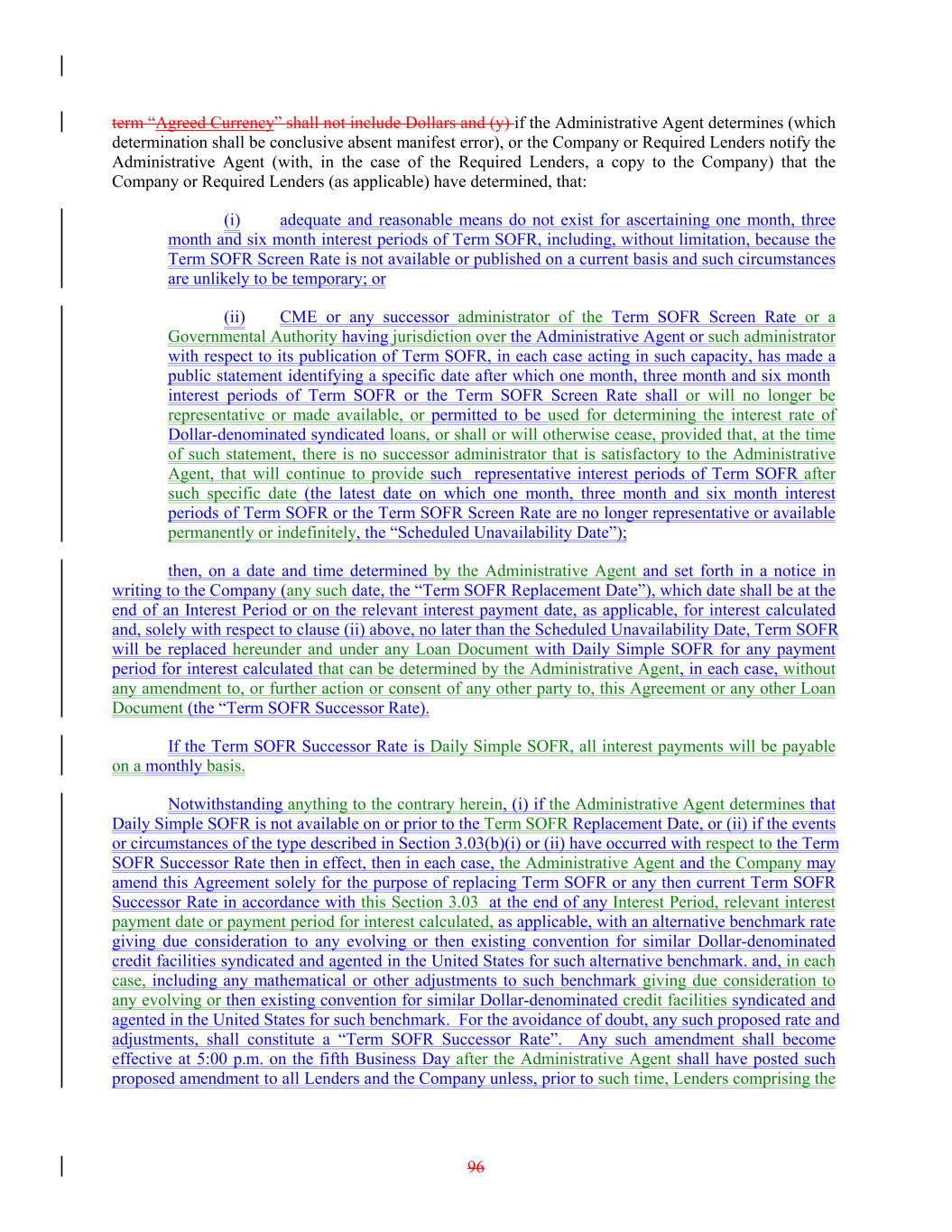 term “Agreed Currency” shall not include Dollars and (y) if the Administrative Agent determines (which determination shall be conclusive absent manifest error), or the Company or Required Lenders notify the Administrative Agent (with, in the case of the Required Lenders, a copy to the Company) that the Company or Required Lenders (as applicable) have determined, that: (i) adequate and reasonable means do not exist for ascertaining one month, three month and six month interest periods of Term SOFR, including, without limitation, because the Term SOFR Screen Rate is not available or published on a current basis and such circumstances are unlikely to be temporary; or (ii) CME or any successor administrator of the Term SOFR Screen Rate or a Governmental Authority having jurisdiction over the Administrative Agent or such administrator with respect to its publication of Term SOFR, in each case acting in such capacity, has made a public statement identifying a specific date after which one month, three month and six month interest periods of Term SOFR or the Term SOFR Screen Rate shall or will no longer be representative or made available, or permitted to be used for determining the interest rate of Dollar-denominated syndicated loans, or shall or will otherwise cease, provided that, at the time of such statement, there is no successor administrator that is satisfactory to the Administrative Agent, that will continue to provide such representative interest periods of Term SOFR after such specific date (the latest date on which one month, three month and six month interest periods of Term SOFR or the Term SOFR Screen Rate are no longer representative or available permanently or indefinitely, the “Scheduled Unavailability Date”); then, on a date and time determined by the Administrative Agent and set forth in a notice in writing to the Company (any such date, the “Term SOFR Replacement Date”), which date shall be at the end of an Interest Period or on the relevant interest payment date, as applicable, for interest calculated and, solely with respect to clause (ii) above, no later than the Scheduled Unavailability Date, Term SOFR will be replaced hereunder and under any Loan Document with Daily Simple SOFR for any payment period for interest calculated that can be determined by the Administrative Agent, in each case, without any amendment to, or further action or consent of any other party to, this Agreement or any other Loan Document (the “Term SOFR Successor Rate). If the Term SOFR Successor Rate is Daily Simple SOFR, all interest payments will be payable on a monthly basis. Notwithstanding anything to the contrary herein, (i) if the Administrative Agent determines that Daily Simple SOFR is not available on or prior to the Term SOFR Replacement Date, or (ii) if the events or circumstances of the type described in Section 3.03(b)(i) or (ii) have occurred with respect to the Term SOFR Successor Rate then in effect, then in each case, the Administrative Agent and the Company may amend this Agreement solely for the purpose of replacing Term SOFR or any then current Term SOFR Successor Rate in accordance with this Section 3.03 at the end of any Interest Period, relevant interest payment date or payment period for interest calculated, as applicable, with an alternative benchmark rate giving due consideration to any evolving or then existing convention for similar Dollar-denominated credit facilities syndicated and agented in the United States for such alternative benchmark. and, in each case, including any mathematical or other adjustments to such benchmark giving due consideration to any evolving or then existing convention for similar Dollar-denominated credit facilities syndicated and agented in the United States for such benchmark. For the avoidance of doubt, any such proposed rate and adjustments, shall constitute a “Term SOFR Successor Rate”. Any such amendment shall become effective at 5:00 p.m. on the fifth Business Day after the Administrative Agent shall have posted such proposed amendment to all Lenders and the Company unless, prior to such time, Lenders comprising the 96