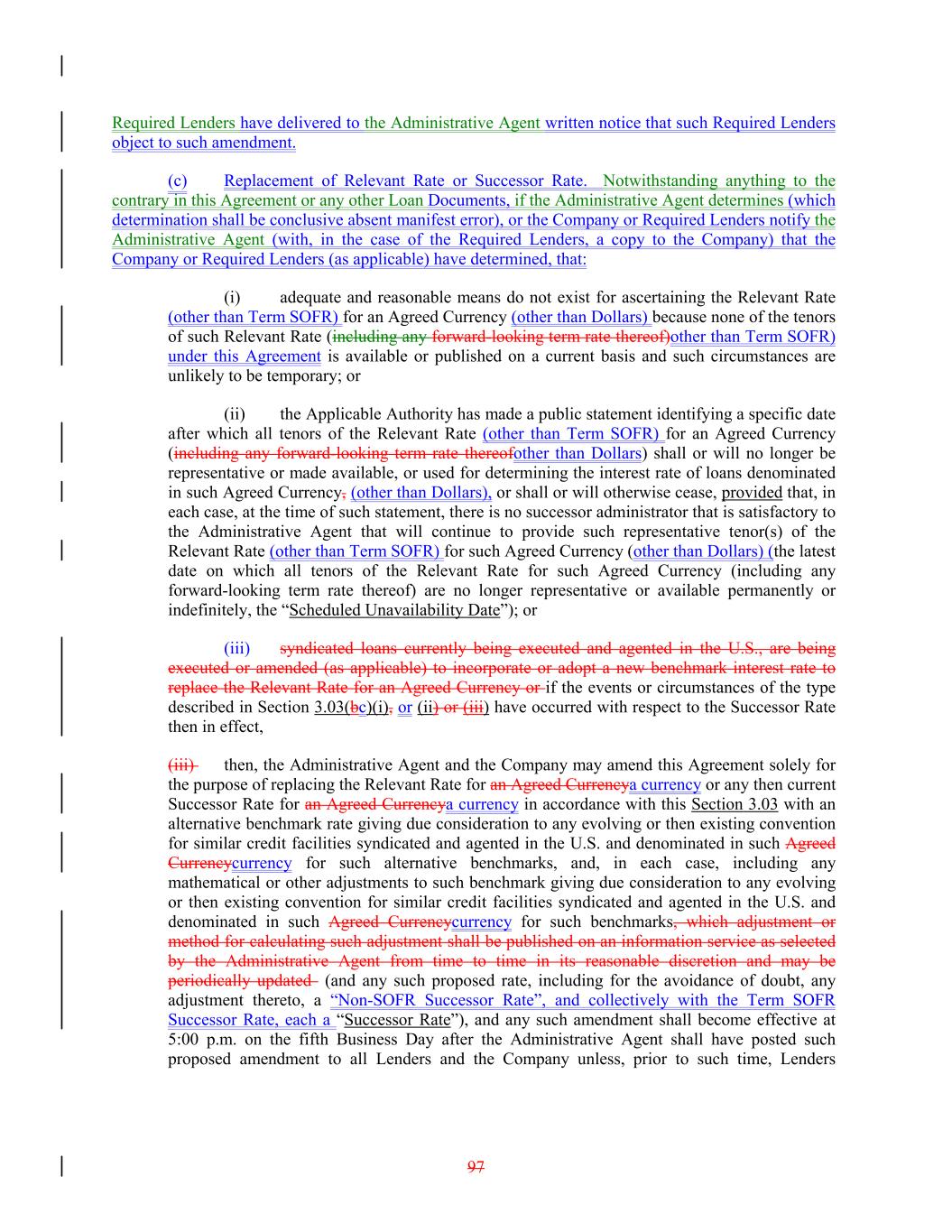 Required Lenders have delivered to the Administrative Agent written notice that such Required Lenders object to such amendment. (c) Replacement of Relevant Rate or Successor Rate. Notwithstanding anything to the contrary in this Agreement or any other Loan Documents, if the Administrative Agent determines (which determination shall be conclusive absent manifest error), or the Company or Required Lenders notify the Administrative Agent (with, in the case of the Required Lenders, a copy to the Company) that the Company or Required Lenders (as applicable) have determined, that: (i) adequate and reasonable means do not exist for ascertaining the Relevant Rate (other than Term SOFR) for an Agreed Currency (other than Dollars) because none of the tenors of such Relevant Rate (including any forward-looking term rate thereof)other than Term SOFR) under this Agreement is available or published on a current basis and such circumstances are unlikely to be temporary; or (ii) the Applicable Authority has made a public statement identifying a specific date after which all tenors of the Relevant Rate (other than Term SOFR) for an Agreed Currency (including any forward-looking term rate thereofother than Dollars) shall or will no longer be representative or made available, or used for determining the interest rate of loans denominated in such Agreed Currency, (other than Dollars), or shall or will otherwise cease, provided that, in each case, at the time of such statement, there is no successor administrator that is satisfactory to the Administrative Agent that will continue to provide such representative tenor(s) of the Relevant Rate (other than Term SOFR) for such Agreed Currency (other than Dollars) (the latest date on which all tenors of the Relevant Rate for such Agreed Currency (including any forward-looking term rate thereof) are no longer representative or available permanently or indefinitely, the “Scheduled Unavailability Date”); or (iii) syndicated loans currently being executed and agented in the U.S., are being executed or amended (as applicable) to incorporate or adopt a new benchmark interest rate to replace the Relevant Rate for an Agreed Currency or if the events or circumstances of the type described in Section 3.03(bc)(i), or (ii) or (iii) have occurred with respect to the Successor Rate then in effect, (iii) then, the Administrative Agent and the Company may amend this Agreement solely for the purpose of replacing the Relevant Rate for an Agreed Currencya currency or any then current Successor Rate for an Agreed Currencya currency in accordance with this Section 3.03 with an alternative benchmark rate giving due consideration to any evolving or then existing convention for similar credit facilities syndicated and agented in the U.S. and denominated in such Agreed Currencycurrency for such alternative benchmarks, and, in each case, including any mathematical or other adjustments to such benchmark giving due consideration to any evolving or then existing convention for similar credit facilities syndicated and agented in the U.S. and denominated in such Agreed Currencycurrency for such benchmarks, which adjustment or method for calculating such adjustment shall be published on an information service as selected by the Administrative Agent from time to time in its reasonable discretion and may be periodically updated (and any such proposed rate, including for the avoidance of doubt, any adjustment thereto, a “Non-SOFR Successor Rate”, and collectively with the Term SOFR Successor Rate, each a “Successor Rate”), and any such amendment shall become effective at 5:00 p.m. on the fifth Business Day after the Administrative Agent shall have posted such proposed amendment to all Lenders and the Company unless, prior to such time, Lenders 97
