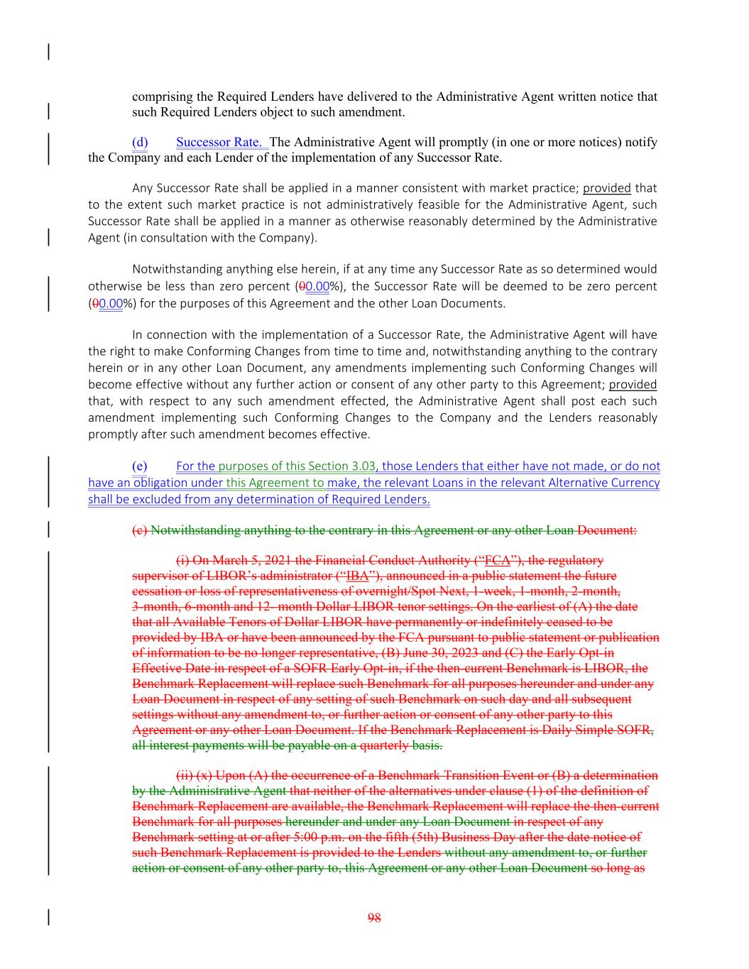 comprising the Required Lenders have delivered to the Administrative Agent written notice that such Required Lenders object to such amendment. (d) Successor Rate. The Administrative Agent will promptly (in one or more notices) notify the Company and each Lender of the implementation of any Successor Rate. Any Successor Rate shall be applied in a manner consistent with market practice; provided that to the extent such market practice is not administratively feasible for the Administrative Agent, such Successor Rate shall be applied in a manner as otherwise reasonably determined by the Administrative Agent (in consultation with the Company). Notwithstanding anything else herein, if at any time any Successor Rate as so determined would otherwise be less than zero percent (00.00%), the Successor Rate will be deemed to be zero percent (00.00%) for the purposes of this Agreement and the other Loan Documents. In connection with the implementation of a Successor Rate, the Administrative Agent will have the right to make Conforming Changes from time to time and, notwithstanding anything to the contrary herein or in any other Loan Document, any amendments implementing such Conforming Changes will become effective without any further action or consent of any other party to this Agreement; provided that, with respect to any such amendment effected, the Administrative Agent shall post each such amendment implementing such Conforming Changes to the Company and the Lenders reasonably promptly after such amendment becomes effective. (e) For the purposes of this Section 3.03, those Lenders that either have not made, or do not have an obligation under this Agreement to make, the relevant Loans in the relevant Alternative Currency shall be excluded from any determination of Required Lenders. (c) Notwithstanding anything to the contrary in this Agreement or any other Loan Document: (i) On March 5, 2021 the Financial Conduct Authority (“FCA”), the regulatory supervisor of LIBOR’s administrator (“IBA”), announced in a public statement the future cessation or loss of representativeness of overnight/Spot Next, 1-week, 1-month, 2-month, 3-month, 6-month and 12- month Dollar LIBOR tenor settings. On the earliest of (A) the date that all Available Tenors of Dollar LIBOR have permanently or indefinitely ceased to be provided by IBA or have been announced by the FCA pursuant to public statement or publication of information to be no longer representative, (B) June 30, 2023 and (C) the Early Opt-in Effective Date in respect of a SOFR Early Opt-in, if the then-current Benchmark is LIBOR, the Benchmark Replacement will replace such Benchmark for all purposes hereunder and under any Loan Document in respect of any setting of such Benchmark on such day and all subsequent settings without any amendment to, or further action or consent of any other party to this Agreement or any other Loan Document. If the Benchmark Replacement is Daily Simple SOFR, all interest payments will be payable on a quarterly basis. (ii) (x) Upon (A) the occurrence of a Benchmark Transition Event or (B) a determination by the Administrative Agent that neither of the alternatives under clause (1) of the definition of Benchmark Replacement are available, the Benchmark Replacement will replace the then-current Benchmark for all purposes hereunder and under any Loan Document in respect of any Benchmark setting at or after 5:00 p.m. on the fifth (5th) Business Day after the date notice of such Benchmark Replacement is provided to the Lenders without any amendment to, or further action or consent of any other party to, this Agreement or any other Loan Document so long as 98