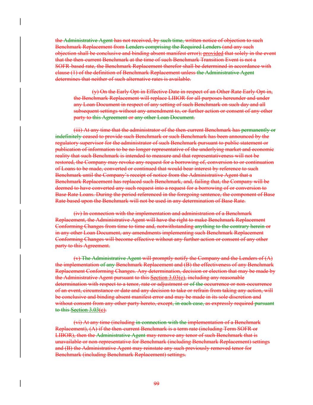 the Administrative Agent has not received, by such time, written notice of objection to such Benchmark Replacement from Lenders comprising the Required Lenders (and any such objection shall be conclusive and binding absent manifest error); provided that solely in the event that the then-current Benchmark at the time of such Benchmark Transition Event is not a SOFR-based rate, the Benchmark Replacement therefor shall be determined in accordance with clause (1) of the definition of Benchmark Replacement unless the Administrative Agent determines that neither of such alternative rates is available. (y) On the Early Opt-in Effective Date in respect of an Other Rate Early Opt-in, the Benchmark Replacement will replace LIBOR for all purposes hereunder and under any Loan Document in respect of any setting of such Benchmark on such day and all subsequent settings without any amendment to, or further action or consent of any other party to this Agreement or any other Loan Document. (iii) At any time that the administrator of the then-current Benchmark has permanently or indefinitely ceased to provide such Benchmark or such Benchmark has been announced by the regulatory supervisor for the administrator of such Benchmark pursuant to public statement or publication of information to be no longer representative of the underlying market and economic reality that such Benchmark is intended to measure and that representativeness will not be restored, the Company may revoke any request for a borrowing of, conversion to or continuation of Loans to be made, converted or continued that would bear interest by reference to such Benchmark until the Company’s receipt of notice from the Administrative Agent that a Benchmark Replacement has replaced such Benchmark, and, failing that, the Company will be deemed to have converted any such request into a request for a borrowing of or conversion to Base Rate Loans. During the period referenced in the foregoing sentence, the component of Base Rate based upon the Benchmark will not be used in any determination of Base Rate. (iv) In connection with the implementation and administration of a Benchmark Replacement, the Administrative Agent will have the right to make Benchmark Replacement Conforming Changes from time to time and, notwithstanding anything to the contrary herein or in any other Loan Document, any amendments implementing such Benchmark Replacement Conforming Changes will become effective without any further action or consent of any other party to this Agreement. (v) The Administrative Agent will promptly notify the Company and the Lenders of (A) the implementation of any Benchmark Replacement and (B) the effectiveness of any Benchmark Replacement Conforming Changes. Any determination, decision or election that may be made by the Administrative Agent pursuant to this Section 3.03(c), including any reasonable determination with respect to a tenor, rate or adjustment or of the occurrence or non-occurrence of an event, circumstance or date and any decision to take or refrain from taking any action, will be conclusive and binding absent manifest error and may be made in its sole discretion and without consent from any other party hereto, except, in each case, as expressly required pursuant to this Section 3.03(c). (vi) At any time (including in connection with the implementation of a Benchmark Replacement), (A) if the then-current Benchmark is a term rate (including Term SOFR or LIBOR), then the Administrative Agent may remove any tenor of such Benchmark that is unavailable or non-representative for Benchmark (including Benchmark Replacement) settings and (B) the Administrative Agent may reinstate any such previously removed tenor for Benchmark (including Benchmark Replacement) settings. 99