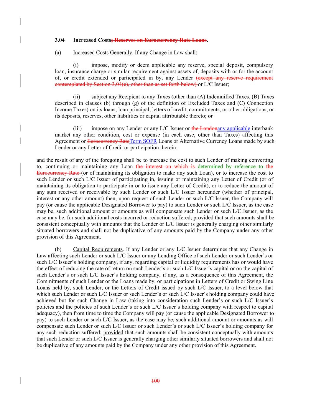 3.04 Increased Costs; Reserves on Eurocurrency Rate Loans. (a) Increased Costs Generally. If any Change in Law shall: (i) impose, modify or deem applicable any reserve, special deposit, compulsory loan, insurance charge or similar requirement against assets of, deposits with or for the account of, or credit extended or participated in by, any Lender (except any reserve requirement contemplated by Section 3.04(e), other than as set forth below) or L/C Issuer; (ii) subject any Recipient to any Taxes (other than (A) Indemnified Taxes, (B) Taxes described in clauses (b) through (g) of the definition of Excluded Taxes and (C) Connection Income Taxes) on its loans, loan principal, letters of credit, commitments, or other obligations, or its deposits, reserves, other liabilities or capital attributable thereto; or (iii) impose on any Lender or any L/C Issuer or the Londonany applicable interbank market any other condition, cost or expense (in each case, other than Taxes) affecting this Agreement or Eurocurrency RateTerm SOFR Loans or Alternative Currency Loans made by such Lender or any Letter of Credit or participation therein; and the result of any of the foregoing shall be to increase the cost to such Lender of making converting to, continuing or maintaining any Loan the interest on which is determined by reference to the Eurocurrency Rate (or of maintaining its obligation to make any such Loan), or to increase the cost to such Lender or such L/C Issuer of participating in, issuing or maintaining any Letter of Credit (or of maintaining its obligation to participate in or to issue any Letter of Credit), or to reduce the amount of any sum received or receivable by such Lender or such L/C Issuer hereunder (whether of principal, interest or any other amount) then, upon request of such Lender or such L/C Issuer, the Company will pay (or cause the applicable Designated Borrower to pay) to such Lender or such L/C Issuer, as the case may be, such additional amount or amounts as will compensate such Lender or such L/C Issuer, as the case may be, for such additional costs incurred or reduction suffered; provided that such amounts shall be consistent conceptually with amounts that the Lender or L/C Issuer is generally charging other similarly situated borrowers and shall not be duplicative of any amounts paid by the Company under any other provision of this Agreement. (b) Capital Requirements. If any Lender or any L/C Issuer determines that any Change in Law affecting such Lender or such L/C Issuer or any Lending Office of such Lender or such Lender’s or such L/C Issuer’s holding company, if any, regarding capital or liquidity requirements has or would have the effect of reducing the rate of return on such Lender’s or such L/C Issuer’s capital or on the capital of such Lender’s or such L/C Issuer’s holding company, if any, as a consequence of this Agreement, the Commitments of such Lender or the Loans made by, or participations in Letters of Credit or Swing Line Loans held by, such Lender, or the Letters of Credit issued by such L/C Issuer, to a level below that which such Lender or such L/C Issuer or such Lender’s or such L/C Issuer’s holding company could have achieved but for such Change in Law (taking into consideration such Lender’s or such L/C Issuer’s policies and the policies of such Lender’s or such L/C Issuer’s holding company with respect to capital adequacy), then from time to time the Company will pay (or cause the applicable Designated Borrower to pay) to such Lender or such L/C Issuer, as the case may be, such additional amount or amounts as will compensate such Lender or such L/C Issuer or such Lender’s or such L/C Issuer’s holding company for any such reduction suffered; provided that such amounts shall be consistent conceptually with amounts that such Lender or such L/C Issuer is generally charging other similarly situated borrowers and shall not be duplicative of any amounts paid by the Company under any other provision of this Agreement. 100