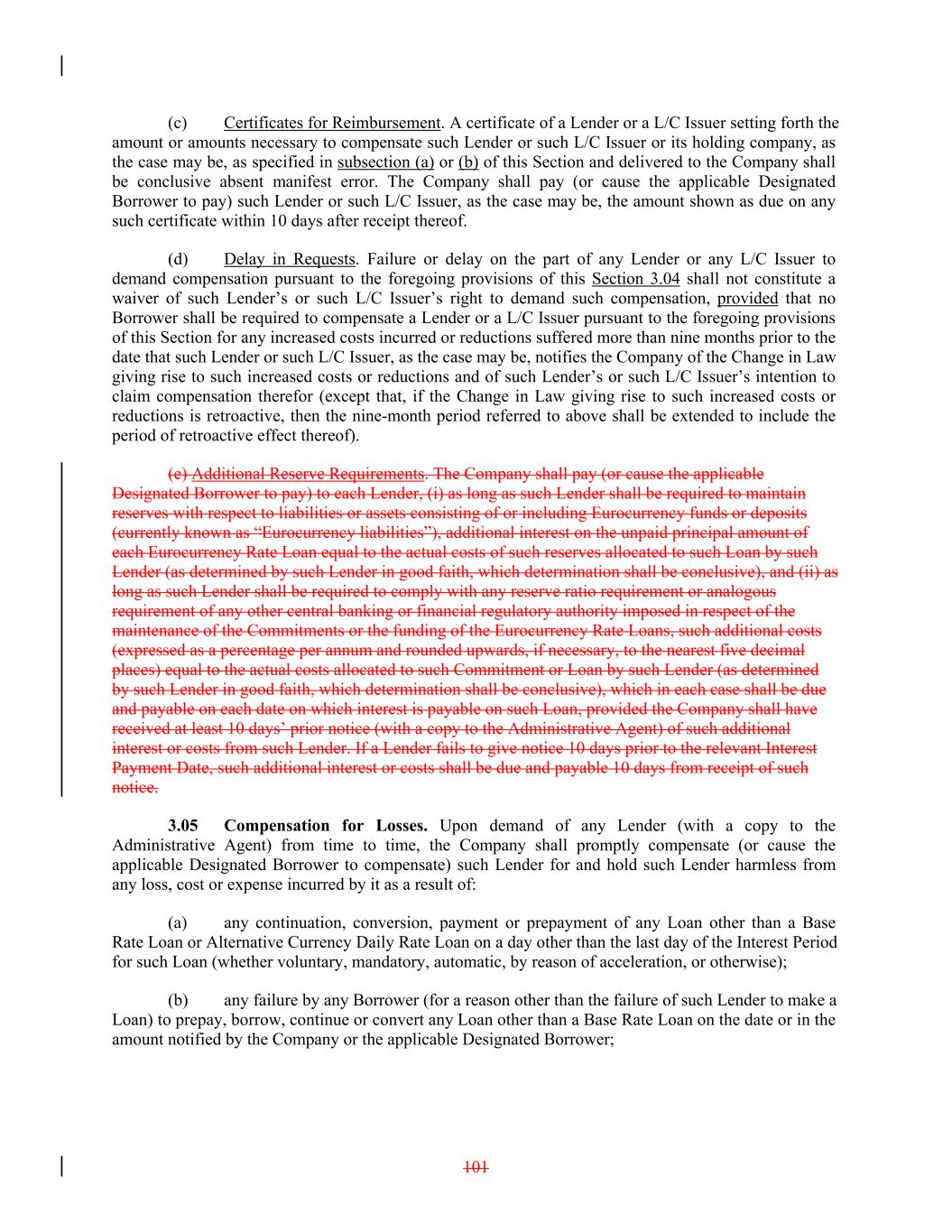 (c) Certificates for Reimbursement. A certificate of a Lender or a L/C Issuer setting forth the amount or amounts necessary to compensate such Lender or such L/C Issuer or its holding company, as the case may be, as specified in subsection (a) or (b) of this Section and delivered to the Company shall be conclusive absent manifest error. The Company shall pay (or cause the applicable Designated Borrower to pay) such Lender or such L/C Issuer, as the case may be, the amount shown as due on any such certificate within 10 days after receipt thereof. (d) Delay in Requests. Failure or delay on the part of any Lender or any L/C Issuer to demand compensation pursuant to the foregoing provisions of this Section 3.04 shall not constitute a waiver of such Lender’s or such L/C Issuer’s right to demand such compensation, provided that no Borrower shall be required to compensate a Lender or a L/C Issuer pursuant to the foregoing provisions of this Section for any increased costs incurred or reductions suffered more than nine months prior to the date that such Lender or such L/C Issuer, as the case may be, notifies the Company of the Change in Law giving rise to such increased costs or reductions and of such Lender’s or such L/C Issuer’s intention to claim compensation therefor (except that, if the Change in Law giving rise to such increased costs or reductions is retroactive, then the nine-month period referred to above shall be extended to include the period of retroactive effect thereof). (e) Additional Reserve Requirements. The Company shall pay (or cause the applicable Designated Borrower to pay) to each Lender, (i) as long as such Lender shall be required to maintain reserves with respect to liabilities or assets consisting of or including Eurocurrency funds or deposits (currently known as “Eurocurrency liabilities”), additional interest on the unpaid principal amount of each Eurocurrency Rate Loan equal to the actual costs of such reserves allocated to such Loan by such Lender (as determined by such Lender in good faith, which determination shall be conclusive), and (ii) as long as such Lender shall be required to comply with any reserve ratio requirement or analogous requirement of any other central banking or financial regulatory authority imposed in respect of the maintenance of the Commitments or the funding of the Eurocurrency Rate Loans, such additional costs (expressed as a percentage per annum and rounded upwards, if necessary, to the nearest five decimal places) equal to the actual costs allocated to such Commitment or Loan by such Lender (as determined by such Lender in good faith, which determination shall be conclusive), which in each case shall be due and payable on each date on which interest is payable on such Loan, provided the Company shall have received at least 10 days’ prior notice (with a copy to the Administrative Agent) of such additional interest or costs from such Lender. If a Lender fails to give notice 10 days prior to the relevant Interest Payment Date, such additional interest or costs shall be due and payable 10 days from receipt of such notice. 3.05 Compensation for Losses. Upon demand of any Lender (with a copy to the Administrative Agent) from time to time, the Company shall promptly compensate (or cause the applicable Designated Borrower to compensate) such Lender for and hold such Lender harmless from any loss, cost or expense incurred by it as a result of: (a) any continuation, conversion, payment or prepayment of any Loan other than a Base Rate Loan or Alternative Currency Daily Rate Loan on a day other than the last day of the Interest Period for such Loan (whether voluntary, mandatory, automatic, by reason of acceleration, or otherwise); (b) any failure by any Borrower (for a reason other than the failure of such Lender to make a Loan) to prepay, borrow, continue or convert any Loan other than a Base Rate Loan on the date or in the amount notified by the Company or the applicable Designated Borrower; 101