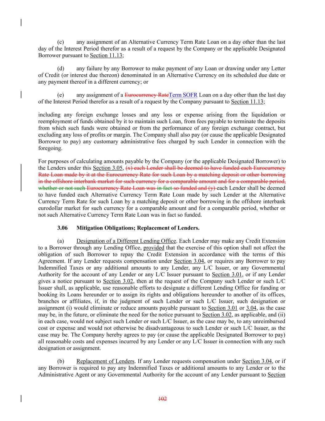 (c) any assignment of an Alternative Currency Term Rate Loan on a day other than the last day of the Interest Period therefor as a result of a request by the Company or the applicable Designated Borrower pursuant to Section 11.13; (d) any failure by any Borrower to make payment of any Loan or drawing under any Letter of Credit (or interest due thereon) denominated in an Alternative Currency on its scheduled due date or any payment thereof in a different currency; or (e) any assignment of a Eurocurrency RateTerm SOFR Loan on a day other than the last day of the Interest Period therefor as a result of a request by the Company pursuant to Section 11.13; including any foreign exchange losses and any loss or expense arising from the liquidation or reemployment of funds obtained by it to maintain such Loan, from fees payable to terminate the deposits from which such funds were obtained or from the performance of any foreign exchange contract, but excluding any loss of profits or margin. The Company shall also pay (or cause the applicable Designated Borrower to pay) any customary administrative fees charged by such Lender in connection with the foregoing. For purposes of calculating amounts payable by the Company (or the applicable Designated Borrower) to the Lenders under this Section 3.05, (x) each Lender shall be deemed to have funded each Eurocurrency Rate Loan made by it at the Eurocurrency Rate for such Loan by a matching deposit or other borrowing in the offshore interbank market for such currency for a comparable amount and for a comparable period, whether or not such Eurocurrency Rate Loan was in fact so funded and (y) each Lender shall be deemed to have funded each Alternative Currency Term Rate Loan made by such Lender at the Alternative Currency Term Rate for such Loan by a matching deposit or other borrowing in the offshore interbank eurodollar market for such currency for a comparable amount and for a comparable period, whether or not such Alternative Currency Term Rate Loan was in fact so funded. 3.06 Mitigation Obligations; Replacement of Lenders. (a) Designation of a Different Lending Office. Each Lender may make any Credit Extension to a Borrower through any Lending Office, provided that the exercise of this option shall not affect the obligation of such Borrower to repay the Credit Extension in accordance with the terms of this Agreement. If any Lender requests compensation under Section 3.04, or requires any Borrower to pay Indemnified Taxes or any additional amounts to any Lender, any L/C Issuer, or any Governmental Authority for the account of any Lender or any L/C Issuer pursuant to Section 3.01, or if any Lender gives a notice pursuant to Section 3.02, then at the request of the Company such Lender or such L/C Issuer shall, as applicable, use reasonable efforts to designate a different Lending Office for funding or booking its Loans hereunder or to assign its rights and obligations hereunder to another of its offices, branches or affiliates, if, in the judgment of such Lender or such L/C Issuer, such designation or assignment (i) would eliminate or reduce amounts payable pursuant to Section 3.01 or 3.04, as the case may be, in the future, or eliminate the need for the notice pursuant to Section 3.02, as applicable, and (ii) in each case, would not subject such Lender or such L/C Issuer, as the case may be, to any unreimbursed cost or expense and would not otherwise be disadvantageous to such Lender or such L/C Issuer, as the case may be. The Company hereby agrees to pay (or cause the applicable Designated Borrower to pay) all reasonable costs and expenses incurred by any Lender or any L/C Issuer in connection with any such designation or assignment. (b) Replacement of Lenders. If any Lender requests compensation under Section 3.04, or if any Borrower is required to pay any Indemnified Taxes or additional amounts to any Lender or to the Administrative Agent or any Governmental Authority for the account of any Lender pursuant to Section 102