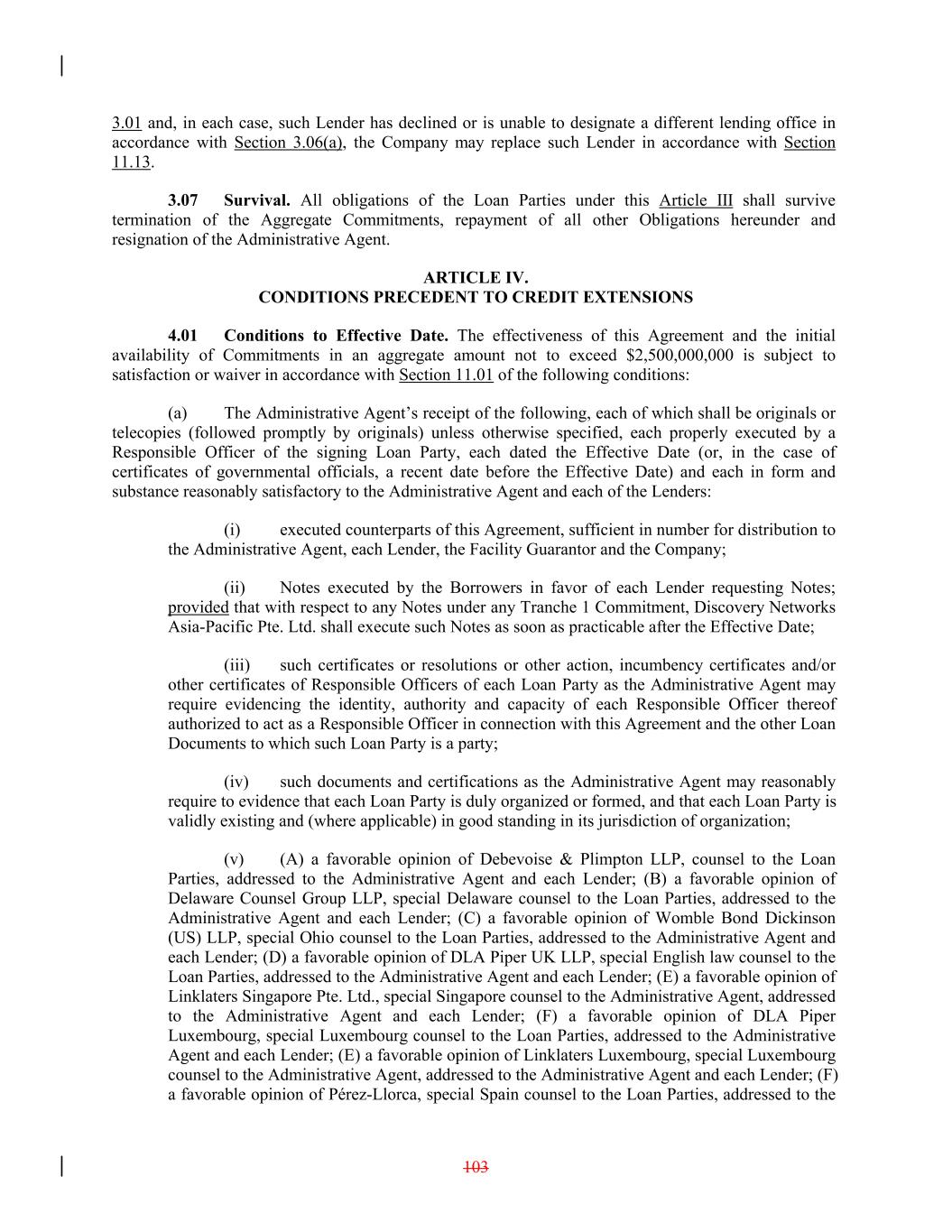 3.01 and, in each case, such Lender has declined or is unable to designate a different lending office in accordance with Section 3.06(a), the Company may replace such Lender in accordance with Section 11.13. 3.07 Survival. All obligations of the Loan Parties under this Article III shall survive termination of the Aggregate Commitments, repayment of all other Obligations hereunder and resignation of the Administrative Agent. ARTICLE IV. CONDITIONS PRECEDENT TO CREDIT EXTENSIONS 4.01 Conditions to Effective Date. The effectiveness of this Agreement and the initial availability of Commitments in an aggregate amount not to exceed $2,500,000,000 is subject to satisfaction or waiver in accordance with Section 11.01 of the following conditions: (a) The Administrative Agent’s receipt of the following, each of which shall be originals or telecopies (followed promptly by originals) unless otherwise specified, each properly executed by a Responsible Officer of the signing Loan Party, each dated the Effective Date (or, in the case of certificates of governmental officials, a recent date before the Effective Date) and each in form and substance reasonably satisfactory to the Administrative Agent and each of the Lenders: (i) executed counterparts of this Agreement, sufficient in number for distribution to the Administrative Agent, each Lender, the Facility Guarantor and the Company; (ii) Notes executed by the Borrowers in favor of each Lender requesting Notes; provided that with respect to any Notes under any Tranche 1 Commitment, Discovery Networks Asia-Pacific Pte. Ltd. shall execute such Notes as soon as practicable after the Effective Date; (iii) such certificates or resolutions or other action, incumbency certificates and/or other certificates of Responsible Officers of each Loan Party as the Administrative Agent may require evidencing the identity, authority and capacity of each Responsible Officer thereof authorized to act as a Responsible Officer in connection with this Agreement and the other Loan Documents to which such Loan Party is a party; (iv) such documents and certifications as the Administrative Agent may reasonably require to evidence that each Loan Party is duly organized or formed, and that each Loan Party is validly existing and (where applicable) in good standing in its jurisdiction of organization; (v) (A) a favorable opinion of Debevoise & Plimpton LLP, counsel to the Loan Parties, addressed to the Administrative Agent and each Lender; (B) a favorable opinion of Delaware Counsel Group LLP, special Delaware counsel to the Loan Parties, addressed to the Administrative Agent and each Lender; (C) a favorable opinion of Womble Bond Dickinson (US) LLP, special Ohio counsel to the Loan Parties, addressed to the Administrative Agent and each Lender; (D) a favorable opinion of DLA Piper UK LLP, special English law counsel to the Loan Parties, addressed to the Administrative Agent and each Lender; (E) a favorable opinion of Linklaters Singapore Pte. Ltd., special Singapore counsel to the Administrative Agent, addressed to the Administrative Agent and each Lender; (F) a favorable opinion of DLA Piper Luxembourg, special Luxembourg counsel to the Loan Parties, addressed to the Administrative Agent and each Lender; (E) a favorable opinion of Linklaters Luxembourg, special Luxembourg counsel to the Administrative Agent, addressed to the Administrative Agent and each Lender; (F) a favorable opinion of Pérez-Llorca, special Spain counsel to the Loan Parties, addressed to the 103