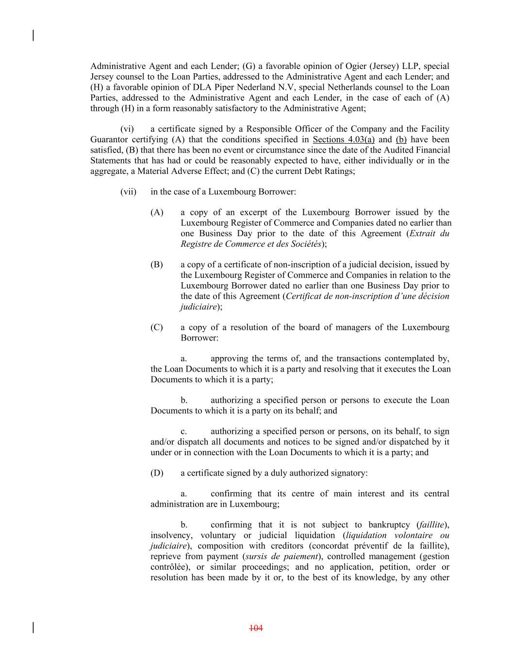Administrative Agent and each Lender; (G) a favorable opinion of Ogier (Jersey) LLP, special Jersey counsel to the Loan Parties, addressed to the Administrative Agent and each Lender; and (H) a favorable opinion of DLA Piper Nederland N.V, special Netherlands counsel to the Loan Parties, addressed to the Administrative Agent and each Lender, in the case of each of (A) through (H) in a form reasonably satisfactory to the Administrative Agent; (vi) a certificate signed by a Responsible Officer of the Company and the Facility Guarantor certifying (A) that the conditions specified in Sections 4.03(a) and (b) have been satisfied, (B) that there has been no event or circumstance since the date of the Audited Financial Statements that has had or could be reasonably expected to have, either individually or in the aggregate, a Material Adverse Effect; and (C) the current Debt Ratings; (vii) in the case of a Luxembourg Borrower: (A) a copy of an excerpt of the Luxembourg Borrower issued by the Luxembourg Register of Commerce and Companies dated no earlier than one Business Day prior to the date of this Agreement (Extrait du Registre de Commerce et des Sociétés); (B) a copy of a certificate of non-inscription of a judicial decision, issued by the Luxembourg Register of Commerce and Companies in relation to the Luxembourg Borrower dated no earlier than one Business Day prior to the date of this Agreement (Certificat de non-inscription d’une décision judiciaire); (C) a copy of a resolution of the board of managers of the Luxembourg Borrower: a. approving the terms of, and the transactions contemplated by, the Loan Documents to which it is a party and resolving that it executes the Loan Documents to which it is a party; b. authorizing a specified person or persons to execute the Loan Documents to which it is a party on its behalf; and c. authorizing a specified person or persons, on its behalf, to sign and/or dispatch all documents and notices to be signed and/or dispatched by it under or in connection with the Loan Documents to which it is a party; and (D) a certificate signed by a duly authorized signatory: a. confirming that its centre of main interest and its central administration are in Luxembourg; b. confirming that it is not subject to bankruptcy (faillite), insolvency, voluntary or judicial liquidation (liquidation volontaire ou judiciaire), composition with creditors (concordat préventif de la faillite), reprieve from payment (sursis de paiement), controlled management (gestion contrôlée), or similar proceedings; and no application, petition, order or resolution has been made by it or, to the best of its knowledge, by any other 104