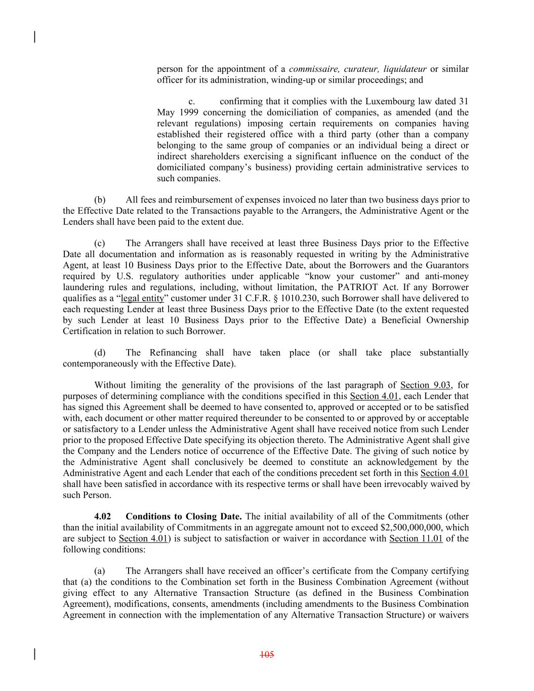 person for the appointment of a commissaire, curateur, liquidateur or similar officer for its administration, winding-up or similar proceedings; and c. confirming that it complies with the Luxembourg law dated 31 May 1999 concerning the domiciliation of companies, as amended (and the relevant regulations) imposing certain requirements on companies having established their registered office with a third party (other than a company belonging to the same group of companies or an individual being a direct or indirect shareholders exercising a significant influence on the conduct of the domiciliated company’s business) providing certain administrative services to such companies. (b) All fees and reimbursement of expenses invoiced no later than two business days prior to the Effective Date related to the Transactions payable to the Arrangers, the Administrative Agent or the Lenders shall have been paid to the extent due. (c) The Arrangers shall have received at least three Business Days prior to the Effective Date all documentation and information as is reasonably requested in writing by the Administrative Agent, at least 10 Business Days prior to the Effective Date, about the Borrowers and the Guarantors required by U.S. regulatory authorities under applicable “know your customer” and anti-money laundering rules and regulations, including, without limitation, the PATRIOT Act. If any Borrower qualifies as a “legal entity” customer under 31 C.F.R. § 1010.230, such Borrower shall have delivered to each requesting Lender at least three Business Days prior to the Effective Date (to the extent requested by such Lender at least 10 Business Days prior to the Effective Date) a Beneficial Ownership Certification in relation to such Borrower. (d) The Refinancing shall have taken place (or shall take place substantially contemporaneously with the Effective Date). Without limiting the generality of the provisions of the last paragraph of Section 9.03, for purposes of determining compliance with the conditions specified in this Section 4.01, each Lender that has signed this Agreement shall be deemed to have consented to, approved or accepted or to be satisfied with, each document or other matter required thereunder to be consented to or approved by or acceptable or satisfactory to a Lender unless the Administrative Agent shall have received notice from such Lender prior to the proposed Effective Date specifying its objection thereto. The Administrative Agent shall give the Company and the Lenders notice of occurrence of the Effective Date. The giving of such notice by the Administrative Agent shall conclusively be deemed to constitute an acknowledgement by the Administrative Agent and each Lender that each of the conditions precedent set forth in this Section 4.01 shall have been satisfied in accordance with its respective terms or shall have been irrevocably waived by such Person. 4.02 Conditions to Closing Date. The initial availability of all of the Commitments (other than the initial availability of Commitments in an aggregate amount not to exceed $2,500,000,000, which are subject to Section 4.01) is subject to satisfaction or waiver in accordance with Section 11.01 of the following conditions: (a) The Arrangers shall have received an officer’s certificate from the Company certifying that (a) the conditions to the Combination set forth in the Business Combination Agreement (without giving effect to any Alternative Transaction Structure (as defined in the Business Combination Agreement), modifications, consents, amendments (including amendments to the Business Combination Agreement in connection with the implementation of any Alternative Transaction Structure) or waivers 105