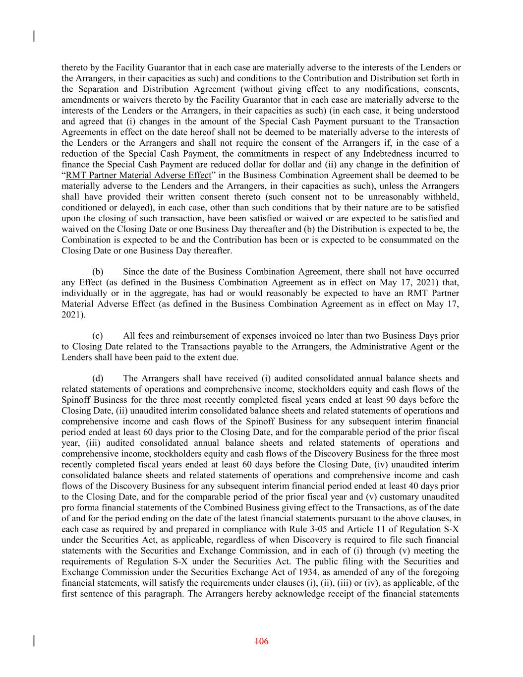 thereto by the Facility Guarantor that in each case are materially adverse to the interests of the Lenders or the Arrangers, in their capacities as such) and conditions to the Contribution and Distribution set forth in the Separation and Distribution Agreement (without giving effect to any modifications, consents, amendments or waivers thereto by the Facility Guarantor that in each case are materially adverse to the interests of the Lenders or the Arrangers, in their capacities as such) (in each case, it being understood and agreed that (i) changes in the amount of the Special Cash Payment pursuant to the Transaction Agreements in effect on the date hereof shall not be deemed to be materially adverse to the interests of the Lenders or the Arrangers and shall not require the consent of the Arrangers if, in the case of a reduction of the Special Cash Payment, the commitments in respect of any Indebtedness incurred to finance the Special Cash Payment are reduced dollar for dollar and (ii) any change in the definition of “RMT Partner Material Adverse Effect” in the Business Combination Agreement shall be deemed to be materially adverse to the Lenders and the Arrangers, in their capacities as such), unless the Arrangers shall have provided their written consent thereto (such consent not to be unreasonably withheld, conditioned or delayed), in each case, other than such conditions that by their nature are to be satisfied upon the closing of such transaction, have been satisfied or waived or are expected to be satisfied and waived on the Closing Date or one Business Day thereafter and (b) the Distribution is expected to be, the Combination is expected to be and the Contribution has been or is expected to be consummated on the Closing Date or one Business Day thereafter. (b) Since the date of the Business Combination Agreement, there shall not have occurred any Effect (as defined in the Business Combination Agreement as in effect on May 17, 2021) that, individually or in the aggregate, has had or would reasonably be expected to have an RMT Partner Material Adverse Effect (as defined in the Business Combination Agreement as in effect on May 17, 2021). (c) All fees and reimbursement of expenses invoiced no later than two Business Days prior to Closing Date related to the Transactions payable to the Arrangers, the Administrative Agent or the Lenders shall have been paid to the extent due. (d) The Arrangers shall have received (i) audited consolidated annual balance sheets and related statements of operations and comprehensive income, stockholders equity and cash flows of the Spinoff Business for the three most recently completed fiscal years ended at least 90 days before the Closing Date, (ii) unaudited interim consolidated balance sheets and related statements of operations and comprehensive income and cash flows of the Spinoff Business for any subsequent interim financial period ended at least 60 days prior to the Closing Date, and for the comparable period of the prior fiscal year, (iii) audited consolidated annual balance sheets and related statements of operations and comprehensive income, stockholders equity and cash flows of the Discovery Business for the three most recently completed fiscal years ended at least 60 days before the Closing Date, (iv) unaudited interim consolidated balance sheets and related statements of operations and comprehensive income and cash flows of the Discovery Business for any subsequent interim financial period ended at least 40 days prior to the Closing Date, and for the comparable period of the prior fiscal year and (v) customary unaudited pro forma financial statements of the Combined Business giving effect to the Transactions, as of the date of and for the period ending on the date of the latest financial statements pursuant to the above clauses, in each case as required by and prepared in compliance with Rule 3-05 and Article 11 of Regulation S-X under the Securities Act, as applicable, regardless of when Discovery is required to file such financial statements with the Securities and Exchange Commission, and in each of (i) through (v) meeting the requirements of Regulation S-X under the Securities Act. The public filing with the Securities and Exchange Commission under the Securities Exchange Act of 1934, as amended of any of the foregoing financial statements, will satisfy the requirements under clauses (i), (ii), (iii) or (iv), as applicable, of the first sentence of this paragraph. The Arrangers hereby acknowledge receipt of the financial statements 106