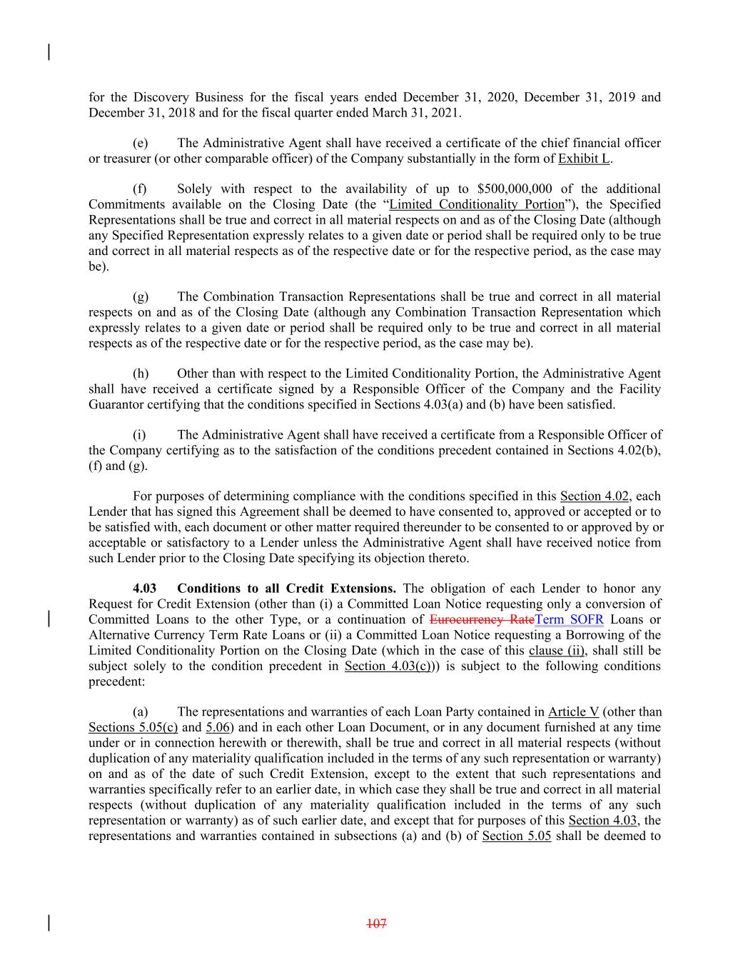 for the Discovery Business for the fiscal years ended December 31, 2020, December 31, 2019 and December 31, 2018 and for the fiscal quarter ended March 31, 2021. (e) The Administrative Agent shall have received a certificate of the chief financial officer or treasurer (or other comparable officer) of the Company substantially in the form of Exhibit L. (f) Solely with respect to the availability of up to $500,000,000 of the additional Commitments available on the Closing Date (the “Limited Conditionality Portion”), the Specified Representations shall be true and correct in all material respects on and as of the Closing Date (although any Specified Representation expressly relates to a given date or period shall be required only to be true and correct in all material respects as of the respective date or for the respective period, as the case may be). (g) The Combination Transaction Representations shall be true and correct in all material respects on and as of the Closing Date (although any Combination Transaction Representation which expressly relates to a given date or period shall be required only to be true and correct in all material respects as of the respective date or for the respective period, as the case may be). (h) Other than with respect to the Limited Conditionality Portion, the Administrative Agent shall have received a certificate signed by a Responsible Officer of the Company and the Facility Guarantor certifying that the conditions specified in Sections 4.03(a) and (b) have been satisfied. (i) The Administrative Agent shall have received a certificate from a Responsible Officer of the Company certifying as to the satisfaction of the conditions precedent contained in Sections 4.02(b), (f) and (g). For purposes of determining compliance with the conditions specified in this Section 4.02, each Lender that has signed this Agreement shall be deemed to have consented to, approved or accepted or to be satisfied with, each document or other matter required thereunder to be consented to or approved by or acceptable or satisfactory to a Lender unless the Administrative Agent shall have received notice from such Lender prior to the Closing Date specifying its objection thereto. 4.03 Conditions to all Credit Extensions. The obligation of each Lender to honor any Request for Credit Extension (other than (i) a Committed Loan Notice requesting only a conversion of Committed Loans to the other Type, or a continuation of Eurocurrency RateTerm SOFR Loans or Alternative Currency Term Rate Loans or (ii) a Committed Loan Notice requesting a Borrowing of the Limited Conditionality Portion on the Closing Date (which in the case of this clause (ii), shall still be subject solely to the condition precedent in Section 4.03(c))) is subject to the following conditions precedent: (a) The representations and warranties of each Loan Party contained in Article V (other than Sections 5.05(c) and 5.06) and in each other Loan Document, or in any document furnished at any time under or in connection herewith or therewith, shall be true and correct in all material respects (without duplication of any materiality qualification included in the terms of any such representation or warranty) on and as of the date of such Credit Extension, except to the extent that such representations and warranties specifically refer to an earlier date, in which case they shall be true and correct in all material respects (without duplication of any materiality qualification included in the terms of any such representation or warranty) as of such earlier date, and except that for purposes of this Section 4.03, the representations and warranties contained in subsections (a) and (b) of Section 5.05 shall be deemed to 107