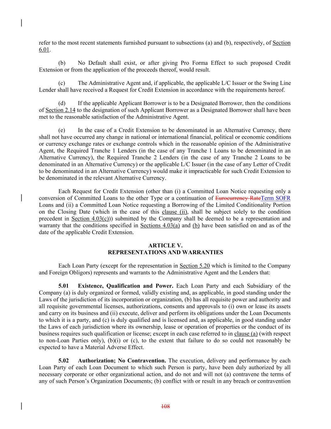 refer to the most recent statements furnished pursuant to subsections (a) and (b), respectively, of Section 6.01. (b) No Default shall exist, or after giving Pro Forma Effect to such proposed Credit Extension or from the application of the proceeds thereof, would result. (c) The Administrative Agent and, if applicable, the applicable L/C Issuer or the Swing Line Lender shall have received a Request for Credit Extension in accordance with the requirements hereof. (d) If the applicable Applicant Borrower is to be a Designated Borrower, then the conditions of Section 2.14 to the designation of such Applicant Borrower as a Designated Borrower shall have been met to the reasonable satisfaction of the Administrative Agent. (e) In the case of a Credit Extension to be denominated in an Alternative Currency, there shall not have occurred any change in national or international financial, political or economic conditions or currency exchange rates or exchange controls which in the reasonable opinion of the Administrative Agent, the Required Tranche 1 Lenders (in the case of any Tranche 1 Loans to be denominated in an Alternative Currency), the Required Tranche 2 Lenders (in the case of any Tranche 2 Loans to be denominated in an Alternative Currency) or the applicable L/C Issuer (in the case of any Letter of Credit to be denominated in an Alternative Currency) would make it impracticable for such Credit Extension to be denominated in the relevant Alternative Currency. Each Request for Credit Extension (other than (i) a Committed Loan Notice requesting only a conversion of Committed Loans to the other Type or a continuation of Eurocurrency RateTerm SOFR Loans and (ii) a Committed Loan Notice requesting a Borrowing of the Limited Conditionality Portion on the Closing Date (which in the case of this clause (ii), shall be subject solely to the condition precedent in Section 4.03(c))) submitted by the Company shall be deemed to be a representation and warranty that the conditions specified in Sections 4.03(a) and (b) have been satisfied on and as of the date of the applicable Credit Extension. ARTICLE V. REPRESENTATIONS AND WARRANTIES Each Loan Party (except for the representation in Section 5.20 which is limited to the Company and Foreign Obligors) represents and warrants to the Administrative Agent and the Lenders that: 5.01 Existence, Qualification and Power. Each Loan Party and each Subsidiary of the Company (a) is duly organized or formed, validly existing and, as applicable, in good standing under the Laws of the jurisdiction of its incorporation or organization, (b) has all requisite power and authority and all requisite governmental licenses, authorizations, consents and approvals to (i) own or lease its assets and carry on its business and (ii) execute, deliver and perform its obligations under the Loan Documents to which it is a party, and (c) is duly qualified and is licensed and, as applicable, in good standing under the Laws of each jurisdiction where its ownership, lease or operation of properties or the conduct of its business requires such qualification or license; except in each case referred to in clause (a) (with respect to non-Loan Parties only), (b)(i) or (c), to the extent that failure to do so could not reasonably be expected to have a Material Adverse Effect. 5.02 Authorization; No Contravention. The execution, delivery and performance by each Loan Party of each Loan Document to which such Person is party, have been duly authorized by all necessary corporate or other organizational action, and do not and will not (a) contravene the terms of any of such Person’s Organization Documents; (b) conflict with or result in any breach or contravention 108
