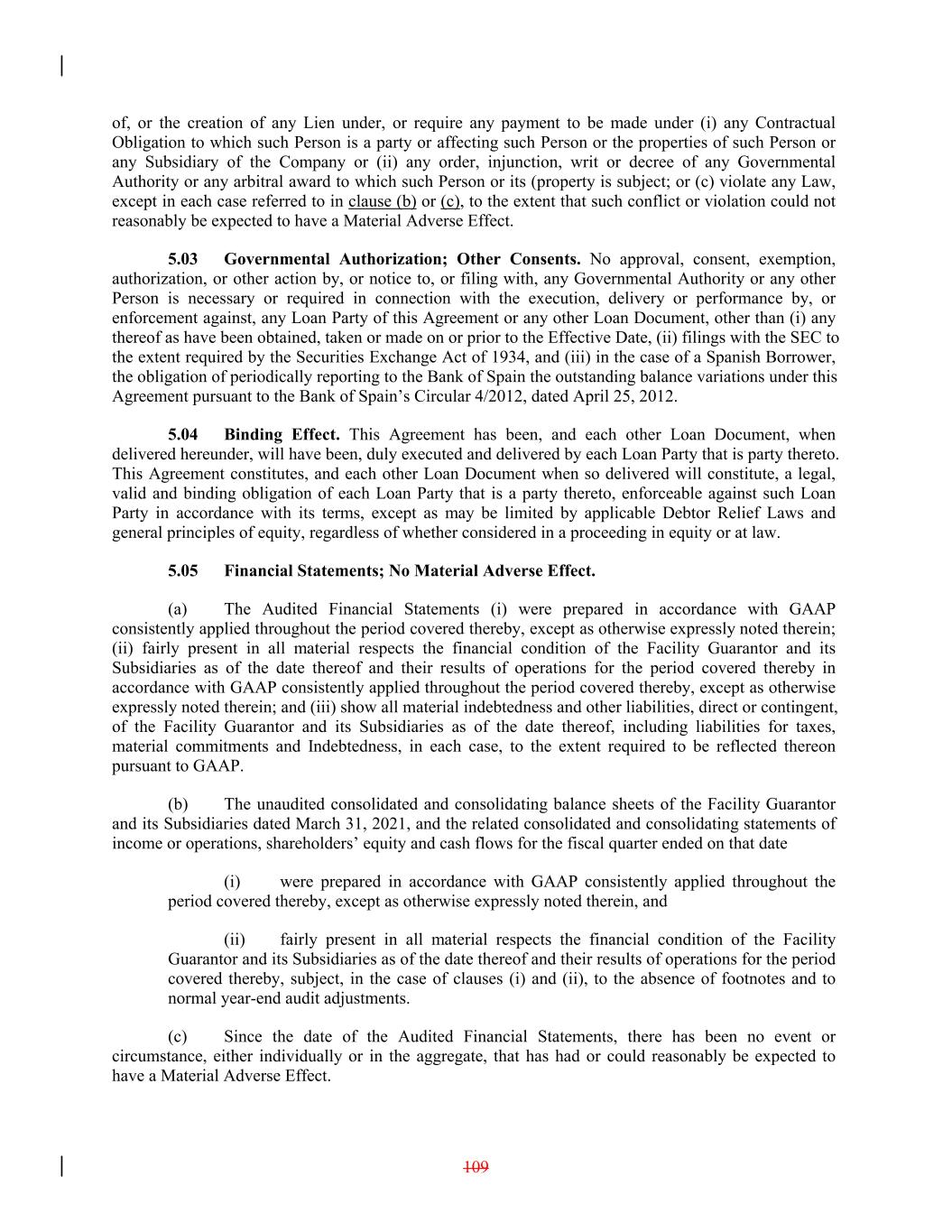 of, or the creation of any Lien under, or require any payment to be made under (i) any Contractual Obligation to which such Person is a party or affecting such Person or the properties of such Person or any Subsidiary of the Company or (ii) any order, injunction, writ or decree of any Governmental Authority or any arbitral award to which such Person or its (property is subject; or (c) violate any Law, except in each case referred to in clause (b) or (c), to the extent that such conflict or violation could not reasonably be expected to have a Material Adverse Effect. 5.03 Governmental Authorization; Other Consents. No approval, consent, exemption, authorization, or other action by, or notice to, or filing with, any Governmental Authority or any other Person is necessary or required in connection with the execution, delivery or performance by, or enforcement against, any Loan Party of this Agreement or any other Loan Document, other than (i) any thereof as have been obtained, taken or made on or prior to the Effective Date, (ii) filings with the SEC to the extent required by the Securities Exchange Act of 1934, and (iii) in the case of a Spanish Borrower, the obligation of periodically reporting to the Bank of Spain the outstanding balance variations under this Agreement pursuant to the Bank of Spain’s Circular 4/2012, dated April 25, 2012. 5.04 Binding Effect. This Agreement has been, and each other Loan Document, when delivered hereunder, will have been, duly executed and delivered by each Loan Party that is party thereto. This Agreement constitutes, and each other Loan Document when so delivered will constitute, a legal, valid and binding obligation of each Loan Party that is a party thereto, enforceable against such Loan Party in accordance with its terms, except as may be limited by applicable Debtor Relief Laws and general principles of equity, regardless of whether considered in a proceeding in equity or at law. 5.05 Financial Statements; No Material Adverse Effect. (a) The Audited Financial Statements (i) were prepared in accordance with GAAP consistently applied throughout the period covered thereby, except as otherwise expressly noted therein; (ii) fairly present in all material respects the financial condition of the Facility Guarantor and its Subsidiaries as of the date thereof and their results of operations for the period covered thereby in accordance with GAAP consistently applied throughout the period covered thereby, except as otherwise expressly noted therein; and (iii) show all material indebtedness and other liabilities, direct or contingent, of the Facility Guarantor and its Subsidiaries as of the date thereof, including liabilities for taxes, material commitments and Indebtedness, in each case, to the extent required to be reflected thereon pursuant to GAAP. (b) The unaudited consolidated and consolidating balance sheets of the Facility Guarantor and its Subsidiaries dated March 31, 2021, and the related consolidated and consolidating statements of income or operations, shareholders’ equity and cash flows for the fiscal quarter ended on that date (i) were prepared in accordance with GAAP consistently applied throughout the period covered thereby, except as otherwise expressly noted therein, and (ii) fairly present in all material respects the financial condition of the Facility Guarantor and its Subsidiaries as of the date thereof and their results of operations for the period covered thereby, subject, in the case of clauses (i) and (ii), to the absence of footnotes and to normal year-end audit adjustments. (c) Since the date of the Audited Financial Statements, there has been no event or circumstance, either individually or in the aggregate, that has had or could reasonably be expected to have a Material Adverse Effect. 109