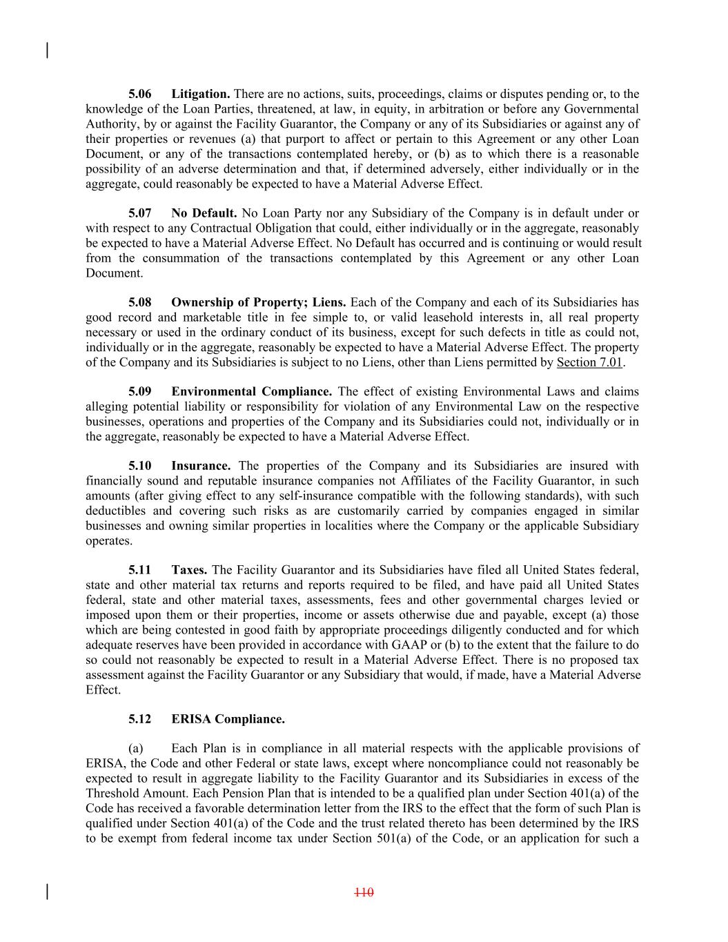 5.06 Litigation. There are no actions, suits, proceedings, claims or disputes pending or, to the knowledge of the Loan Parties, threatened, at law, in equity, in arbitration or before any Governmental Authority, by or against the Facility Guarantor, the Company or any of its Subsidiaries or against any of their properties or revenues (a) that purport to affect or pertain to this Agreement or any other Loan Document, or any of the transactions contemplated hereby, or (b) as to which there is a reasonable possibility of an adverse determination and that, if determined adversely, either individually or in the aggregate, could reasonably be expected to have a Material Adverse Effect. 5.07 No Default. No Loan Party nor any Subsidiary of the Company is in default under or with respect to any Contractual Obligation that could, either individually or in the aggregate, reasonably be expected to have a Material Adverse Effect. No Default has occurred and is continuing or would result from the consummation of the transactions contemplated by this Agreement or any other Loan Document. 5.08 Ownership of Property; Liens. Each of the Company and each of its Subsidiaries has good record and marketable title in fee simple to, or valid leasehold interests in, all real property necessary or used in the ordinary conduct of its business, except for such defects in title as could not, individually or in the aggregate, reasonably be expected to have a Material Adverse Effect. The property of the Company and its Subsidiaries is subject to no Liens, other than Liens permitted by Section 7.01. 5.09 Environmental Compliance. The effect of existing Environmental Laws and claims alleging potential liability or responsibility for violation of any Environmental Law on the respective businesses, operations and properties of the Company and its Subsidiaries could not, individually or in the aggregate, reasonably be expected to have a Material Adverse Effect. 5.10 Insurance. The properties of the Company and its Subsidiaries are insured with financially sound and reputable insurance companies not Affiliates of the Facility Guarantor, in such amounts (after giving effect to any self-insurance compatible with the following standards), with such deductibles and covering such risks as are customarily carried by companies engaged in similar businesses and owning similar properties in localities where the Company or the applicable Subsidiary operates. 5.11 Taxes. The Facility Guarantor and its Subsidiaries have filed all United States federal, state and other material tax returns and reports required to be filed, and have paid all United States federal, state and other material taxes, assessments, fees and other governmental charges levied or imposed upon them or their properties, income or assets otherwise due and payable, except (a) those which are being contested in good faith by appropriate proceedings diligently conducted and for which adequate reserves have been provided in accordance with GAAP or (b) to the extent that the failure to do so could not reasonably be expected to result in a Material Adverse Effect. There is no proposed tax assessment against the Facility Guarantor or any Subsidiary that would, if made, have a Material Adverse Effect. 5.12 ERISA Compliance. (a) Each Plan is in compliance in all material respects with the applicable provisions of ERISA, the Code and other Federal or state laws, except where noncompliance could not reasonably be expected to result in aggregate liability to the Facility Guarantor and its Subsidiaries in excess of the Threshold Amount. Each Pension Plan that is intended to be a qualified plan under Section 401(a) of the Code has received a favorable determination letter from the IRS to the effect that the form of such Plan is qualified under Section 401(a) of the Code and the trust related thereto has been determined by the IRS to be exempt from federal income tax under Section 501(a) of the Code, or an application for such a 110
