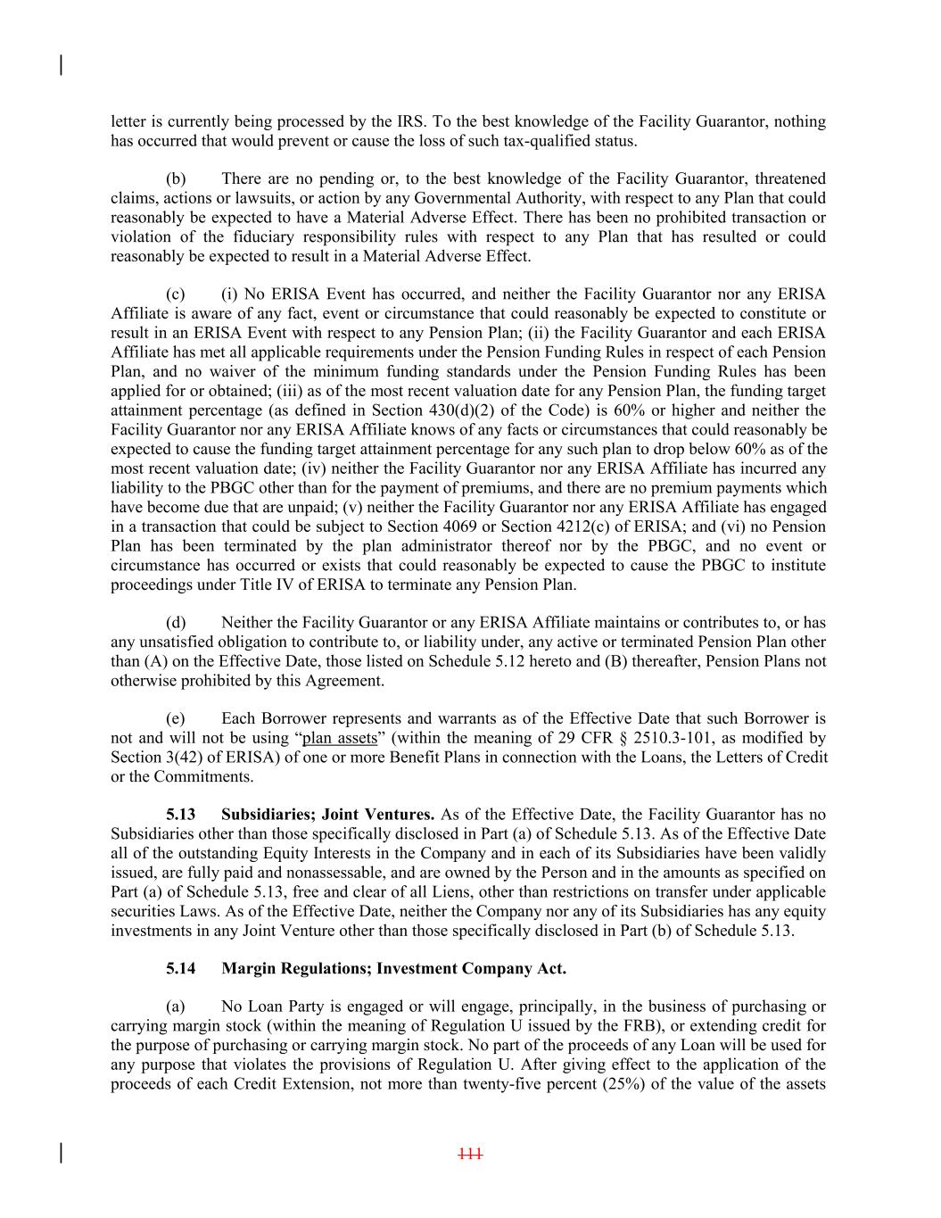 letter is currently being processed by the IRS. To the best knowledge of the Facility Guarantor, nothing has occurred that would prevent or cause the loss of such tax-qualified status. (b) There are no pending or, to the best knowledge of the Facility Guarantor, threatened claims, actions or lawsuits, or action by any Governmental Authority, with respect to any Plan that could reasonably be expected to have a Material Adverse Effect. There has been no prohibited transaction or violation of the fiduciary responsibility rules with respect to any Plan that has resulted or could reasonably be expected to result in a Material Adverse Effect. (c) (i) No ERISA Event has occurred, and neither the Facility Guarantor nor any ERISA Affiliate is aware of any fact, event or circumstance that could reasonably be expected to constitute or result in an ERISA Event with respect to any Pension Plan; (ii) the Facility Guarantor and each ERISA Affiliate has met all applicable requirements under the Pension Funding Rules in respect of each Pension Plan, and no waiver of the minimum funding standards under the Pension Funding Rules has been applied for or obtained; (iii) as of the most recent valuation date for any Pension Plan, the funding target attainment percentage (as defined in Section 430(d)(2) of the Code) is 60% or higher and neither the Facility Guarantor nor any ERISA Affiliate knows of any facts or circumstances that could reasonably be expected to cause the funding target attainment percentage for any such plan to drop below 60% as of the most recent valuation date; (iv) neither the Facility Guarantor nor any ERISA Affiliate has incurred any liability to the PBGC other than for the payment of premiums, and there are no premium payments which have become due that are unpaid; (v) neither the Facility Guarantor nor any ERISA Affiliate has engaged in a transaction that could be subject to Section 4069 or Section 4212(c) of ERISA; and (vi) no Pension Plan has been terminated by the plan administrator thereof nor by the PBGC, and no event or circumstance has occurred or exists that could reasonably be expected to cause the PBGC to institute proceedings under Title IV of ERISA to terminate any Pension Plan. (d) Neither the Facility Guarantor or any ERISA Affiliate maintains or contributes to, or has any unsatisfied obligation to contribute to, or liability under, any active or terminated Pension Plan other than (A) on the Effective Date, those listed on Schedule 5.12 hereto and (B) thereafter, Pension Plans not otherwise prohibited by this Agreement. (e) Each Borrower represents and warrants as of the Effective Date that such Borrower is not and will not be using “plan assets” (within the meaning of 29 CFR § 2510.3-101, as modified by Section 3(42) of ERISA) of one or more Benefit Plans in connection with the Loans, the Letters of Credit or the Commitments. 5.13 Subsidiaries; Joint Ventures. As of the Effective Date, the Facility Guarantor has no Subsidiaries other than those specifically disclosed in Part (a) of Schedule 5.13. As of the Effective Date all of the outstanding Equity Interests in the Company and in each of its Subsidiaries have been validly issued, are fully paid and nonassessable, and are owned by the Person and in the amounts as specified on Part (a) of Schedule 5.13, free and clear of all Liens, other than restrictions on transfer under applicable securities Laws. As of the Effective Date, neither the Company nor any of its Subsidiaries has any equity investments in any Joint Venture other than those specifically disclosed in Part (b) of Schedule 5.13. 5.14 Margin Regulations; Investment Company Act. (a) No Loan Party is engaged or will engage, principally, in the business of purchasing or carrying margin stock (within the meaning of Regulation U issued by the FRB), or extending credit for the purpose of purchasing or carrying margin stock. No part of the proceeds of any Loan will be used for any purpose that violates the provisions of Regulation U. After giving effect to the application of the proceeds of each Credit Extension, not more than twenty-five percent (25%) of the value of the assets 111
