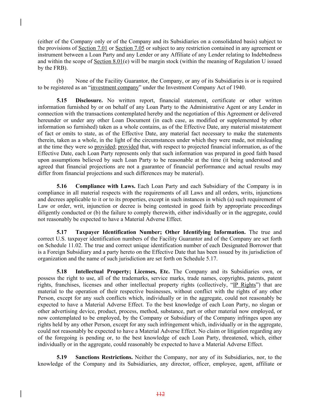 (either of the Company only or of the Company and its Subsidiaries on a consolidated basis) subject to the provisions of Section 7.01 or Section 7.05 or subject to any restriction contained in any agreement or instrument between a Loan Party and any Lender or any Affiliate of any Lender relating to Indebtedness and within the scope of Section 8.01(e) will be margin stock (within the meaning of Regulation U issued by the FRB). (b) None of the Facility Guarantor, the Company, or any of its Subsidiaries is or is required to be registered as an “investment company” under the Investment Company Act of 1940. 5.15 Disclosure. No written report, financial statement, certificate or other written information furnished by or on behalf of any Loan Party to the Administrative Agent or any Lender in connection with the transactions contemplated hereby and the negotiation of this Agreement or delivered hereunder or under any other Loan Document (in each case, as modified or supplemented by other information so furnished) taken as a whole contains, as of the Effective Date, any material misstatement of fact or omits to state, as of the Effective Date, any material fact necessary to make the statements therein, taken as a whole, in the light of the circumstances under which they were made, not misleading at the time they were so provided; provided that, with respect to projected financial information, as of the Effective Date, each Loan Party represents only that such information was prepared in good faith based upon assumptions believed by such Loan Party to be reasonable at the time (it being understood and agreed that financial projections are not a guarantee of financial performance and actual results may differ from financial projections and such differences may be material). 5.16 Compliance with Laws. Each Loan Party and each Subsidiary of the Company is in compliance in all material respects with the requirements of all Laws and all orders, writs, injunctions and decrees applicable to it or to its properties, except in such instances in which (a) such requirement of Law or order, writ, injunction or decree is being contested in good faith by appropriate proceedings diligently conducted or (b) the failure to comply therewith, either individually or in the aggregate, could not reasonably be expected to have a Material Adverse Effect. 5.17 Taxpayer Identification Number; Other Identifying Information. The true and correct U.S. taxpayer identification numbers of the Facility Guarantor and of the Company are set forth on Schedule 11.02. The true and correct unique identification number of each Designated Borrower that is a Foreign Subsidiary and a party hereto on the Effective Date that has been issued by its jurisdiction of organization and the name of such jurisdiction are set forth on Schedule 5.17. 5.18 Intellectual Property; Licenses, Etc. The Company and its Subsidiaries own, or possess the right to use, all of the trademarks, service marks, trade names, copyrights, patents, patent rights, franchises, licenses and other intellectual property rights (collectively, “IP Rights”) that are material to the operation of their respective businesses, without conflict with the rights of any other Person, except for any such conflicts which, individually or in the aggregate, could not reasonably be expected to have a Material Adverse Effect. To the best knowledge of each Loan Party, no slogan or other advertising device, product, process, method, substance, part or other material now employed, or now contemplated to be employed, by the Company or Subsidiary of the Company infringes upon any rights held by any other Person, except for any such infringement which, individually or in the aggregate, could not reasonably be expected to have a Material Adverse Effect. No claim or litigation regarding any of the foregoing is pending or, to the best knowledge of each Loan Party, threatened, which, either individually or in the aggregate, could reasonably be expected to have a Material Adverse Effect. 5.19 Sanctions Restrictions. Neither the Company, nor any of its Subsidiaries, nor, to the knowledge of the Company and its Subsidiaries, any director, officer, employee, agent, affiliate or 112