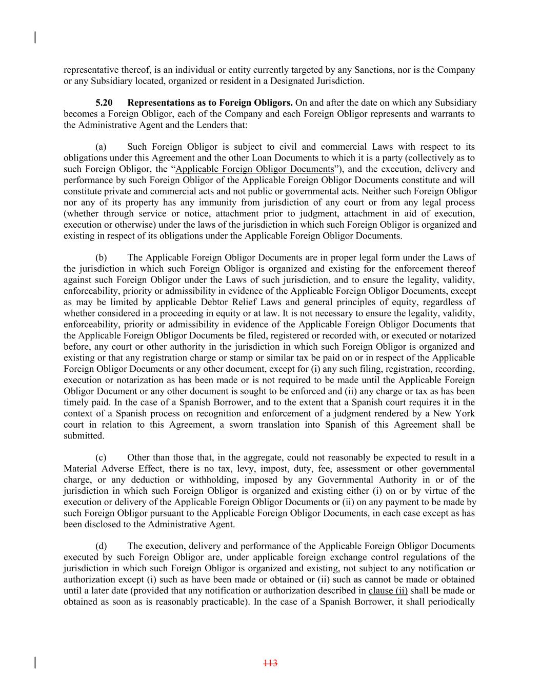 representative thereof, is an individual or entity currently targeted by any Sanctions, nor is the Company or any Subsidiary located, organized or resident in a Designated Jurisdiction. 5.20 Representations as to Foreign Obligors. On and after the date on which any Subsidiary becomes a Foreign Obligor, each of the Company and each Foreign Obligor represents and warrants to the Administrative Agent and the Lenders that: (a) Such Foreign Obligor is subject to civil and commercial Laws with respect to its obligations under this Agreement and the other Loan Documents to which it is a party (collectively as to such Foreign Obligor, the “Applicable Foreign Obligor Documents”), and the execution, delivery and performance by such Foreign Obligor of the Applicable Foreign Obligor Documents constitute and will constitute private and commercial acts and not public or governmental acts. Neither such Foreign Obligor nor any of its property has any immunity from jurisdiction of any court or from any legal process (whether through service or notice, attachment prior to judgment, attachment in aid of execution, execution or otherwise) under the laws of the jurisdiction in which such Foreign Obligor is organized and existing in respect of its obligations under the Applicable Foreign Obligor Documents. (b) The Applicable Foreign Obligor Documents are in proper legal form under the Laws of the jurisdiction in which such Foreign Obligor is organized and existing for the enforcement thereof against such Foreign Obligor under the Laws of such jurisdiction, and to ensure the legality, validity, enforceability, priority or admissibility in evidence of the Applicable Foreign Obligor Documents, except as may be limited by applicable Debtor Relief Laws and general principles of equity, regardless of whether considered in a proceeding in equity or at law. It is not necessary to ensure the legality, validity, enforceability, priority or admissibility in evidence of the Applicable Foreign Obligor Documents that the Applicable Foreign Obligor Documents be filed, registered or recorded with, or executed or notarized before, any court or other authority in the jurisdiction in which such Foreign Obligor is organized and existing or that any registration charge or stamp or similar tax be paid on or in respect of the Applicable Foreign Obligor Documents or any other document, except for (i) any such filing, registration, recording, execution or notarization as has been made or is not required to be made until the Applicable Foreign Obligor Document or any other document is sought to be enforced and (ii) any charge or tax as has been timely paid. In the case of a Spanish Borrower, and to the extent that a Spanish court requires it in the context of a Spanish process on recognition and enforcement of a judgment rendered by a New York court in relation to this Agreement, a sworn translation into Spanish of this Agreement shall be submitted. (c) Other than those that, in the aggregate, could not reasonably be expected to result in a Material Adverse Effect, there is no tax, levy, impost, duty, fee, assessment or other governmental charge, or any deduction or withholding, imposed by any Governmental Authority in or of the jurisdiction in which such Foreign Obligor is organized and existing either (i) on or by virtue of the execution or delivery of the Applicable Foreign Obligor Documents or (ii) on any payment to be made by such Foreign Obligor pursuant to the Applicable Foreign Obligor Documents, in each case except as has been disclosed to the Administrative Agent. (d) The execution, delivery and performance of the Applicable Foreign Obligor Documents executed by such Foreign Obligor are, under applicable foreign exchange control regulations of the jurisdiction in which such Foreign Obligor is organized and existing, not subject to any notification or authorization except (i) such as have been made or obtained or (ii) such as cannot be made or obtained until a later date (provided that any notification or authorization described in clause (ii) shall be made or obtained as soon as is reasonably practicable). In the case of a Spanish Borrower, it shall periodically 113