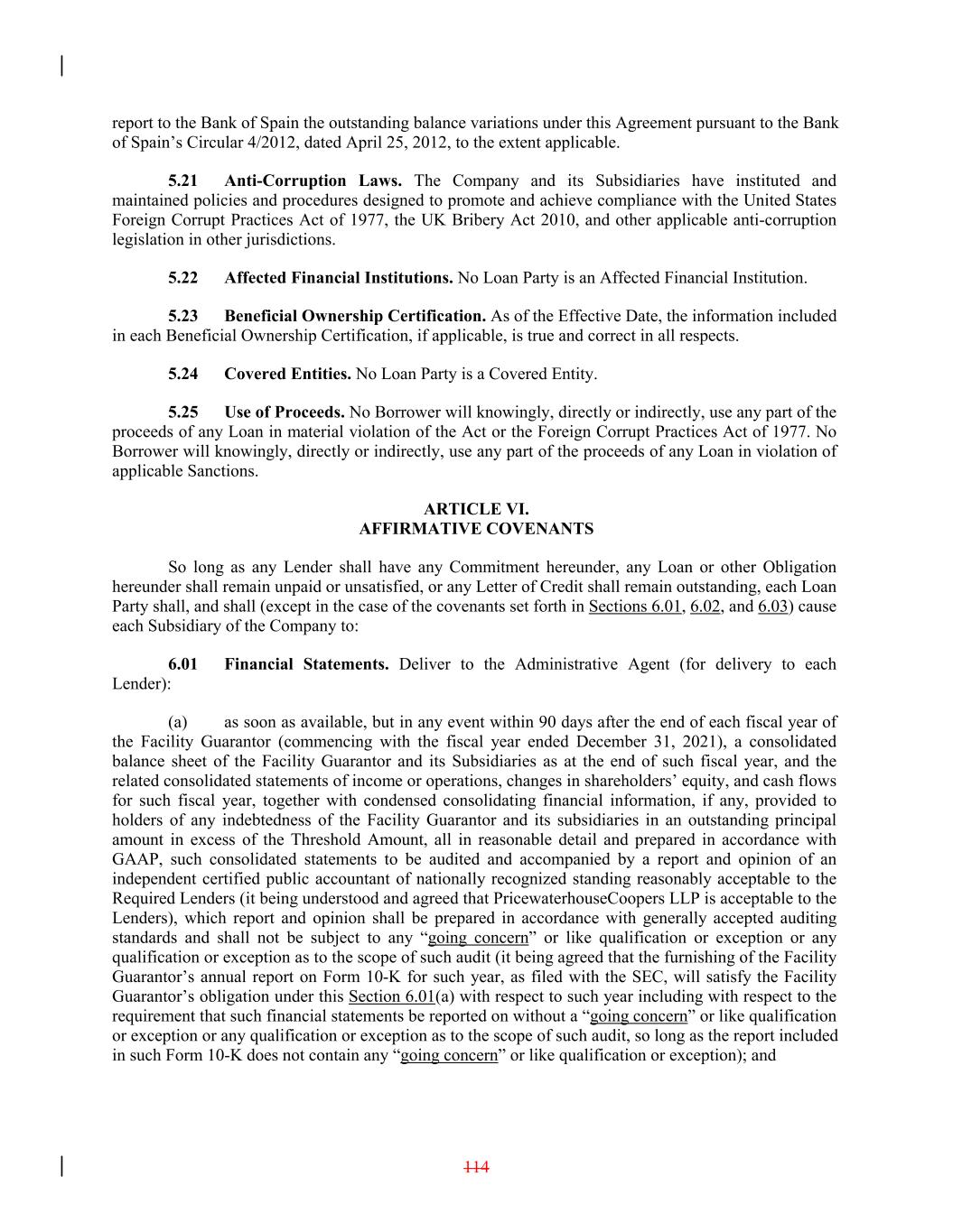 report to the Bank of Spain the outstanding balance variations under this Agreement pursuant to the Bank of Spain’s Circular 4/2012, dated April 25, 2012, to the extent applicable. 5.21 Anti-Corruption Laws. The Company and its Subsidiaries have instituted and maintained policies and procedures designed to promote and achieve compliance with the United States Foreign Corrupt Practices Act of 1977, the UK Bribery Act 2010, and other applicable anti-corruption legislation in other jurisdictions. 5.22 Affected Financial Institutions. No Loan Party is an Affected Financial Institution. 5.23 Beneficial Ownership Certification. As of the Effective Date, the information included in each Beneficial Ownership Certification, if applicable, is true and correct in all respects. 5.24 Covered Entities. No Loan Party is a Covered Entity. 5.25 Use of Proceeds. No Borrower will knowingly, directly or indirectly, use any part of the proceeds of any Loan in material violation of the Act or the Foreign Corrupt Practices Act of 1977. No Borrower will knowingly, directly or indirectly, use any part of the proceeds of any Loan in violation of applicable Sanctions. ARTICLE VI. AFFIRMATIVE COVENANTS So long as any Lender shall have any Commitment hereunder, any Loan or other Obligation hereunder shall remain unpaid or unsatisfied, or any Letter of Credit shall remain outstanding, each Loan Party shall, and shall (except in the case of the covenants set forth in Sections 6.01, 6.02, and 6.03) cause each Subsidiary of the Company to: 6.01 Financial Statements. Deliver to the Administrative Agent (for delivery to each Lender): (a) as soon as available, but in any event within 90 days after the end of each fiscal year of the Facility Guarantor (commencing with the fiscal year ended December 31, 2021), a consolidated balance sheet of the Facility Guarantor and its Subsidiaries as at the end of such fiscal year, and the related consolidated statements of income or operations, changes in shareholders’ equity, and cash flows for such fiscal year, together with condensed consolidating financial information, if any, provided to holders of any indebtedness of the Facility Guarantor and its subsidiaries in an outstanding principal amount in excess of the Threshold Amount, all in reasonable detail and prepared in accordance with GAAP, such consolidated statements to be audited and accompanied by a report and opinion of an independent certified public accountant of nationally recognized standing reasonably acceptable to the Required Lenders (it being understood and agreed that PricewaterhouseCoopers LLP is acceptable to the Lenders), which report and opinion shall be prepared in accordance with generally accepted auditing standards and shall not be subject to any “going concern” or like qualification or exception or any qualification or exception as to the scope of such audit (it being agreed that the furnishing of the Facility Guarantor’s annual report on Form 10-K for such year, as filed with the SEC, will satisfy the Facility Guarantor’s obligation under this Section 6.01(a) with respect to such year including with respect to the requirement that such financial statements be reported on without a “going concern” or like qualification or exception or any qualification or exception as to the scope of such audit, so long as the report included in such Form 10-K does not contain any “going concern” or like qualification or exception); and 114