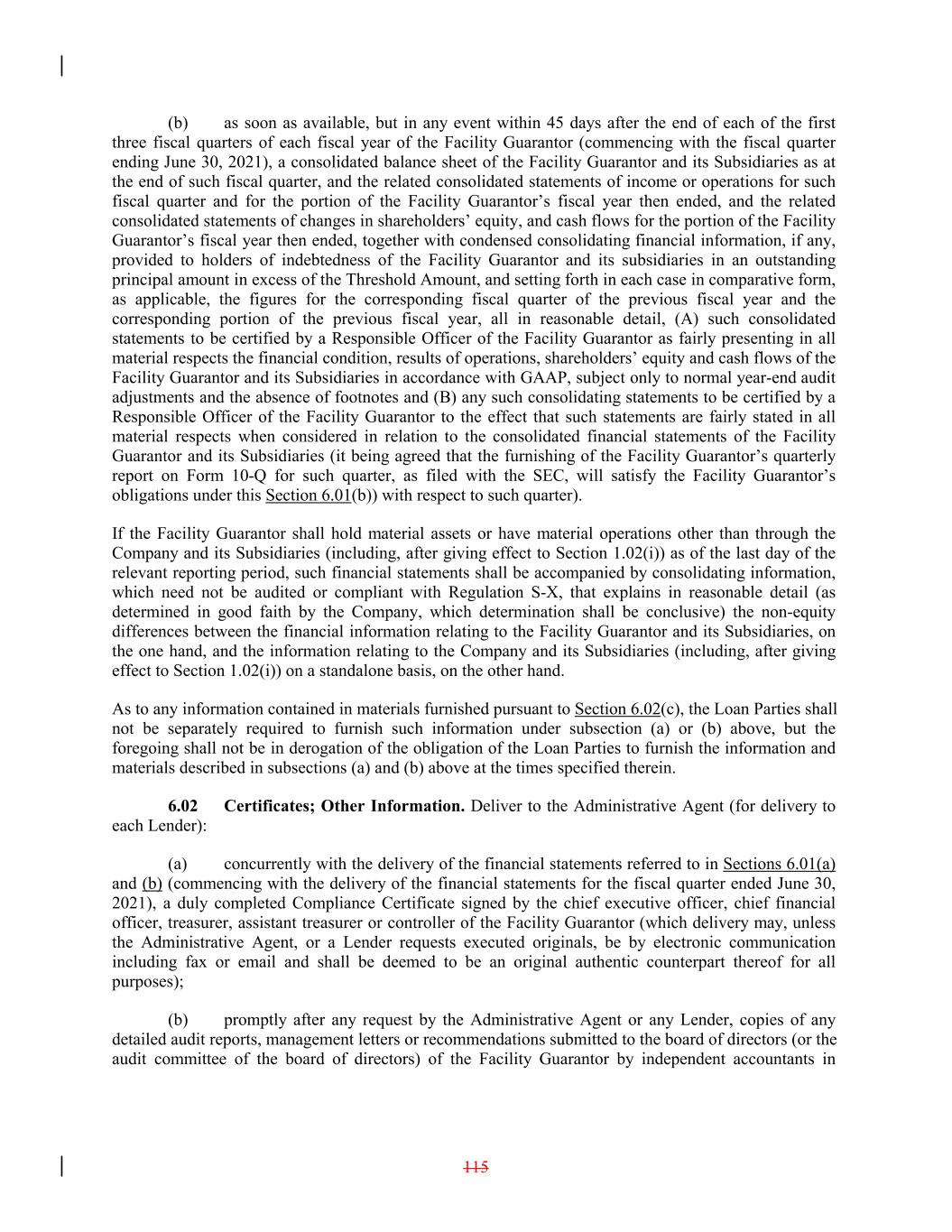(b) as soon as available, but in any event within 45 days after the end of each of the first three fiscal quarters of each fiscal year of the Facility Guarantor (commencing with the fiscal quarter ending June 30, 2021), a consolidated balance sheet of the Facility Guarantor and its Subsidiaries as at the end of such fiscal quarter, and the related consolidated statements of income or operations for such fiscal quarter and for the portion of the Facility Guarantor’s fiscal year then ended, and the related consolidated statements of changes in shareholders’ equity, and cash flows for the portion of the Facility Guarantor’s fiscal year then ended, together with condensed consolidating financial information, if any, provided to holders of indebtedness of the Facility Guarantor and its subsidiaries in an outstanding principal amount in excess of the Threshold Amount, and setting forth in each case in comparative form, as applicable, the figures for the corresponding fiscal quarter of the previous fiscal year and the corresponding portion of the previous fiscal year, all in reasonable detail, (A) such consolidated statements to be certified by a Responsible Officer of the Facility Guarantor as fairly presenting in all material respects the financial condition, results of operations, shareholders’ equity and cash flows of the Facility Guarantor and its Subsidiaries in accordance with GAAP, subject only to normal year-end audit adjustments and the absence of footnotes and (B) any such consolidating statements to be certified by a Responsible Officer of the Facility Guarantor to the effect that such statements are fairly stated in all material respects when considered in relation to the consolidated financial statements of the Facility Guarantor and its Subsidiaries (it being agreed that the furnishing of the Facility Guarantor’s quarterly report on Form 10-Q for such quarter, as filed with the SEC, will satisfy the Facility Guarantor’s obligations under this Section 6.01(b)) with respect to such quarter). If the Facility Guarantor shall hold material assets or have material operations other than through the Company and its Subsidiaries (including, after giving effect to Section 1.02(i)) as of the last day of the relevant reporting period, such financial statements shall be accompanied by consolidating information, which need not be audited or compliant with Regulation S-X, that explains in reasonable detail (as determined in good faith by the Company, which determination shall be conclusive) the non-equity differences between the financial information relating to the Facility Guarantor and its Subsidiaries, on the one hand, and the information relating to the Company and its Subsidiaries (including, after giving effect to Section 1.02(i)) on a standalone basis, on the other hand. As to any information contained in materials furnished pursuant to Section 6.02(c), the Loan Parties shall not be separately required to furnish such information under subsection (a) or (b) above, but the foregoing shall not be in derogation of the obligation of the Loan Parties to furnish the information and materials described in subsections (a) and (b) above at the times specified therein. 6.02 Certificates; Other Information. Deliver to the Administrative Agent (for delivery to each Lender): (a) concurrently with the delivery of the financial statements referred to in Sections 6.01(a) and (b) (commencing with the delivery of the financial statements for the fiscal quarter ended June 30, 2021), a duly completed Compliance Certificate signed by the chief executive officer, chief financial officer, treasurer, assistant treasurer or controller of the Facility Guarantor (which delivery may, unless the Administrative Agent, or a Lender requests executed originals, be by electronic communication including fax or email and shall be deemed to be an original authentic counterpart thereof for all purposes); (b) promptly after any request by the Administrative Agent or any Lender, copies of any detailed audit reports, management letters or recommendations submitted to the board of directors (or the audit committee of the board of directors) of the Facility Guarantor by independent accountants in 115