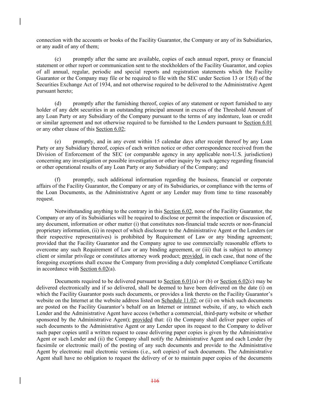 connection with the accounts or books of the Facility Guarantor, the Company or any of its Subsidiaries, or any audit of any of them; (c) promptly after the same are available, copies of each annual report, proxy or financial statement or other report or communication sent to the stockholders of the Facility Guarantor, and copies of all annual, regular, periodic and special reports and registration statements which the Facility Guarantor or the Company may file or be required to file with the SEC under Section 13 or 15(d) of the Securities Exchange Act of 1934, and not otherwise required to be delivered to the Administrative Agent pursuant hereto; (d) promptly after the furnishing thereof, copies of any statement or report furnished to any holder of any debt securities in an outstanding principal amount in excess of the Threshold Amount of any Loan Party or any Subsidiary of the Company pursuant to the terms of any indenture, loan or credit or similar agreement and not otherwise required to be furnished to the Lenders pursuant to Section 6.01 or any other clause of this Section 6.02; (e) promptly, and in any event within 15 calendar days after receipt thereof by any Loan Party or any Subsidiary thereof, copies of each written notice or other correspondence received from the Division of Enforcement of the SEC (or comparable agency in any applicable non-U.S. jurisdiction) concerning any investigation or possible investigation or other inquiry by such agency regarding financial or other operational results of any Loan Party or any Subsidiary of the Company; and (f) promptly, such additional information regarding the business, financial or corporate affairs of the Facility Guarantor, the Company or any of its Subsidiaries, or compliance with the terms of the Loan Documents, as the Administrative Agent or any Lender may from time to time reasonably request. Notwithstanding anything to the contrary in this Section 6.02, none of the Facility Guarantor, the Company or any of its Subsidiaries will be required to disclose or permit the inspection or discussion of, any document, information or other matter (i) that constitutes non-financial trade secrets or non-financial proprietary information, (ii) in respect of which disclosure to the Administrative Agent or the Lenders (or their respective representatives) is prohibited by Requirement of Law or any binding agreement; provided that the Facility Guarantor and the Company agree to use commercially reasonable efforts to overcome any such Requirement of Law or any binding agreement, or (iii) that is subject to attorney client or similar privilege or constitutes attorney work product; provided, in each case, that none of the foregoing exceptions shall excuse the Company from providing a duly completed Compliance Certificate in accordance with Section 6.02(a). Documents required to be delivered pursuant to Section 6.01(a) or (b) or Section 6.02(c) may be delivered electronically and if so delivered, shall be deemed to have been delivered on the date (i) on which the Facility Guarantor posts such documents, or provides a link thereto on the Facility Guarantor’s website on the Internet at the website address listed on Schedule 11.02; or (ii) on which such documents are posted on the Facility Guarantor’s behalf on an Internet or intranet website, if any, to which each Lender and the Administrative Agent have access (whether a commercial, third-party website or whether sponsored by the Administrative Agent); provided that: (i) the Company shall deliver paper copies of such documents to the Administrative Agent or any Lender upon its request to the Company to deliver such paper copies until a written request to cease delivering paper copies is given by the Administrative Agent or such Lender and (ii) the Company shall notify the Administrative Agent and each Lender (by facsimile or electronic mail) of the posting of any such documents and provide to the Administrative Agent by electronic mail electronic versions (i.e., soft copies) of such documents. The Administrative Agent shall have no obligation to request the delivery of or to maintain paper copies of the documents 116