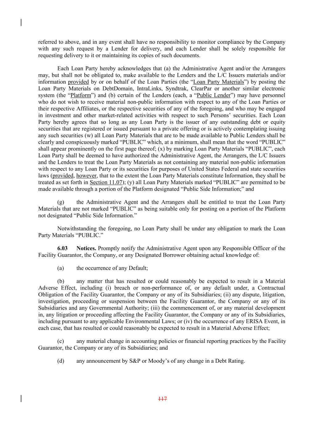 referred to above, and in any event shall have no responsibility to monitor compliance by the Company with any such request by a Lender for delivery, and each Lender shall be solely responsible for requesting delivery to it or maintaining its copies of such documents. Each Loan Party hereby acknowledges that (a) the Administrative Agent and/or the Arrangers may, but shall not be obligated to, make available to the Lenders and the L/C Issuers materials and/or information provided by or on behalf of the Loan Parties (the “Loan Party Materials”) by posting the Loan Party Materials on DebtDomain, IntraLinks, Syndtrak, ClearPar or another similar electronic system (the “Platform”) and (b) certain of the Lenders (each, a “Public Lender”) may have personnel who do not wish to receive material non-public information with respect to any of the Loan Parties or their respective Affiliates, or the respective securities of any of the foregoing, and who may be engaged in investment and other market-related activities with respect to such Persons’ securities. Each Loan Party hereby agrees that so long as any Loan Party is the issuer of any outstanding debt or equity securities that are registered or issued pursuant to a private offering or is actively contemplating issuing any such securities (w) all Loan Party Materials that are to be made available to Public Lenders shall be clearly and conspicuously marked “PUBLIC” which, at a minimum, shall mean that the word “PUBLIC” shall appear prominently on the first page thereof; (x) by marking Loan Party Materials “PUBLIC”, each Loan Party shall be deemed to have authorized the Administrative Agent, the Arrangers, the L/C Issuers and the Lenders to treat the Loan Party Materials as not containing any material non-public information with respect to any Loan Party or its securities for purposes of United States Federal and state securities laws (provided, however, that to the extent the Loan Party Materials constitute Information, they shall be treated as set forth in Section 11.07); (y) all Loan Party Materials marked “PUBLIC” are permitted to be made available through a portion of the Platform designated “Public Side Information;” and (g) the Administrative Agent and the Arrangers shall be entitled to treat the Loan Party Materials that are not marked “PUBLIC” as being suitable only for posting on a portion of the Platform not designated “Public Side Information.” Notwithstanding the foregoing, no Loan Party shall be under any obligation to mark the Loan Party Materials “PUBLIC.” 6.03 Notices. Promptly notify the Administrative Agent upon any Responsible Officer of the Facility Guarantor, the Company, or any Designated Borrower obtaining actual knowledge of: (a) the occurrence of any Default; (b) any matter that has resulted or could reasonably be expected to result in a Material Adverse Effect, including (i) breach or non-performance of, or any default under, a Contractual Obligation of the Facility Guarantor, the Company or any of its Subsidiaries; (ii) any dispute, litigation, investigation, proceeding or suspension between the Facility Guarantor, the Company or any of its Subsidiaries and any Governmental Authority; (iii) the commencement of, or any material development in, any litigation or proceeding affecting the Facility Guarantor, the Company or any of its Subsidiaries, including pursuant to any applicable Environmental Laws; or (iv) the occurrence of any ERISA Event, in each case, that has resulted or could reasonably be expected to result in a Material Adverse Effect; (c) any material change in accounting policies or financial reporting practices by the Facility Guarantor, the Company or any of its Subsidiaries; and (d) any announcement by S&P or Moody’s of any change in a Debt Rating. 117