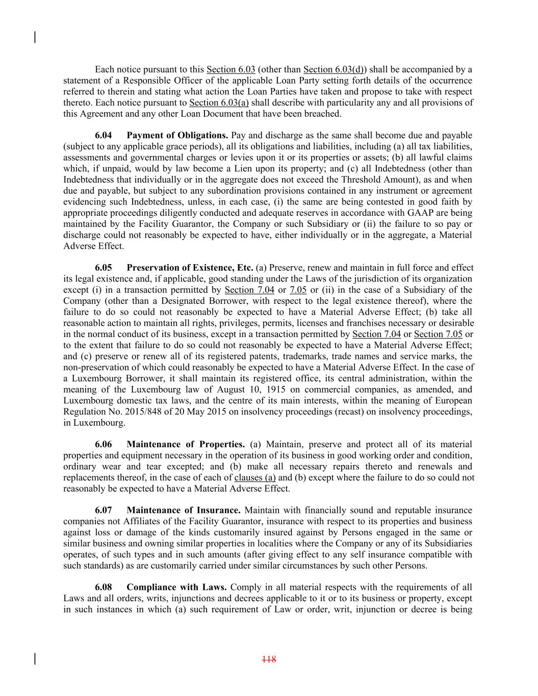 Each notice pursuant to this Section 6.03 (other than Section 6.03(d)) shall be accompanied by a statement of a Responsible Officer of the applicable Loan Party setting forth details of the occurrence referred to therein and stating what action the Loan Parties have taken and propose to take with respect thereto. Each notice pursuant to Section 6.03(a) shall describe with particularity any and all provisions of this Agreement and any other Loan Document that have been breached. 6.04 Payment of Obligations. Pay and discharge as the same shall become due and payable (subject to any applicable grace periods), all its obligations and liabilities, including (a) all tax liabilities, assessments and governmental charges or levies upon it or its properties or assets; (b) all lawful claims which, if unpaid, would by law become a Lien upon its property; and (c) all Indebtedness (other than Indebtedness that individually or in the aggregate does not exceed the Threshold Amount), as and when due and payable, but subject to any subordination provisions contained in any instrument or agreement evidencing such Indebtedness, unless, in each case, (i) the same are being contested in good faith by appropriate proceedings diligently conducted and adequate reserves in accordance with GAAP are being maintained by the Facility Guarantor, the Company or such Subsidiary or (ii) the failure to so pay or discharge could not reasonably be expected to have, either individually or in the aggregate, a Material Adverse Effect. 6.05 Preservation of Existence, Etc. (a) Preserve, renew and maintain in full force and effect its legal existence and, if applicable, good standing under the Laws of the jurisdiction of its organization except (i) in a transaction permitted by Section 7.04 or 7.05 or (ii) in the case of a Subsidiary of the Company (other than a Designated Borrower, with respect to the legal existence thereof), where the failure to do so could not reasonably be expected to have a Material Adverse Effect; (b) take all reasonable action to maintain all rights, privileges, permits, licenses and franchises necessary or desirable in the normal conduct of its business, except in a transaction permitted by Section 7.04 or Section 7.05 or to the extent that failure to do so could not reasonably be expected to have a Material Adverse Effect; and (c) preserve or renew all of its registered patents, trademarks, trade names and service marks, the non-preservation of which could reasonably be expected to have a Material Adverse Effect. In the case of a Luxembourg Borrower, it shall maintain its registered office, its central administration, within the meaning of the Luxembourg law of August 10, 1915 on commercial companies, as amended, and Luxembourg domestic tax laws, and the centre of its main interests, within the meaning of European Regulation No. 2015/848 of 20 May 2015 on insolvency proceedings (recast) on insolvency proceedings, in Luxembourg. 6.06 Maintenance of Properties. (a) Maintain, preserve and protect all of its material properties and equipment necessary in the operation of its business in good working order and condition, ordinary wear and tear excepted; and (b) make all necessary repairs thereto and renewals and replacements thereof, in the case of each of clauses (a) and (b) except where the failure to do so could not reasonably be expected to have a Material Adverse Effect. 6.07 Maintenance of Insurance. Maintain with financially sound and reputable insurance companies not Affiliates of the Facility Guarantor, insurance with respect to its properties and business against loss or damage of the kinds customarily insured against by Persons engaged in the same or similar business and owning similar properties in localities where the Company or any of its Subsidiaries operates, of such types and in such amounts (after giving effect to any self insurance compatible with such standards) as are customarily carried under similar circumstances by such other Persons. 6.08 Compliance with Laws. Comply in all material respects with the requirements of all Laws and all orders, writs, injunctions and decrees applicable to it or to its business or property, except in such instances in which (a) such requirement of Law or order, writ, injunction or decree is being 118