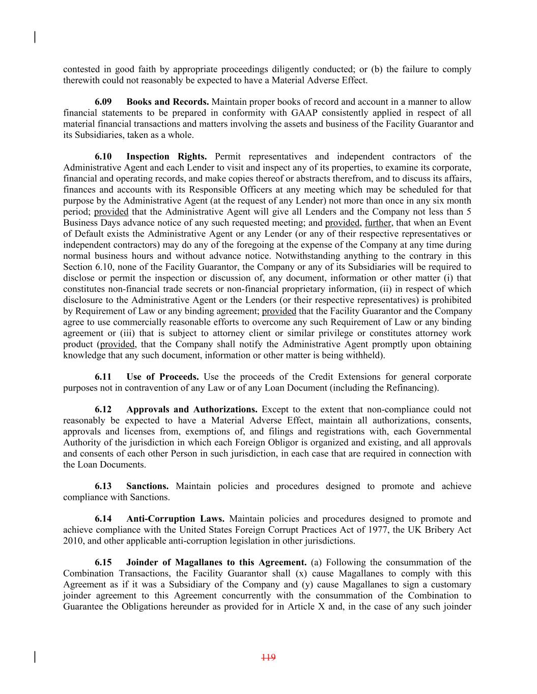 contested in good faith by appropriate proceedings diligently conducted; or (b) the failure to comply therewith could not reasonably be expected to have a Material Adverse Effect. 6.09 Books and Records. Maintain proper books of record and account in a manner to allow financial statements to be prepared in conformity with GAAP consistently applied in respect of all material financial transactions and matters involving the assets and business of the Facility Guarantor and its Subsidiaries, taken as a whole. 6.10 Inspection Rights. Permit representatives and independent contractors of the Administrative Agent and each Lender to visit and inspect any of its properties, to examine its corporate, financial and operating records, and make copies thereof or abstracts therefrom, and to discuss its affairs, finances and accounts with its Responsible Officers at any meeting which may be scheduled for that purpose by the Administrative Agent (at the request of any Lender) not more than once in any six month period; provided that the Administrative Agent will give all Lenders and the Company not less than 5 Business Days advance notice of any such requested meeting; and provided, further, that when an Event of Default exists the Administrative Agent or any Lender (or any of their respective representatives or independent contractors) may do any of the foregoing at the expense of the Company at any time during normal business hours and without advance notice. Notwithstanding anything to the contrary in this Section 6.10, none of the Facility Guarantor, the Company or any of its Subsidiaries will be required to disclose or permit the inspection or discussion of, any document, information or other matter (i) that constitutes non-financial trade secrets or non-financial proprietary information, (ii) in respect of which disclosure to the Administrative Agent or the Lenders (or their respective representatives) is prohibited by Requirement of Law or any binding agreement; provided that the Facility Guarantor and the Company agree to use commercially reasonable efforts to overcome any such Requirement of Law or any binding agreement or (iii) that is subject to attorney client or similar privilege or constitutes attorney work product (provided, that the Company shall notify the Administrative Agent promptly upon obtaining knowledge that any such document, information or other matter is being withheld). 6.11 Use of Proceeds. Use the proceeds of the Credit Extensions for general corporate purposes not in contravention of any Law or of any Loan Document (including the Refinancing). 6.12 Approvals and Authorizations. Except to the extent that non-compliance could not reasonably be expected to have a Material Adverse Effect, maintain all authorizations, consents, approvals and licenses from, exemptions of, and filings and registrations with, each Governmental Authority of the jurisdiction in which each Foreign Obligor is organized and existing, and all approvals and consents of each other Person in such jurisdiction, in each case that are required in connection with the Loan Documents. 6.13 Sanctions. Maintain policies and procedures designed to promote and achieve compliance with Sanctions. 6.14 Anti-Corruption Laws. Maintain policies and procedures designed to promote and achieve compliance with the United States Foreign Corrupt Practices Act of 1977, the UK Bribery Act 2010, and other applicable anti-corruption legislation in other jurisdictions. 6.15 Joinder of Magallanes to this Agreement. (a) Following the consummation of the Combination Transactions, the Facility Guarantor shall (x) cause Magallanes to comply with this Agreement as if it was a Subsidiary of the Company and (y) cause Magallanes to sign a customary joinder agreement to this Agreement concurrently with the consummation of the Combination to Guarantee the Obligations hereunder as provided for in Article X and, in the case of any such joinder 119