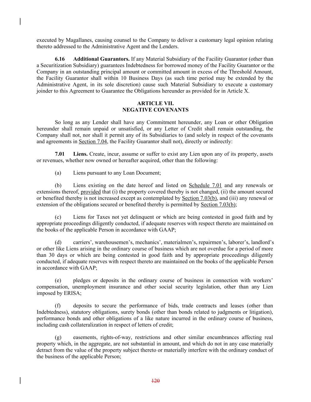 executed by Magallanes, causing counsel to the Company to deliver a customary legal opinion relating thereto addressed to the Administrative Agent and the Lenders. 6.16 Additional Guarantors. If any Material Subsidiary of the Facility Guarantor (other than a Securitization Subsidiary) guarantees Indebtedness for borrowed money of the Facility Guarantor or the Company in an outstanding principal amount or committed amount in excess of the Threshold Amount, the Facility Guarantor shall within 10 Business Days (as such time period may be extended by the Administrative Agent, in its sole discretion) cause such Material Subsidiary to execute a customary joinder to this Agreement to Guarantee the Obligations hereunder as provided for in Article X. ARTICLE VII. NEGATIVE COVENANTS So long as any Lender shall have any Commitment hereunder, any Loan or other Obligation hereunder shall remain unpaid or unsatisfied, or any Letter of Credit shall remain outstanding, the Company shall not, nor shall it permit any of its Subsidiaries to (and solely in respect of the covenants and agreements in Section 7.04, the Facility Guarantor shall not), directly or indirectly: 7.01 Liens. Create, incur, assume or suffer to exist any Lien upon any of its property, assets or revenues, whether now owned or hereafter acquired, other than the following: (a) Liens pursuant to any Loan Document; (b) Liens existing on the date hereof and listed on Schedule 7.01 and any renewals or extensions thereof, provided that (i) the property covered thereby is not changed, (ii) the amount secured or benefited thereby is not increased except as contemplated by Section 7.03(b), and (iii) any renewal or extension of the obligations secured or benefited thereby is permitted by Section 7.03(b); (c) Liens for Taxes not yet delinquent or which are being contested in good faith and by appropriate proceedings diligently conducted, if adequate reserves with respect thereto are maintained on the books of the applicable Person in accordance with GAAP; (d) carriers’, warehousemen’s, mechanics’, materialmen’s, repairmen’s, laborer’s, landlord’s or other like Liens arising in the ordinary course of business which are not overdue for a period of more than 30 days or which are being contested in good faith and by appropriate proceedings diligently conducted, if adequate reserves with respect thereto are maintained on the books of the applicable Person in accordance with GAAP; (e) pledges or deposits in the ordinary course of business in connection with workers’ compensation, unemployment insurance and other social security legislation, other than any Lien imposed by ERISA; (f) deposits to secure the performance of bids, trade contracts and leases (other than Indebtedness), statutory obligations, surety bonds (other than bonds related to judgments or litigation), performance bonds and other obligations of a like nature incurred in the ordinary course of business, including cash collateralization in respect of letters of credit; (g) easements, rights-of-way, restrictions and other similar encumbrances affecting real property which, in the aggregate, are not substantial in amount, and which do not in any case materially detract from the value of the property subject thereto or materially interfere with the ordinary conduct of the business of the applicable Person; 120