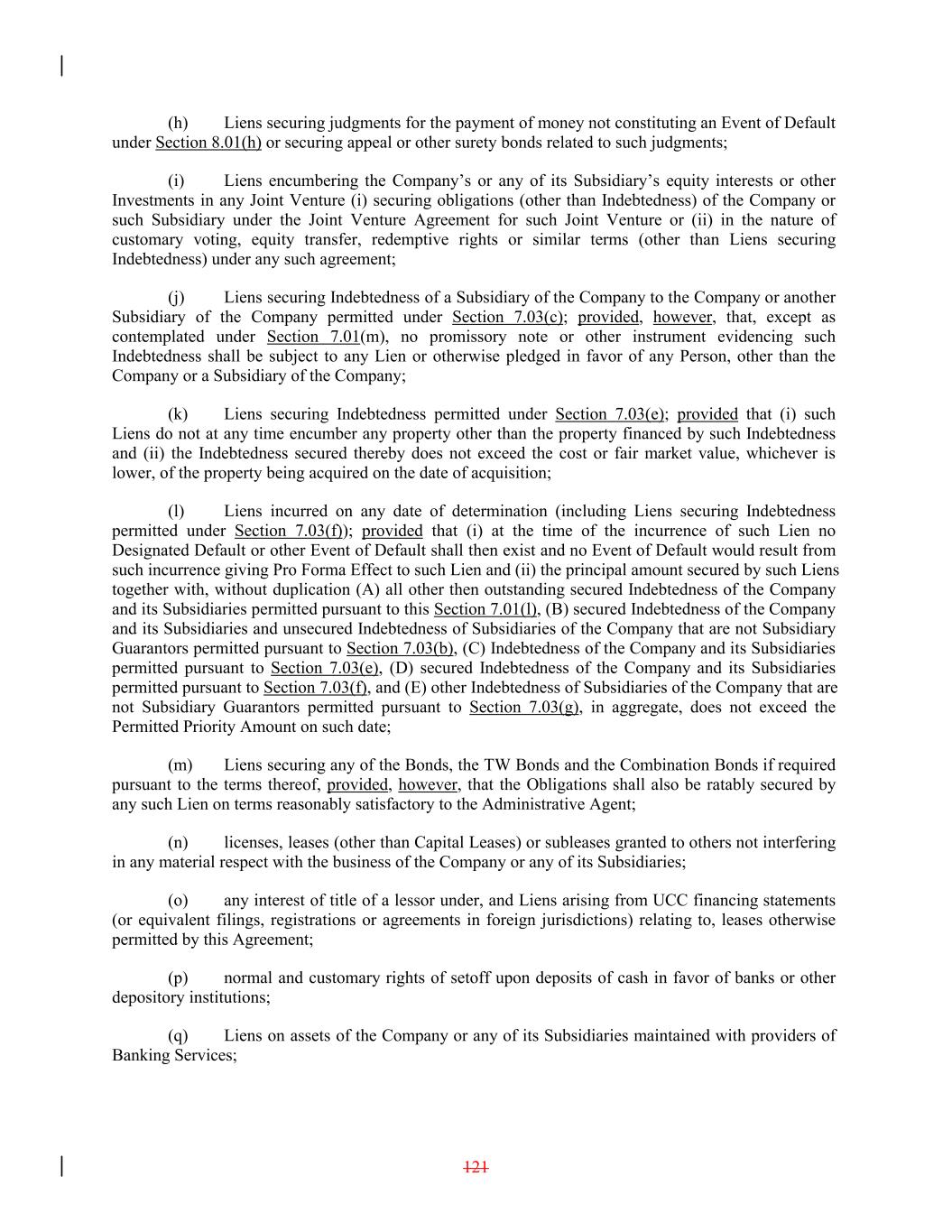 (h) Liens securing judgments for the payment of money not constituting an Event of Default under Section 8.01(h) or securing appeal or other surety bonds related to such judgments; (i) Liens encumbering the Company’s or any of its Subsidiary’s equity interests or other Investments in any Joint Venture (i) securing obligations (other than Indebtedness) of the Company or such Subsidiary under the Joint Venture Agreement for such Joint Venture or (ii) in the nature of customary voting, equity transfer, redemptive rights or similar terms (other than Liens securing Indebtedness) under any such agreement; (j) Liens securing Indebtedness of a Subsidiary of the Company to the Company or another Subsidiary of the Company permitted under Section 7.03(c); provided, however, that, except as contemplated under Section 7.01(m), no promissory note or other instrument evidencing such Indebtedness shall be subject to any Lien or otherwise pledged in favor of any Person, other than the Company or a Subsidiary of the Company; (k) Liens securing Indebtedness permitted under Section 7.03(e); provided that (i) such Liens do not at any time encumber any property other than the property financed by such Indebtedness and (ii) the Indebtedness secured thereby does not exceed the cost or fair market value, whichever is lower, of the property being acquired on the date of acquisition; (l) Liens incurred on any date of determination (including Liens securing Indebtedness permitted under Section 7.03(f)); provided that (i) at the time of the incurrence of such Lien no Designated Default or other Event of Default shall then exist and no Event of Default would result from such incurrence giving Pro Forma Effect to such Lien and (ii) the principal amount secured by such Liens together with, without duplication (A) all other then outstanding secured Indebtedness of the Company and its Subsidiaries permitted pursuant to this Section 7.01(l), (B) secured Indebtedness of the Company and its Subsidiaries and unsecured Indebtedness of Subsidiaries of the Company that are not Subsidiary Guarantors permitted pursuant to Section 7.03(b), (C) Indebtedness of the Company and its Subsidiaries permitted pursuant to Section 7.03(e), (D) secured Indebtedness of the Company and its Subsidiaries permitted pursuant to Section 7.03(f), and (E) other Indebtedness of Subsidiaries of the Company that are not Subsidiary Guarantors permitted pursuant to Section 7.03(g), in aggregate, does not exceed the Permitted Priority Amount on such date; (m) Liens securing any of the Bonds, the TW Bonds and the Combination Bonds if required pursuant to the terms thereof, provided, however, that the Obligations shall also be ratably secured by any such Lien on terms reasonably satisfactory to the Administrative Agent; (n) licenses, leases (other than Capital Leases) or subleases granted to others not interfering in any material respect with the business of the Company or any of its Subsidiaries; (o) any interest of title of a lessor under, and Liens arising from UCC financing statements (or equivalent filings, registrations or agreements in foreign jurisdictions) relating to, leases otherwise permitted by this Agreement; (p) normal and customary rights of setoff upon deposits of cash in favor of banks or other depository institutions; (q) Liens on assets of the Company or any of its Subsidiaries maintained with providers of Banking Services; 121