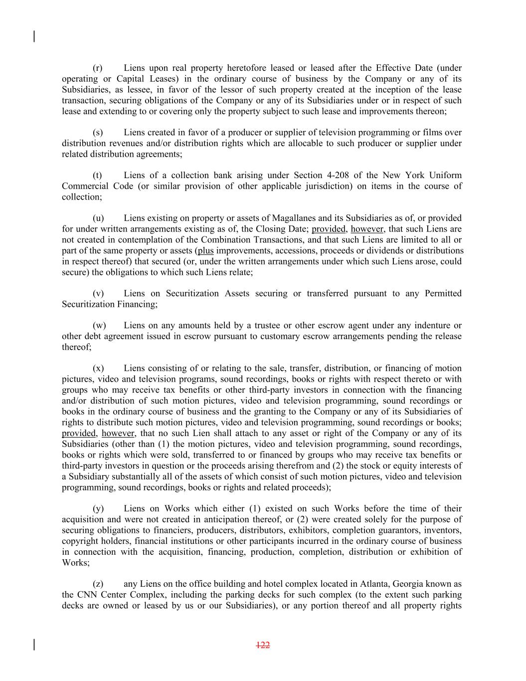 (r) Liens upon real property heretofore leased or leased after the Effective Date (under operating or Capital Leases) in the ordinary course of business by the Company or any of its Subsidiaries, as lessee, in favor of the lessor of such property created at the inception of the lease transaction, securing obligations of the Company or any of its Subsidiaries under or in respect of such lease and extending to or covering only the property subject to such lease and improvements thereon; (s) Liens created in favor of a producer or supplier of television programming or films over distribution revenues and/or distribution rights which are allocable to such producer or supplier under related distribution agreements; (t) Liens of a collection bank arising under Section 4-208 of the New York Uniform Commercial Code (or similar provision of other applicable jurisdiction) on items in the course of collection; (u) Liens existing on property or assets of Magallanes and its Subsidiaries as of, or provided for under written arrangements existing as of, the Closing Date; provided, however, that such Liens are not created in contemplation of the Combination Transactions, and that such Liens are limited to all or part of the same property or assets (plus improvements, accessions, proceeds or dividends or distributions in respect thereof) that secured (or, under the written arrangements under which such Liens arose, could secure) the obligations to which such Liens relate; (v) Liens on Securitization Assets securing or transferred pursuant to any Permitted Securitization Financing; (w) Liens on any amounts held by a trustee or other escrow agent under any indenture or other debt agreement issued in escrow pursuant to customary escrow arrangements pending the release thereof; (x) Liens consisting of or relating to the sale, transfer, distribution, or financing of motion pictures, video and television programs, sound recordings, books or rights with respect thereto or with groups who may receive tax benefits or other third-party investors in connection with the financing and/or distribution of such motion pictures, video and television programming, sound recordings or books in the ordinary course of business and the granting to the Company or any of its Subsidiaries of rights to distribute such motion pictures, video and television programming, sound recordings or books; provided, however, that no such Lien shall attach to any asset or right of the Company or any of its Subsidiaries (other than (1) the motion pictures, video and television programming, sound recordings, books or rights which were sold, transferred to or financed by groups who may receive tax benefits or third-party investors in question or the proceeds arising therefrom and (2) the stock or equity interests of a Subsidiary substantially all of the assets of which consist of such motion pictures, video and television programming, sound recordings, books or rights and related proceeds); (y) Liens on Works which either (1) existed on such Works before the time of their acquisition and were not created in anticipation thereof, or (2) were created solely for the purpose of securing obligations to financiers, producers, distributors, exhibitors, completion guarantors, inventors, copyright holders, financial institutions or other participants incurred in the ordinary course of business in connection with the acquisition, financing, production, completion, distribution or exhibition of Works; (z) any Liens on the office building and hotel complex located in Atlanta, Georgia known as the CNN Center Complex, including the parking decks for such complex (to the extent such parking decks are owned or leased by us or our Subsidiaries), or any portion thereof and all property rights 122