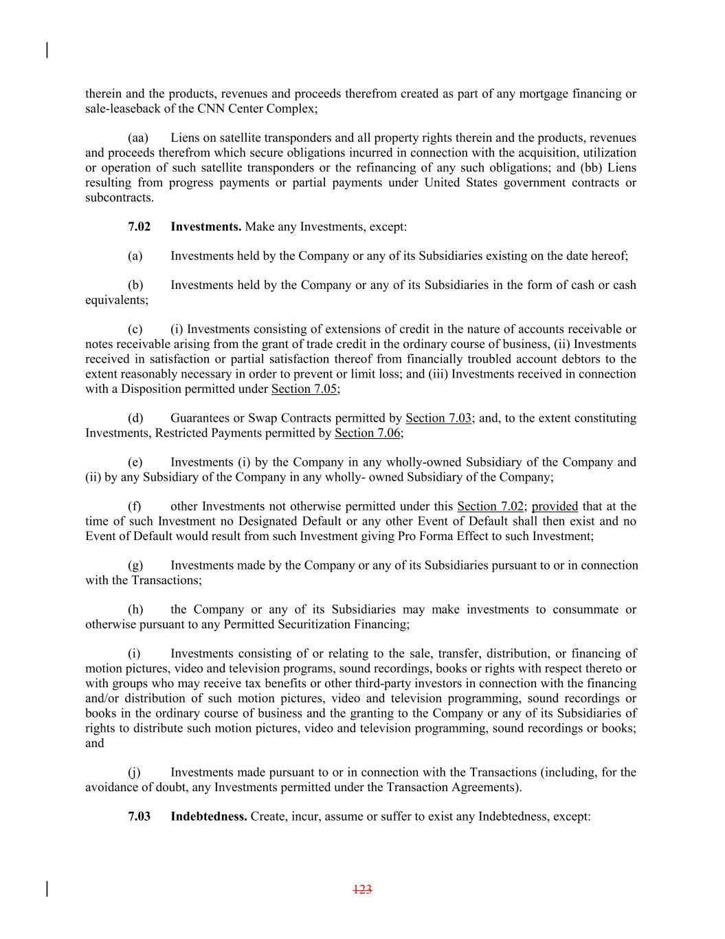 therein and the products, revenues and proceeds therefrom created as part of any mortgage financing or sale-leaseback of the CNN Center Complex; (aa) Liens on satellite transponders and all property rights therein and the products, revenues and proceeds therefrom which secure obligations incurred in connection with the acquisition, utilization or operation of such satellite transponders or the refinancing of any such obligations; and (bb) Liens resulting from progress payments or partial payments under United States government contracts or subcontracts. 7.02 Investments. Make any Investments, except: (a) Investments held by the Company or any of its Subsidiaries existing on the date hereof; (b) Investments held by the Company or any of its Subsidiaries in the form of cash or cash equivalents; (c) (i) Investments consisting of extensions of credit in the nature of accounts receivable or notes receivable arising from the grant of trade credit in the ordinary course of business, (ii) Investments received in satisfaction or partial satisfaction thereof from financially troubled account debtors to the extent reasonably necessary in order to prevent or limit loss; and (iii) Investments received in connection with a Disposition permitted under Section 7.05; (d) Guarantees or Swap Contracts permitted by Section 7.03; and, to the extent constituting Investments, Restricted Payments permitted by Section 7.06; (e) Investments (i) by the Company in any wholly-owned Subsidiary of the Company and (ii) by any Subsidiary of the Company in any wholly- owned Subsidiary of the Company; (f) other Investments not otherwise permitted under this Section 7.02; provided that at the time of such Investment no Designated Default or any other Event of Default shall then exist and no Event of Default would result from such Investment giving Pro Forma Effect to such Investment; (g) Investments made by the Company or any of its Subsidiaries pursuant to or in connection with the Transactions; (h) the Company or any of its Subsidiaries may make investments to consummate or otherwise pursuant to any Permitted Securitization Financing; (i) Investments consisting of or relating to the sale, transfer, distribution, or financing of motion pictures, video and television programs, sound recordings, books or rights with respect thereto or with groups who may receive tax benefits or other third-party investors in connection with the financing and/or distribution of such motion pictures, video and television programming, sound recordings or books in the ordinary course of business and the granting to the Company or any of its Subsidiaries of rights to distribute such motion pictures, video and television programming, sound recordings or books; and (j) Investments made pursuant to or in connection with the Transactions (including, for the avoidance of doubt, any Investments permitted under the Transaction Agreements). 7.03 Indebtedness. Create, incur, assume or suffer to exist any Indebtedness, except: 123