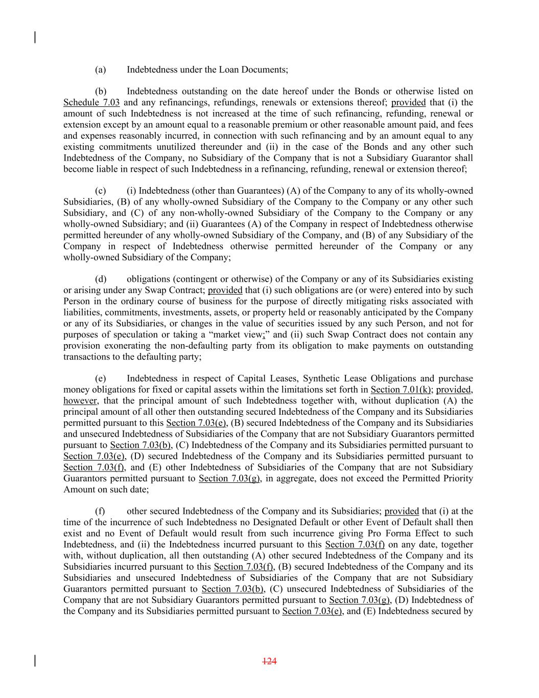 (a) Indebtedness under the Loan Documents; (b) Indebtedness outstanding on the date hereof under the Bonds or otherwise listed on Schedule 7.03 and any refinancings, refundings, renewals or extensions thereof; provided that (i) the amount of such Indebtedness is not increased at the time of such refinancing, refunding, renewal or extension except by an amount equal to a reasonable premium or other reasonable amount paid, and fees and expenses reasonably incurred, in connection with such refinancing and by an amount equal to any existing commitments unutilized thereunder and (ii) in the case of the Bonds and any other such Indebtedness of the Company, no Subsidiary of the Company that is not a Subsidiary Guarantor shall become liable in respect of such Indebtedness in a refinancing, refunding, renewal or extension thereof; (c) (i) Indebtedness (other than Guarantees) (A) of the Company to any of its wholly-owned Subsidiaries, (B) of any wholly-owned Subsidiary of the Company to the Company or any other such Subsidiary, and (C) of any non-wholly-owned Subsidiary of the Company to the Company or any wholly-owned Subsidiary; and (ii) Guarantees (A) of the Company in respect of Indebtedness otherwise permitted hereunder of any wholly-owned Subsidiary of the Company, and (B) of any Subsidiary of the Company in respect of Indebtedness otherwise permitted hereunder of the Company or any wholly-owned Subsidiary of the Company; (d) obligations (contingent or otherwise) of the Company or any of its Subsidiaries existing or arising under any Swap Contract; provided that (i) such obligations are (or were) entered into by such Person in the ordinary course of business for the purpose of directly mitigating risks associated with liabilities, commitments, investments, assets, or property held or reasonably anticipated by the Company or any of its Subsidiaries, or changes in the value of securities issued by any such Person, and not for purposes of speculation or taking a “market view;” and (ii) such Swap Contract does not contain any provision exonerating the non-defaulting party from its obligation to make payments on outstanding transactions to the defaulting party; (e) Indebtedness in respect of Capital Leases, Synthetic Lease Obligations and purchase money obligations for fixed or capital assets within the limitations set forth in Section 7.01(k); provided, however, that the principal amount of such Indebtedness together with, without duplication (A) the principal amount of all other then outstanding secured Indebtedness of the Company and its Subsidiaries permitted pursuant to this Section 7.03(e), (B) secured Indebtedness of the Company and its Subsidiaries and unsecured Indebtedness of Subsidiaries of the Company that are not Subsidiary Guarantors permitted pursuant to Section 7.03(b), (C) Indebtedness of the Company and its Subsidiaries permitted pursuant to Section 7.03(e), (D) secured Indebtedness of the Company and its Subsidiaries permitted pursuant to Section 7.03(f), and (E) other Indebtedness of Subsidiaries of the Company that are not Subsidiary Guarantors permitted pursuant to Section 7.03(g), in aggregate, does not exceed the Permitted Priority Amount on such date; (f) other secured Indebtedness of the Company and its Subsidiaries; provided that (i) at the time of the incurrence of such Indebtedness no Designated Default or other Event of Default shall then exist and no Event of Default would result from such incurrence giving Pro Forma Effect to such Indebtedness, and (ii) the Indebtedness incurred pursuant to this Section 7.03(f) on any date, together with, without duplication, all then outstanding (A) other secured Indebtedness of the Company and its Subsidiaries incurred pursuant to this Section 7.03(f), (B) secured Indebtedness of the Company and its Subsidiaries and unsecured Indebtedness of Subsidiaries of the Company that are not Subsidiary Guarantors permitted pursuant to Section 7.03(b), (C) unsecured Indebtedness of Subsidiaries of the Company that are not Subsidiary Guarantors permitted pursuant to Section 7.03(g), (D) Indebtedness of the Company and its Subsidiaries permitted pursuant to Section 7.03(e), and (E) Indebtedness secured by 124