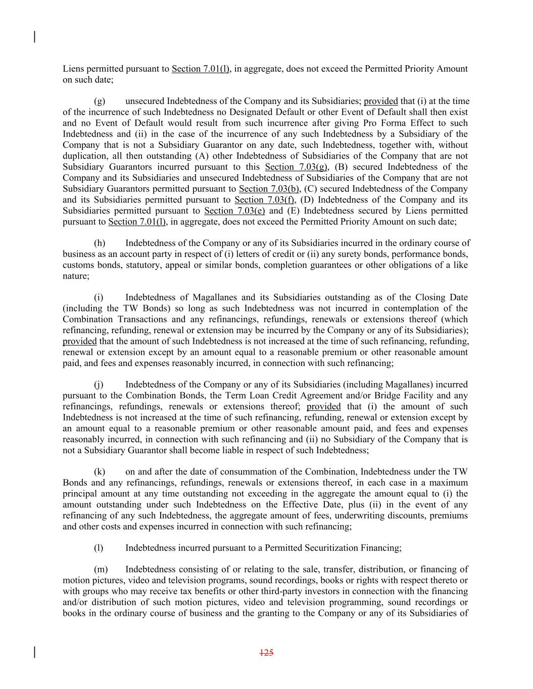 Liens permitted pursuant to Section 7.01(l), in aggregate, does not exceed the Permitted Priority Amount on such date; (g) unsecured Indebtedness of the Company and its Subsidiaries; provided that (i) at the time of the incurrence of such Indebtedness no Designated Default or other Event of Default shall then exist and no Event of Default would result from such incurrence after giving Pro Forma Effect to such Indebtedness and (ii) in the case of the incurrence of any such Indebtedness by a Subsidiary of the Company that is not a Subsidiary Guarantor on any date, such Indebtedness, together with, without duplication, all then outstanding (A) other Indebtedness of Subsidiaries of the Company that are not Subsidiary Guarantors incurred pursuant to this Section 7.03(g), (B) secured Indebtedness of the Company and its Subsidiaries and unsecured Indebtedness of Subsidiaries of the Company that are not Subsidiary Guarantors permitted pursuant to Section 7.03(b), (C) secured Indebtedness of the Company and its Subsidiaries permitted pursuant to Section 7.03(f), (D) Indebtedness of the Company and its Subsidiaries permitted pursuant to Section 7.03(e) and (E) Indebtedness secured by Liens permitted pursuant to Section 7.01(l), in aggregate, does not exceed the Permitted Priority Amount on such date; (h) Indebtedness of the Company or any of its Subsidiaries incurred in the ordinary course of business as an account party in respect of (i) letters of credit or (ii) any surety bonds, performance bonds, customs bonds, statutory, appeal or similar bonds, completion guarantees or other obligations of a like nature; (i) Indebtedness of Magallanes and its Subsidiaries outstanding as of the Closing Date (including the TW Bonds) so long as such Indebtedness was not incurred in contemplation of the Combination Transactions and any refinancings, refundings, renewals or extensions thereof (which refinancing, refunding, renewal or extension may be incurred by the Company or any of its Subsidiaries); provided that the amount of such Indebtedness is not increased at the time of such refinancing, refunding, renewal or extension except by an amount equal to a reasonable premium or other reasonable amount paid, and fees and expenses reasonably incurred, in connection with such refinancing; (j) Indebtedness of the Company or any of its Subsidiaries (including Magallanes) incurred pursuant to the Combination Bonds, the Term Loan Credit Agreement and/or Bridge Facility and any refinancings, refundings, renewals or extensions thereof; provided that (i) the amount of such Indebtedness is not increased at the time of such refinancing, refunding, renewal or extension except by an amount equal to a reasonable premium or other reasonable amount paid, and fees and expenses reasonably incurred, in connection with such refinancing and (ii) no Subsidiary of the Company that is not a Subsidiary Guarantor shall become liable in respect of such Indebtedness; (k) on and after the date of consummation of the Combination, Indebtedness under the TW Bonds and any refinancings, refundings, renewals or extensions thereof, in each case in a maximum principal amount at any time outstanding not exceeding in the aggregate the amount equal to (i) the amount outstanding under such Indebtedness on the Effective Date, plus (ii) in the event of any refinancing of any such Indebtedness, the aggregate amount of fees, underwriting discounts, premiums and other costs and expenses incurred in connection with such refinancing; (l) Indebtedness incurred pursuant to a Permitted Securitization Financing; (m) Indebtedness consisting of or relating to the sale, transfer, distribution, or financing of motion pictures, video and television programs, sound recordings, books or rights with respect thereto or with groups who may receive tax benefits or other third-party investors in connection with the financing and/or distribution of such motion pictures, video and television programming, sound recordings or books in the ordinary course of business and the granting to the Company or any of its Subsidiaries of 125