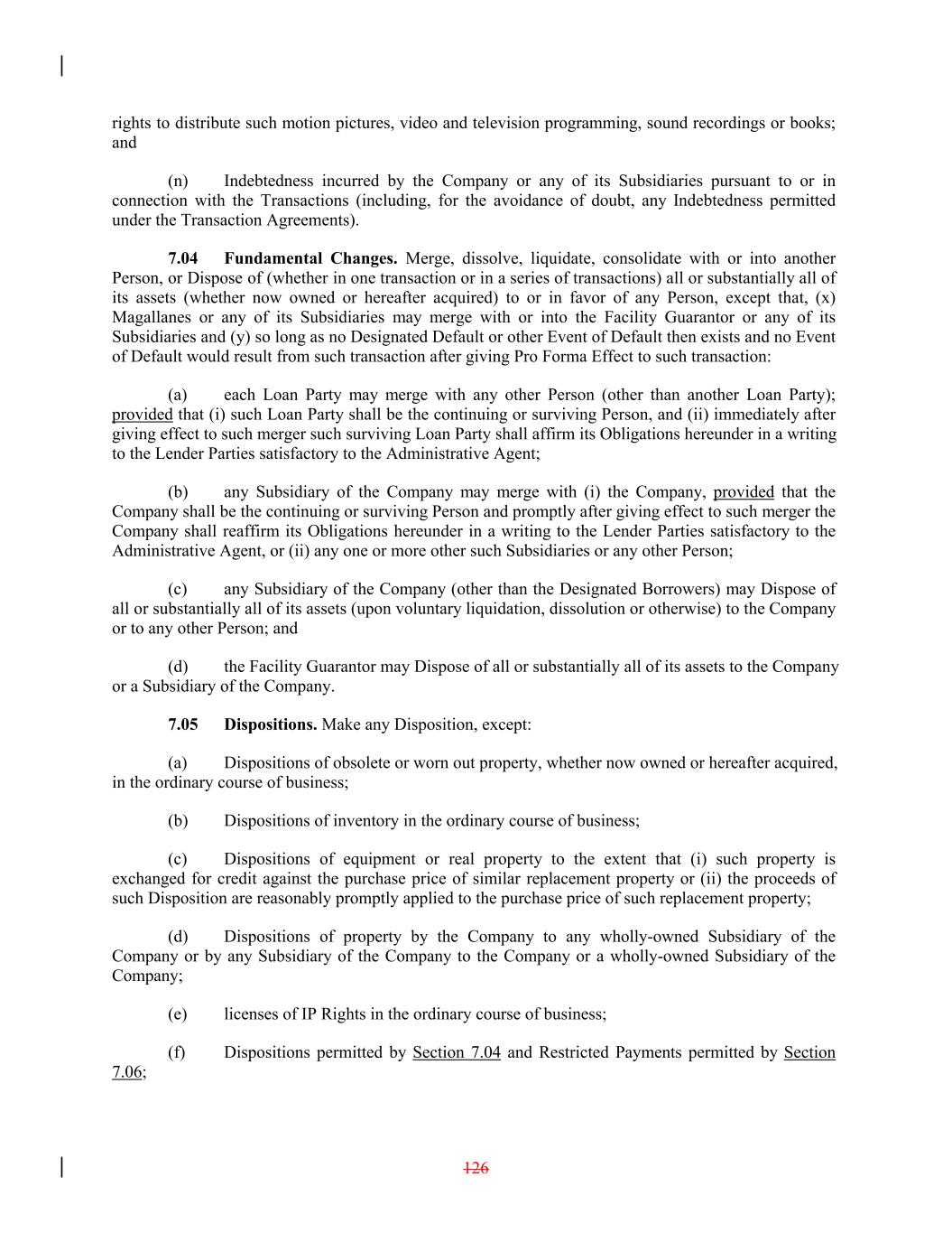 rights to distribute such motion pictures, video and television programming, sound recordings or books; and (n) Indebtedness incurred by the Company or any of its Subsidiaries pursuant to or in connection with the Transactions (including, for the avoidance of doubt, any Indebtedness permitted under the Transaction Agreements). 7.04 Fundamental Changes. Merge, dissolve, liquidate, consolidate with or into another Person, or Dispose of (whether in one transaction or in a series of transactions) all or substantially all of its assets (whether now owned or hereafter acquired) to or in favor of any Person, except that, (x) Magallanes or any of its Subsidiaries may merge with or into the Facility Guarantor or any of its Subsidiaries and (y) so long as no Designated Default or other Event of Default then exists and no Event of Default would result from such transaction after giving Pro Forma Effect to such transaction: (a) each Loan Party may merge with any other Person (other than another Loan Party); provided that (i) such Loan Party shall be the continuing or surviving Person, and (ii) immediately after giving effect to such merger such surviving Loan Party shall affirm its Obligations hereunder in a writing to the Lender Parties satisfactory to the Administrative Agent; (b) any Subsidiary of the Company may merge with (i) the Company, provided that the Company shall be the continuing or surviving Person and promptly after giving effect to such merger the Company shall reaffirm its Obligations hereunder in a writing to the Lender Parties satisfactory to the Administrative Agent, or (ii) any one or more other such Subsidiaries or any other Person; (c) any Subsidiary of the Company (other than the Designated Borrowers) may Dispose of all or substantially all of its assets (upon voluntary liquidation, dissolution or otherwise) to the Company or to any other Person; and (d) the Facility Guarantor may Dispose of all or substantially all of its assets to the Company or a Subsidiary of the Company. 7.05 Dispositions. Make any Disposition, except: (a) Dispositions of obsolete or worn out property, whether now owned or hereafter acquired, in the ordinary course of business; (b) Dispositions of inventory in the ordinary course of business; (c) Dispositions of equipment or real property to the extent that (i) such property is exchanged for credit against the purchase price of similar replacement property or (ii) the proceeds of such Disposition are reasonably promptly applied to the purchase price of such replacement property; (d) Dispositions of property by the Company to any wholly-owned Subsidiary of the Company or by any Subsidiary of the Company to the Company or a wholly-owned Subsidiary of the Company; (e) licenses of IP Rights in the ordinary course of business; (f) Dispositions permitted by Section 7.04 and Restricted Payments permitted by Section 7.06; 126